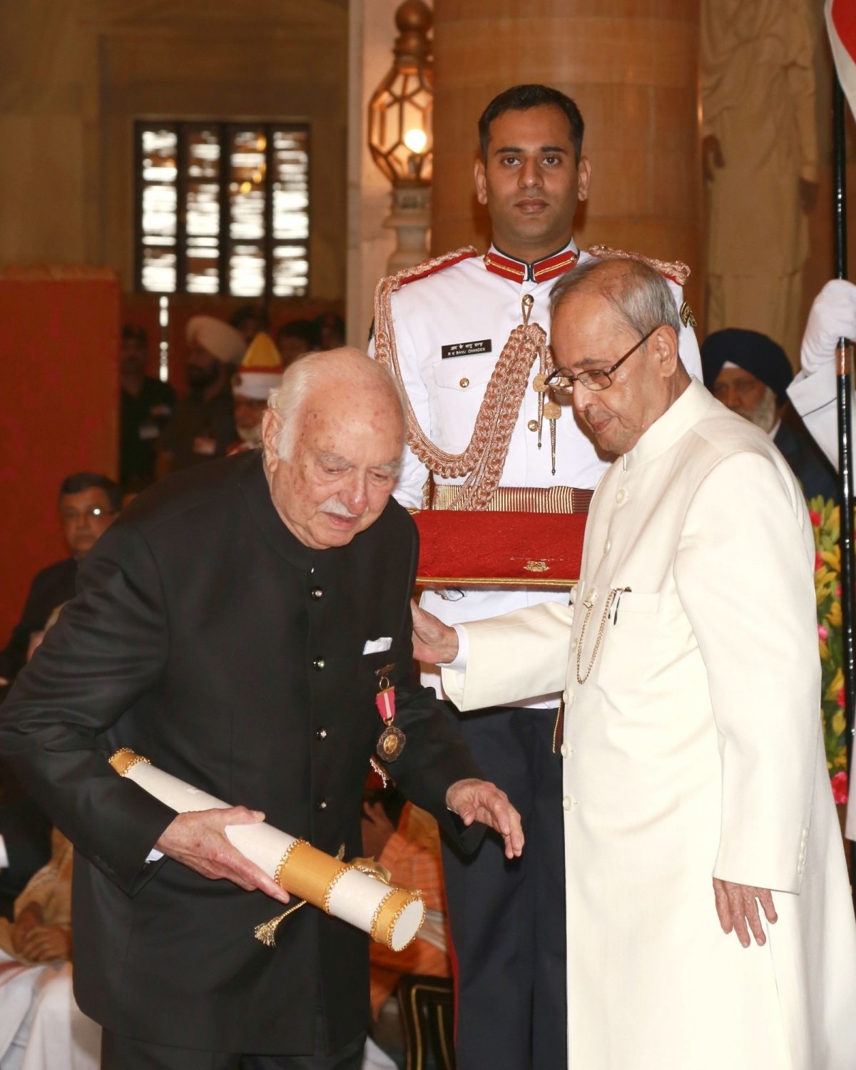 New Delhi: President Pranab Mukherjee presents the Padma Bhushan Award to architect Hafeez Sorabe Contractor at a Civil Investiture Ceremony organised at Rashtrapati Bhavan, in New Delhi on March 28, 2016. (Photo: Amlan Paliwal/IANS)