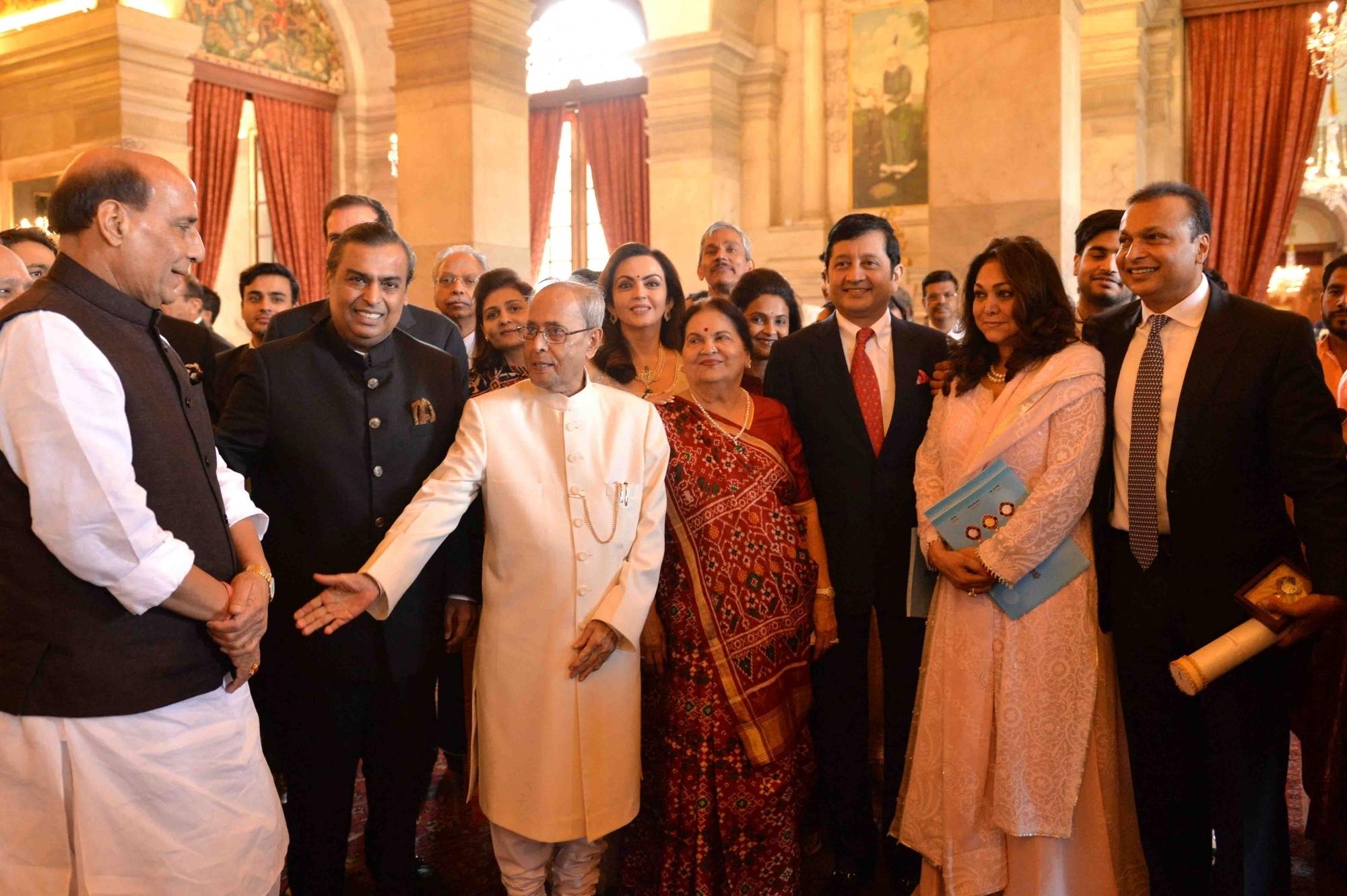 New Delhi: President Pranab Mukherjee with Union Home Minister Rajnath Singh, Kokilaben D. Ambani, Reliance Industries chairman Mukesh Ambani, Reliance Foundation chairperson Nita Ambani and Reliance ADAG chairman Anil Ambani with wife Tina Ambani at a Civil Investiture Ceremony, at Rashtrapati Bhavan, in New Delhi on March 28, 2016. (Photo: IANS/RB)
