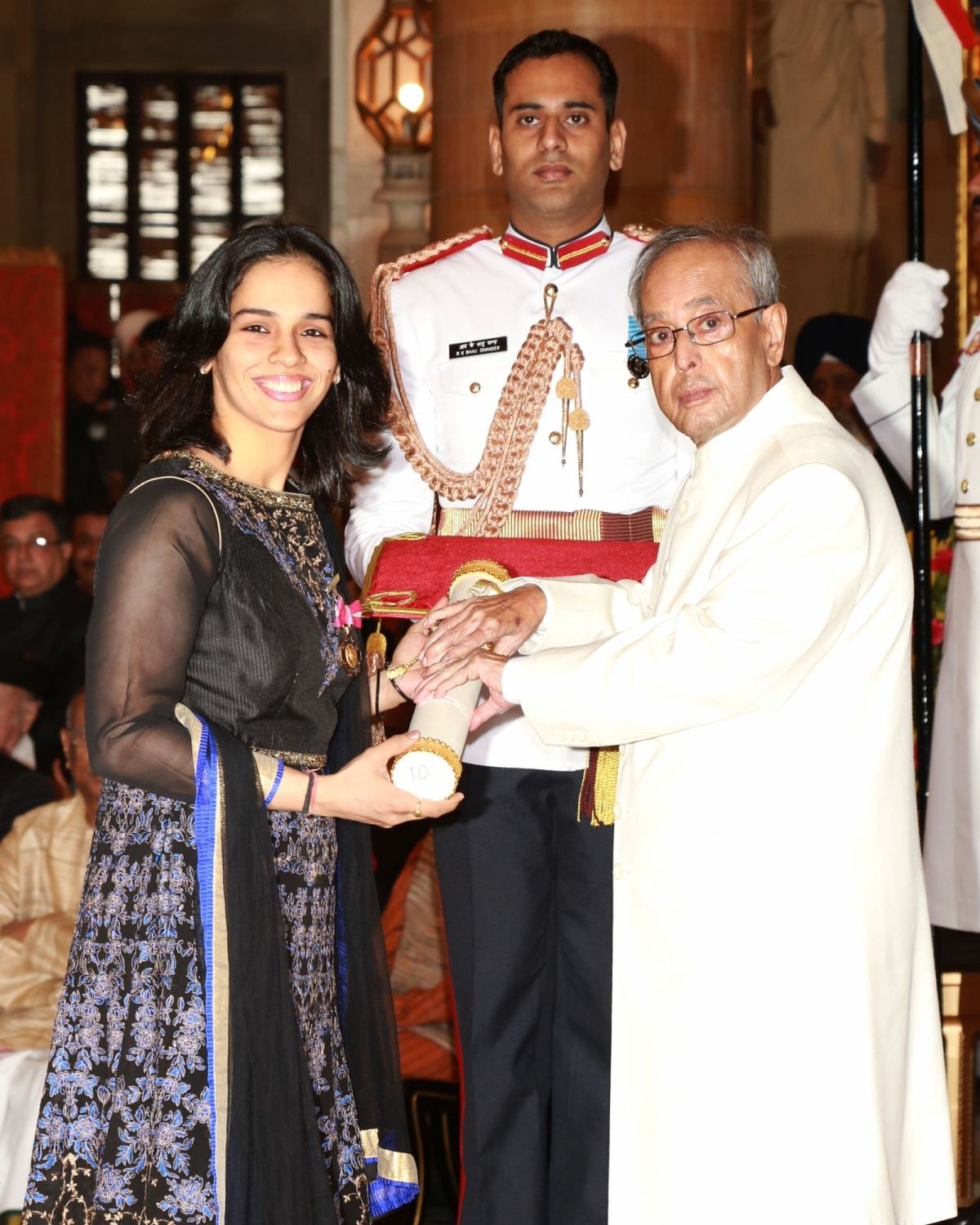 New Delhi: President Pranab Mukherjee presents the Padma Bhushan Award to Saina Nehwal, at a Civil Investiture Ceremony organised at Rashtrapati Bhavan, in New Delhi on March 28, 2016. (Photo: IANS/PIB)