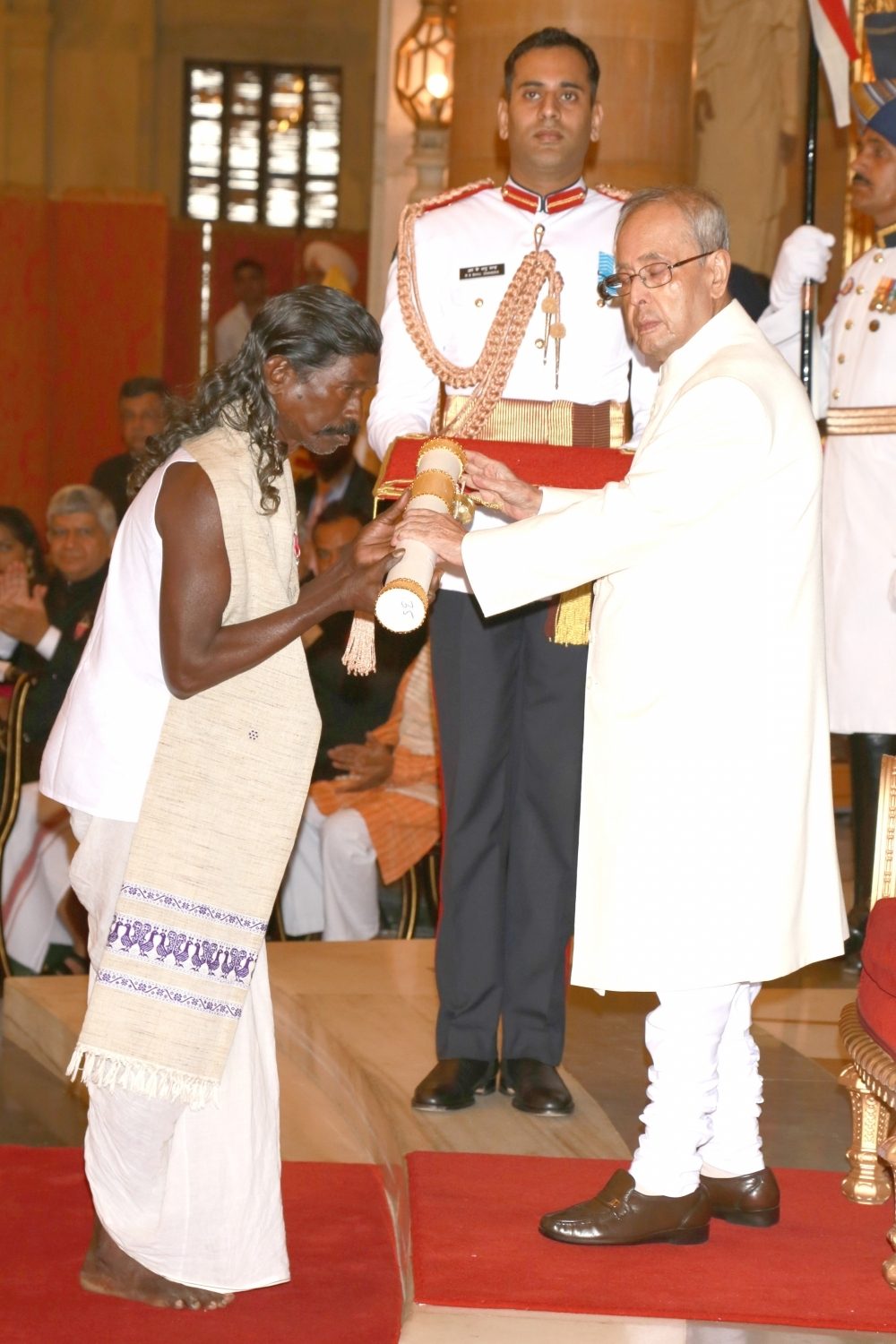 New Delhi: President Pranab Mukherjee presents the Padma Shri Award to poet and writer (Kosli language) Haladhar Nag, at a Civil Investiture Ceremony organised at Rashtrapati Bhavan, in New Delhi on March 28, 2016. (Photo: IANS/PIB)