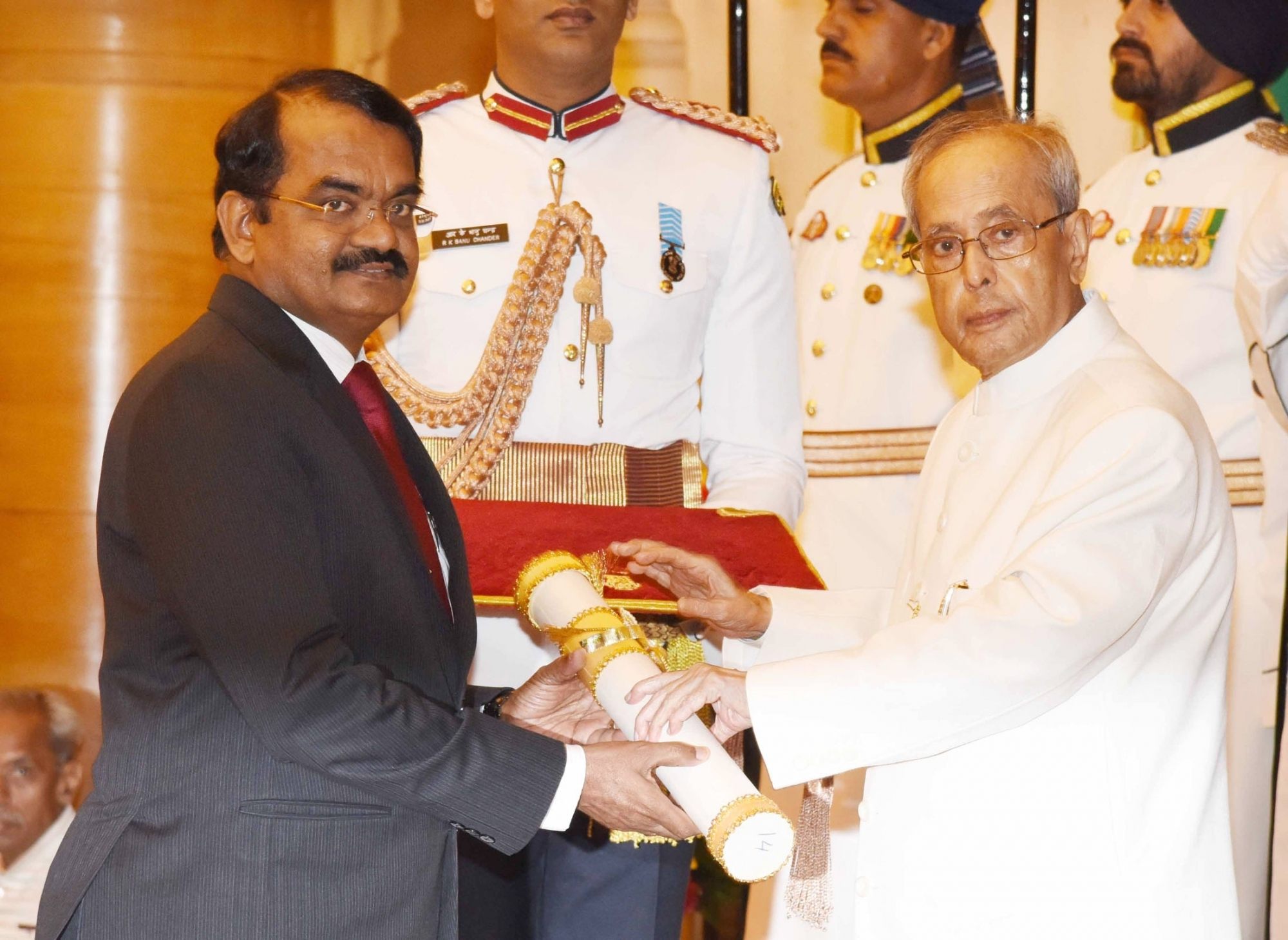 New Delhi: President Pranab Mukherjee presents the Padma Bhushan Award to scientist Dr. Alla Venkata Rama Rao, at a Civil Investiture Ceremony organised at Rashtrapati Bhavan, in New Delhi on March 28, 2016. (Photo: Amlan Paliwal/IANS)