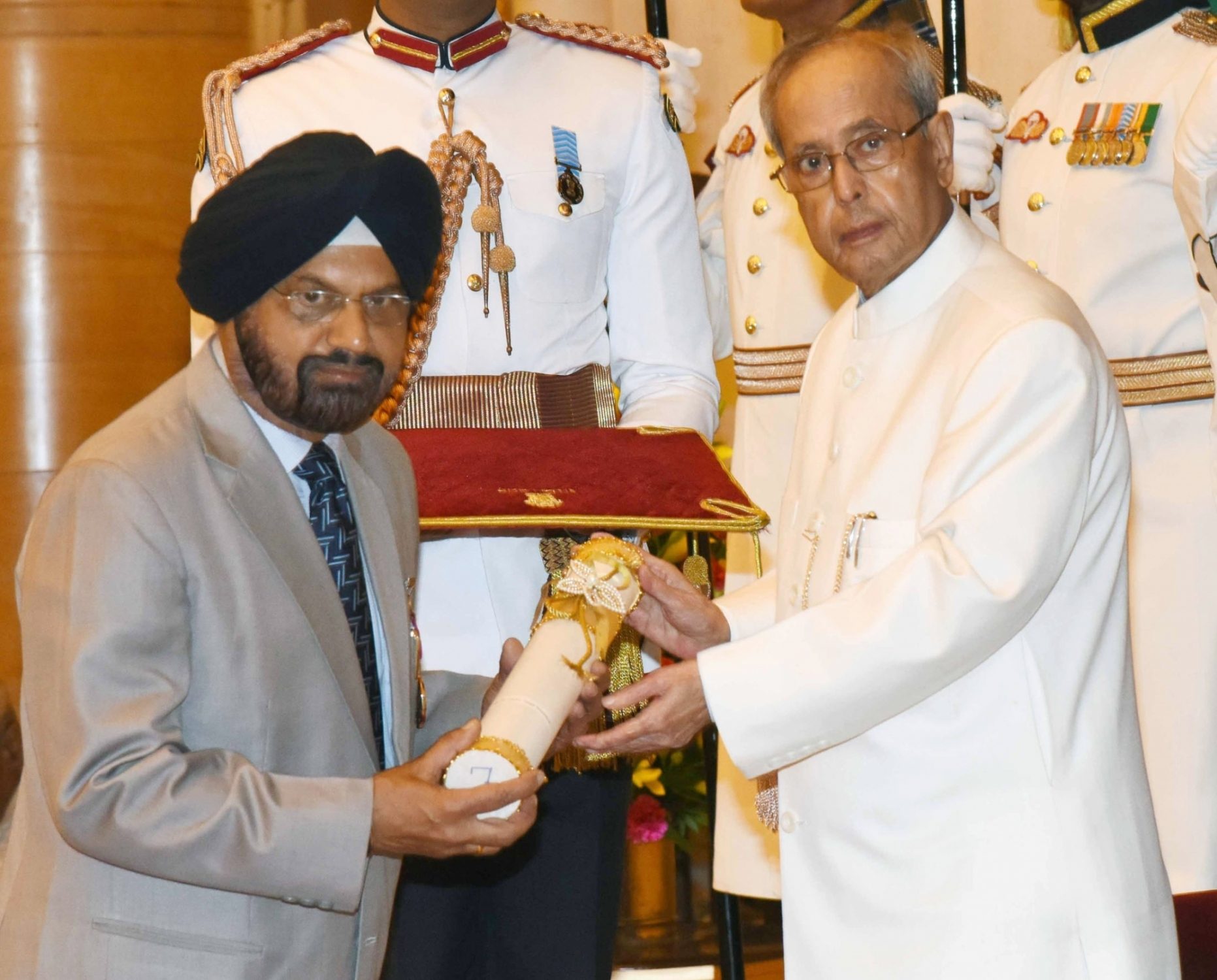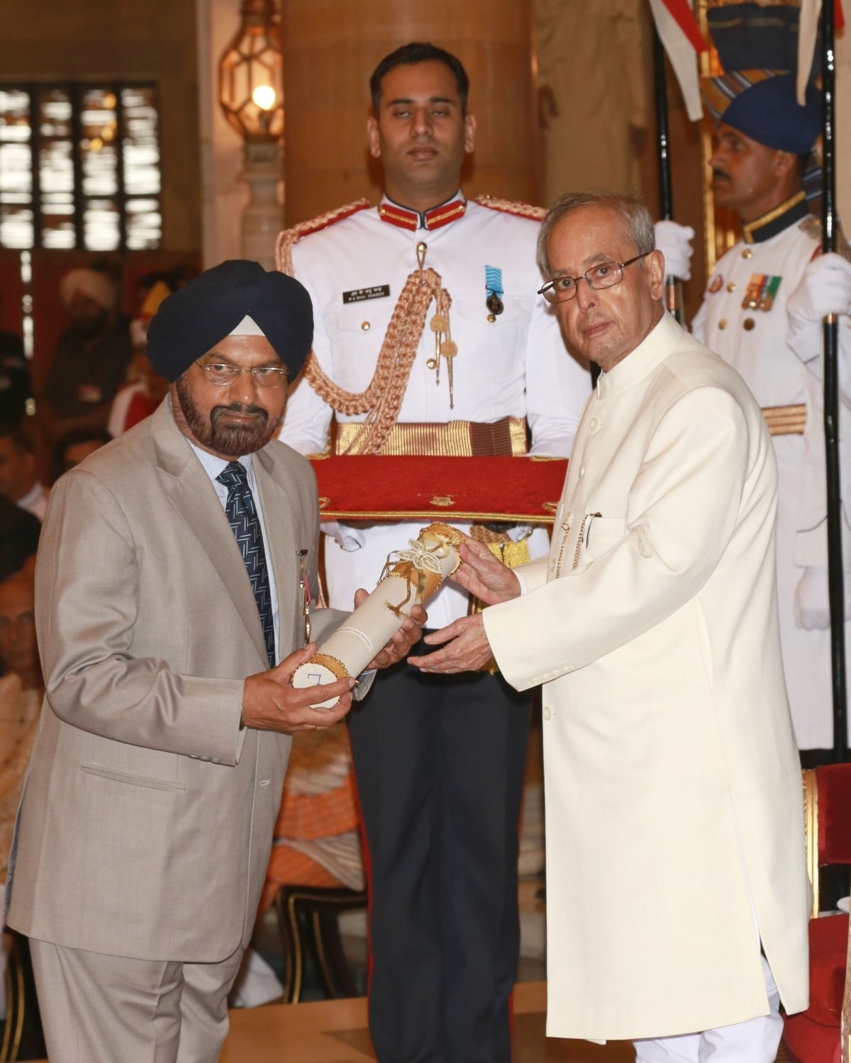 New Delhi: President Pranab Mukherjee presents the Padma Bhushan Award to journalist Dr.Barjinder Singh Hamdard, at a Civil Investiture Ceremony organised at Rashtrapati Bhavan, in New Delhi on March 28, 2016. (Photo: Amlan Paliwal/IANS)