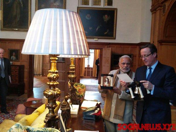 London, Nov 13 (IANS) Prime Minister Narendra Modi here on Friday presented his British counterpart David Cameron with specially handcrafted bookends made of wood, marble and silver.