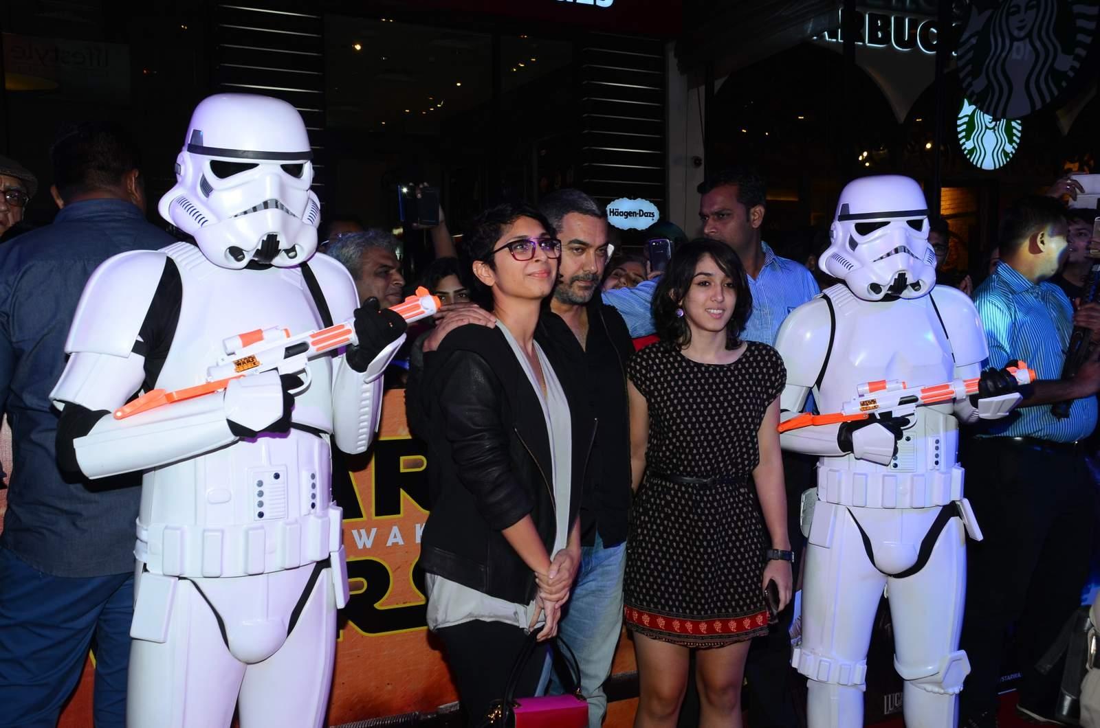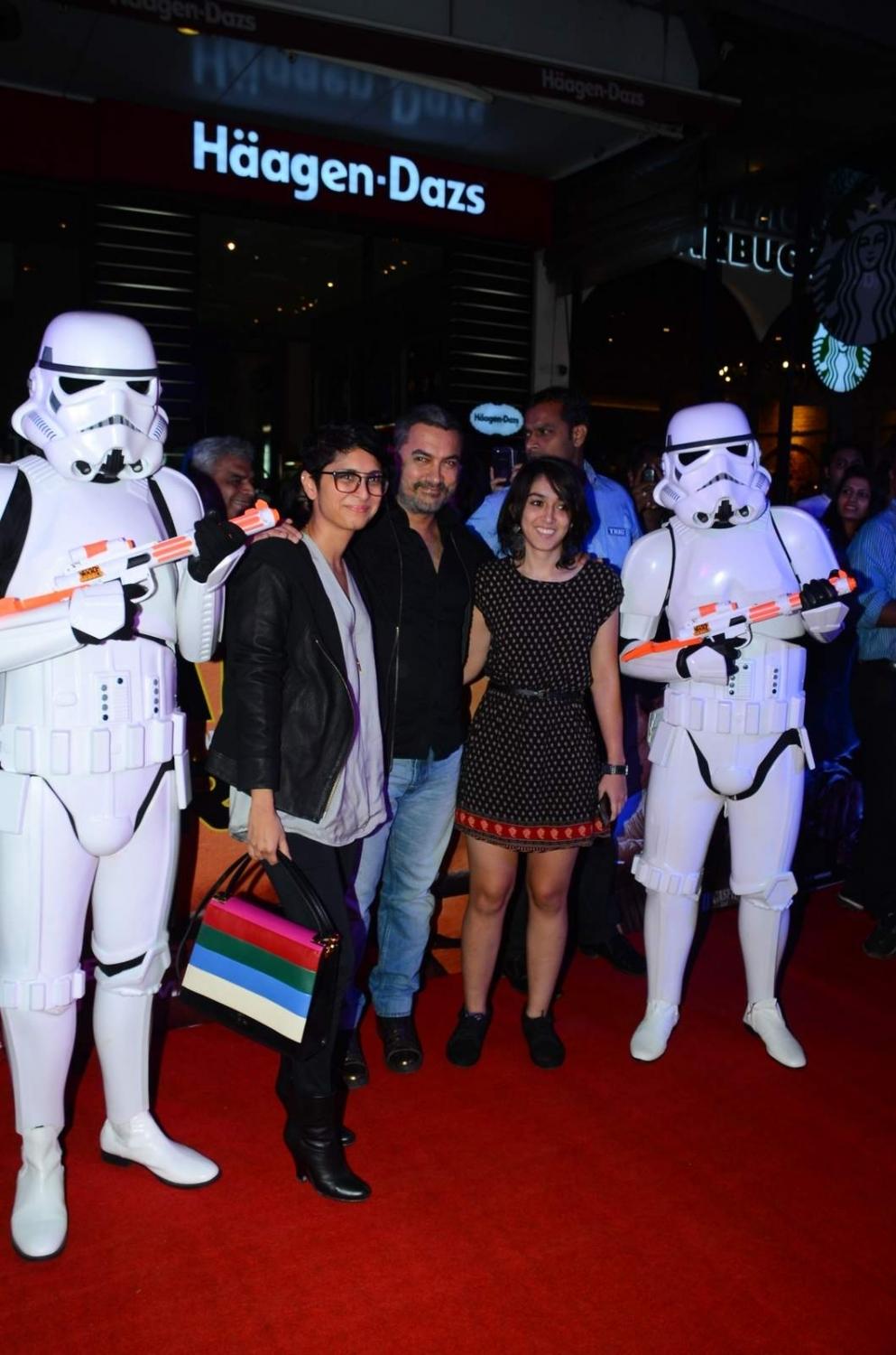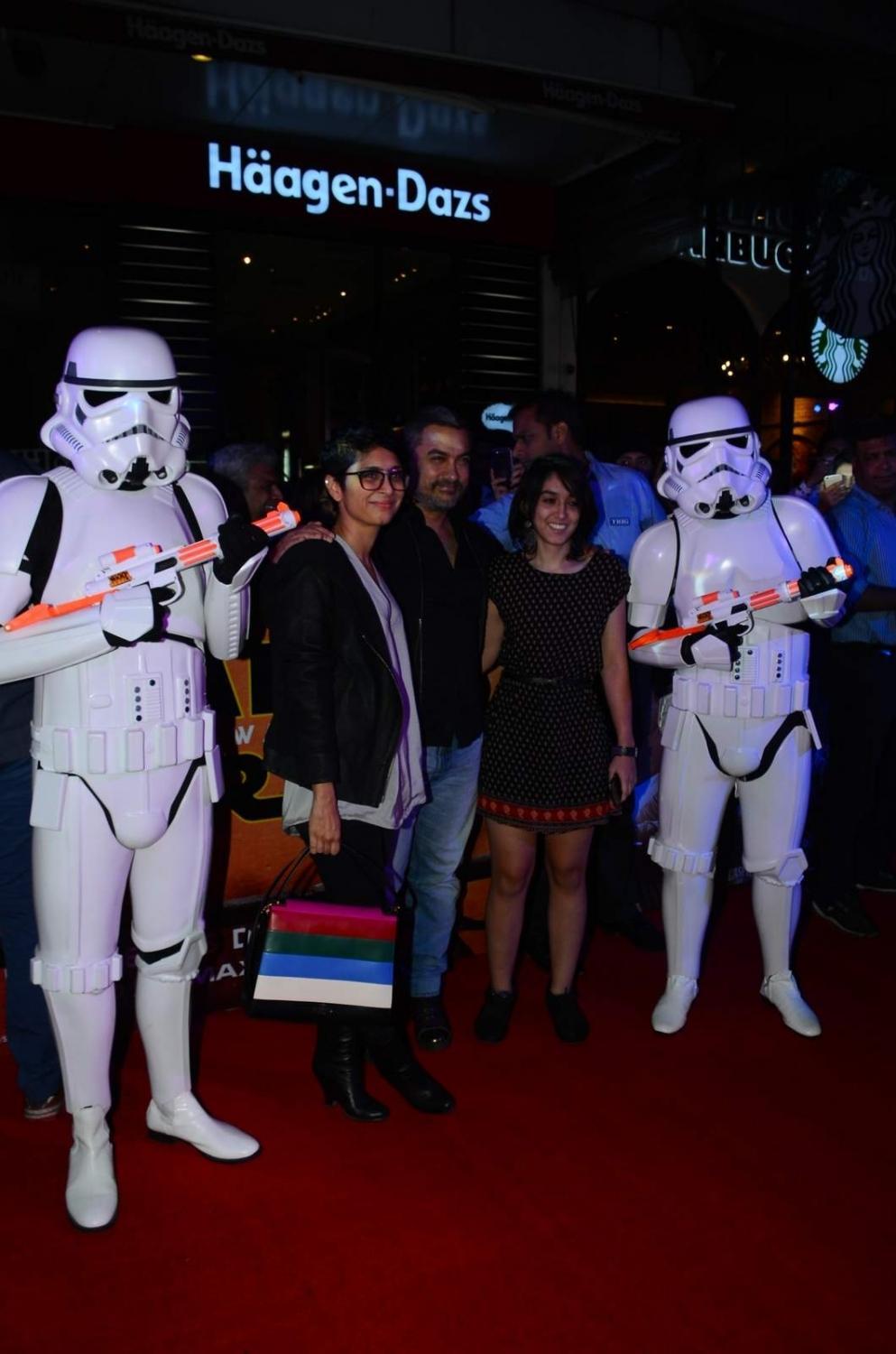 Mumbai: Actor Aamir Khan and his filmmaker wife Kiran Rao withh her daughter poses with a Stormtrooper during the premier of Disney’s Star Wars – The Force Awakens, in Mumbai on Dec 23, 2015. (Photo: IANS)