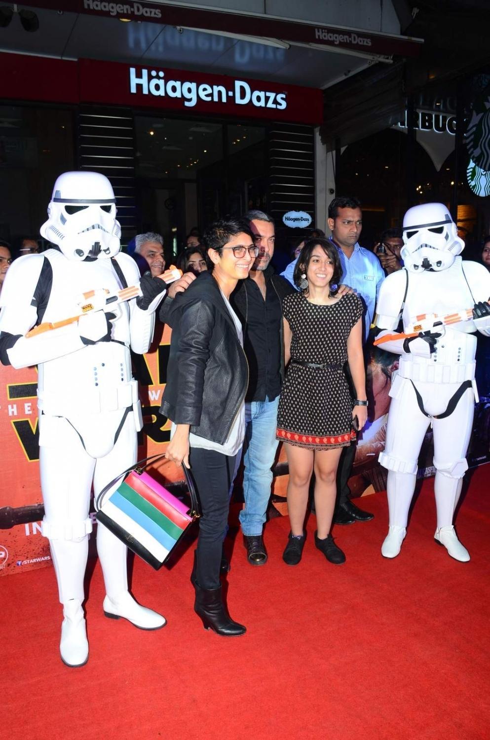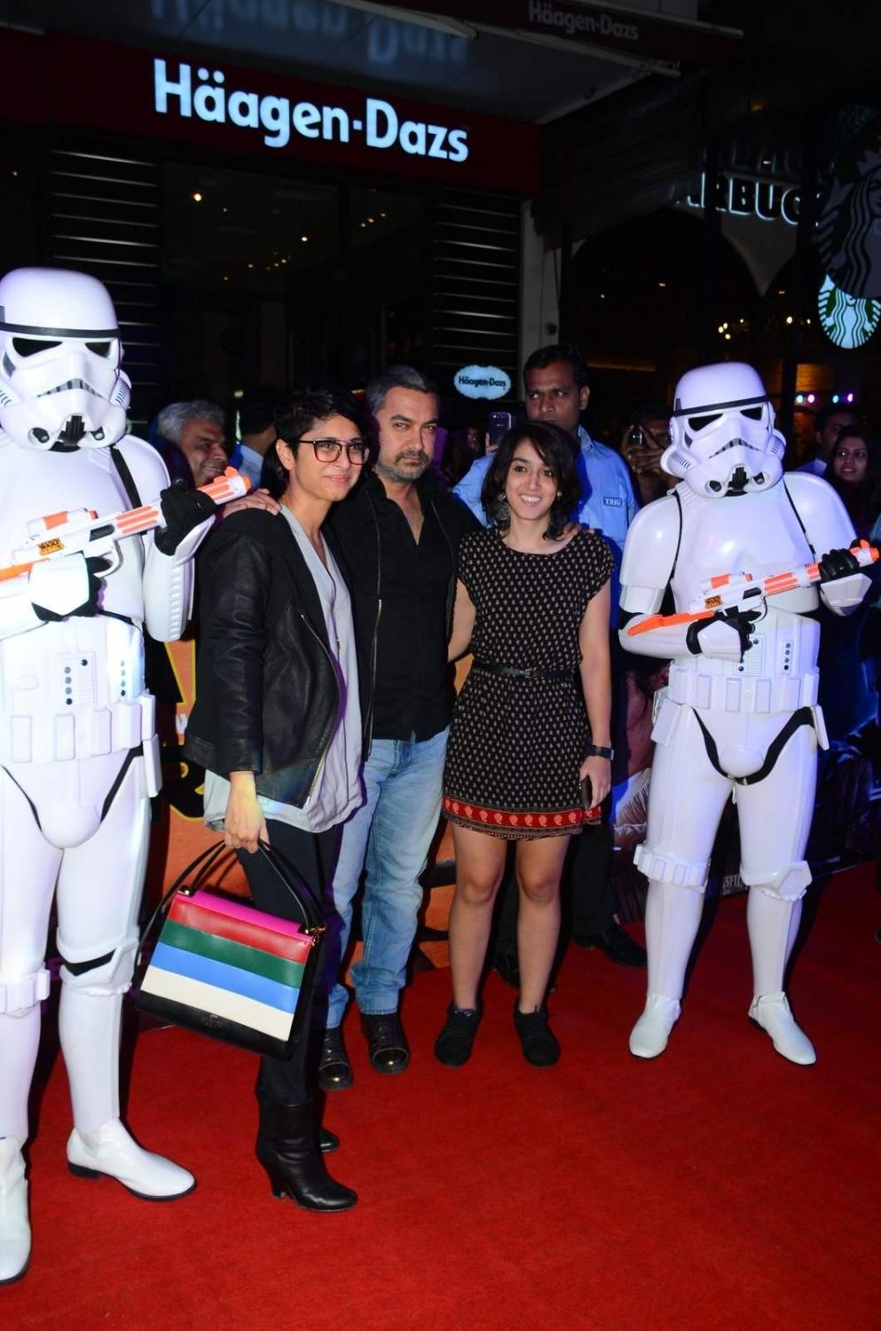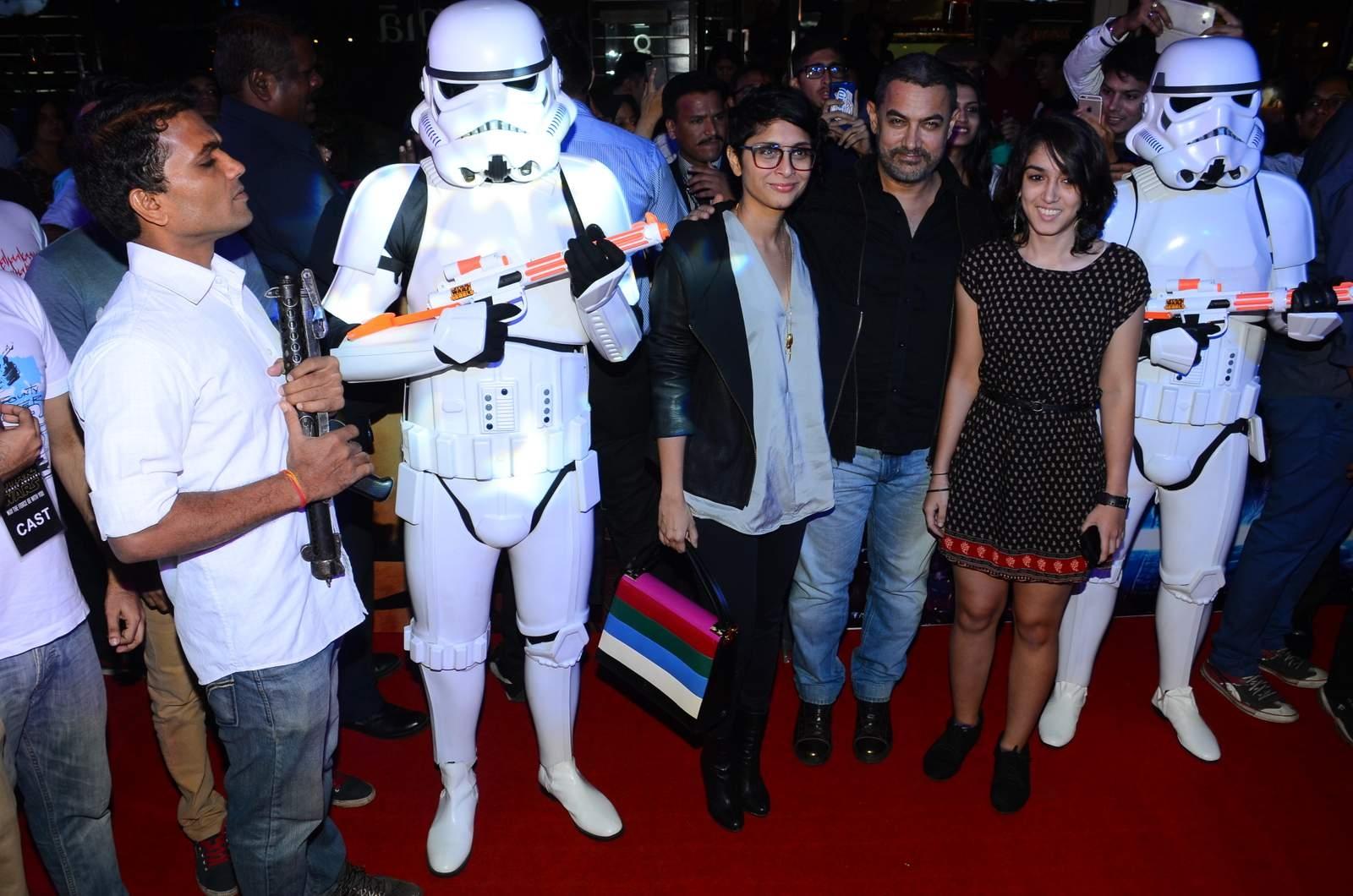 Mumbai: Actor Aamir Khan and his filmmaker wife Kiran Rao withh her daughter poses with a Stormtrooper during the premier of Disney’s Star Wars – The Force Awakens, in Mumbai on Dec 23, 2015. (Photo: IANS)