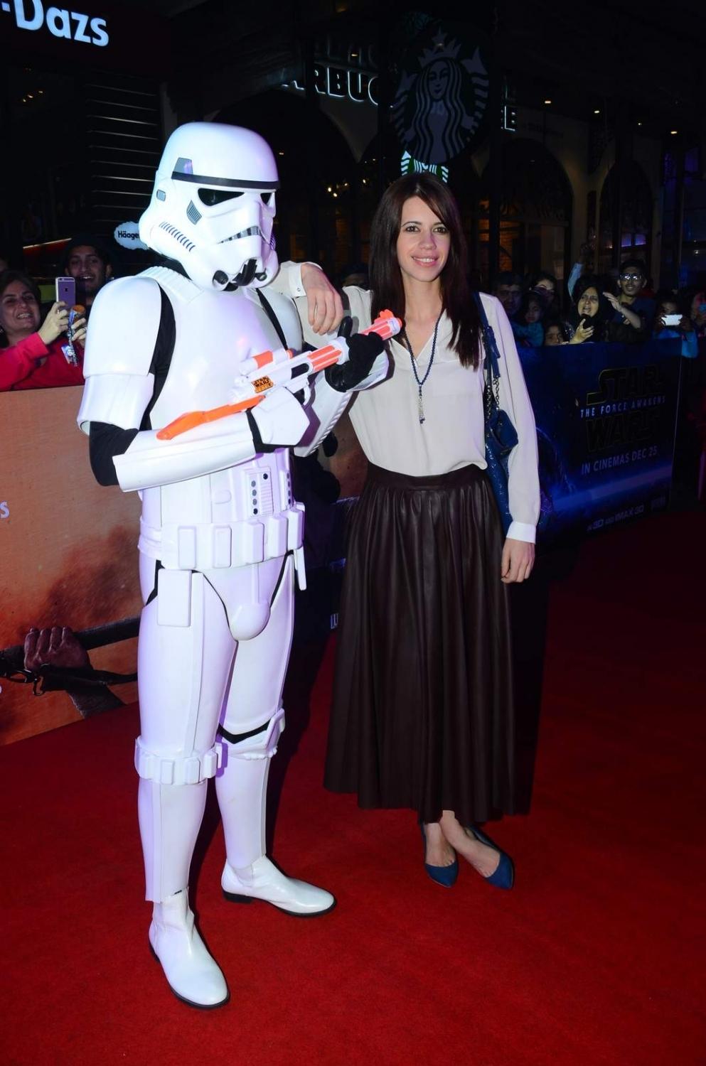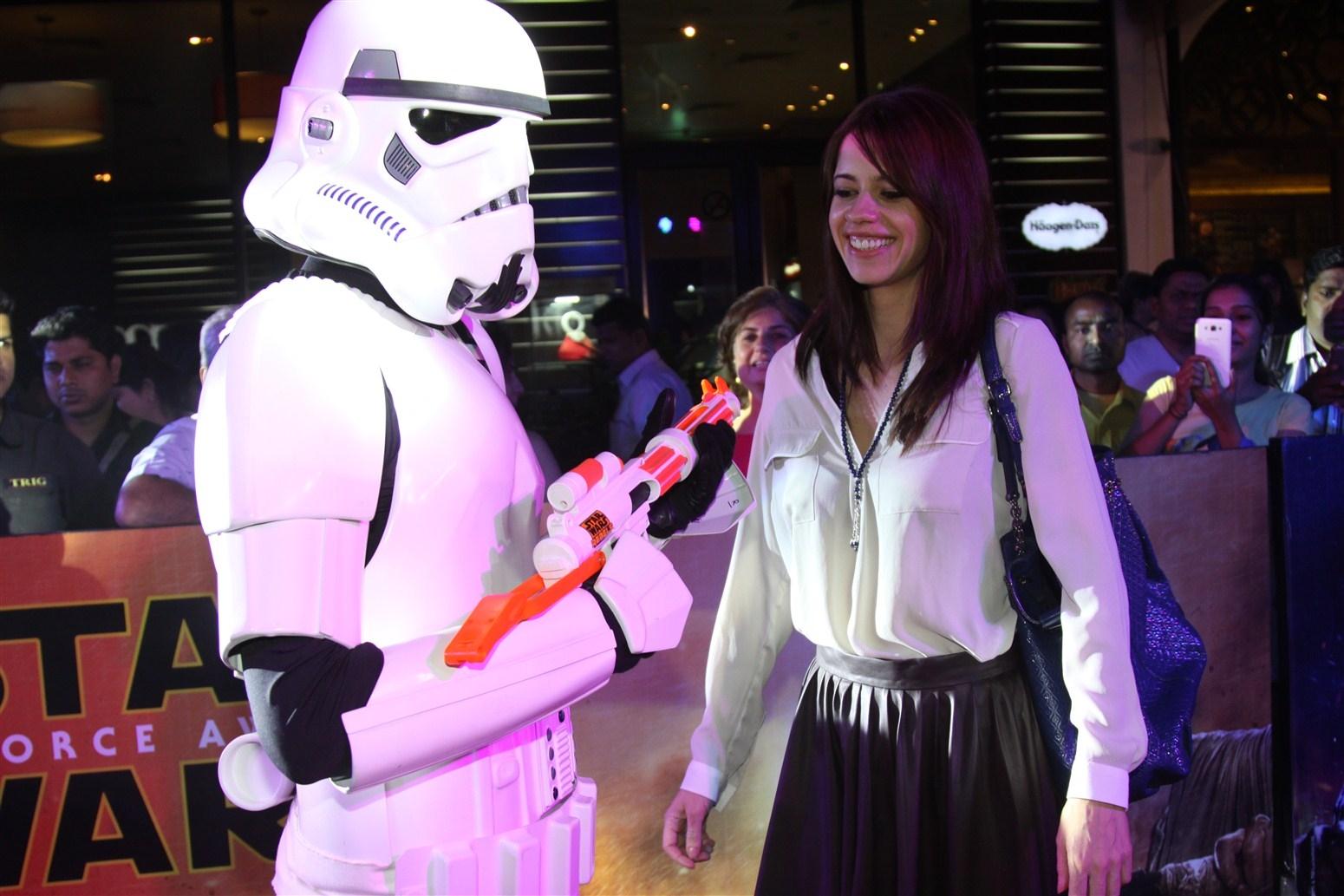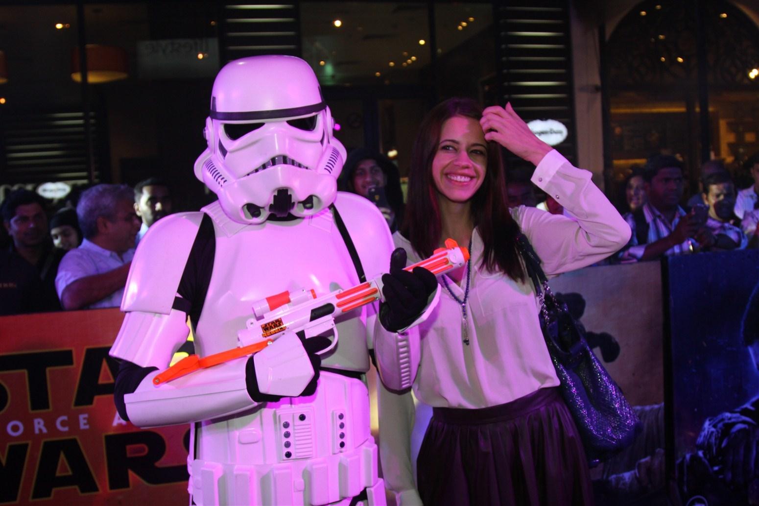 Mumbai: Actress Kalki Koechlin poses with a Stormtrooper during the premier of Disney’s Star Wars – The Force Awakens, in Mumbai on Dec 23, 2015. (Photo: IANS)