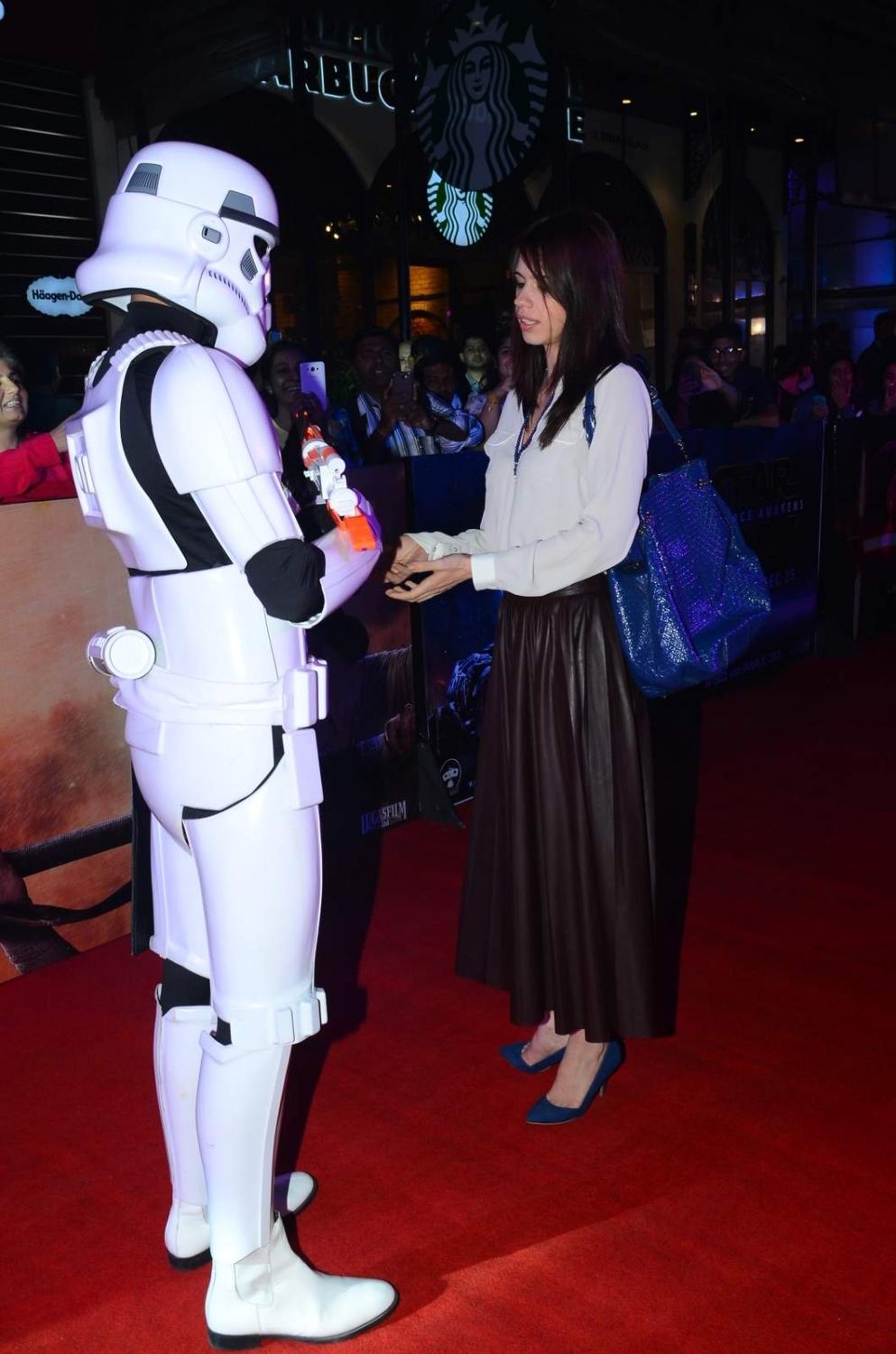 Mumbai, Dec 24 (IANS) Hollywood film Star Wars: The Force Awakens, which is breaking multiple records globally, received a grand welcome in India during its premiere, which was attended by Bollywood celebrities like Aamir Khan, Kalki Koechlin, Vidhu Vinod Chopra, Rajkumar Hirani and R. Madhavan.