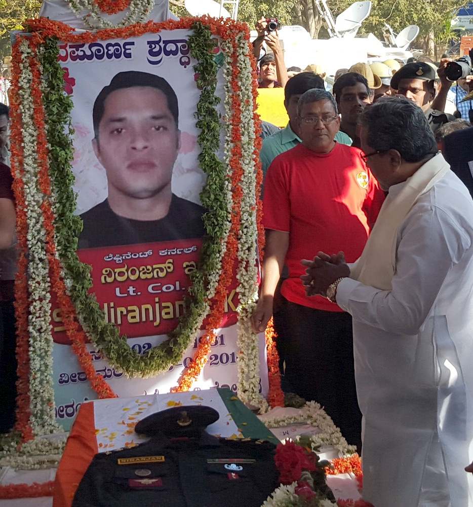 Bengaluru: Karnataka Chief Minister Siddaramaiah pays homage to Niranjan Kumar, a Lieutenant Colonel of the National Security Guard who was killed while defusing a bomb during combing operations at Pathankot IAF base; in Bengaluru on Jan 4, 2016. (Photo: IANS)