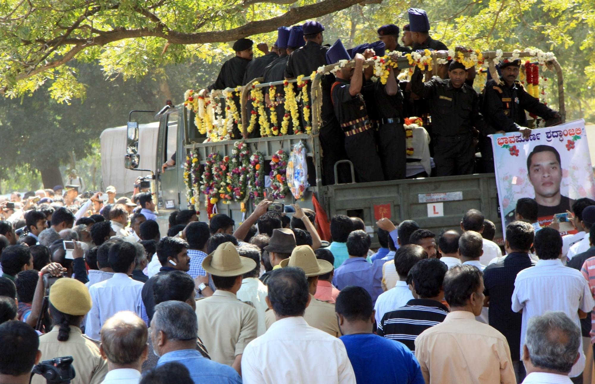 Bengaluru: The mortal remains of Niranjan Kumar, a Lieutenant Colonel of the National Security Guard who was killed while defusing a bomb during combing operations at Pathankot IAF base being taken for cremation; in Bengaluru on Jan 4, 2016. (Photo: IANS)