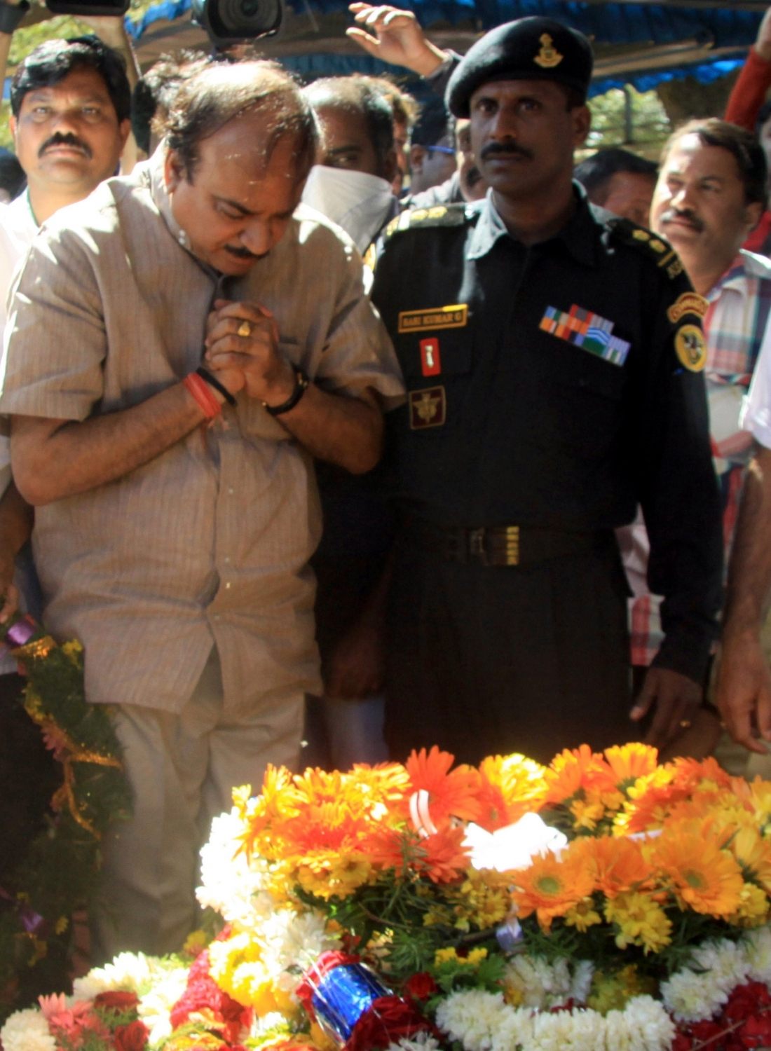 Bengaluru: Union Minister for Chemicals and Fertilizers Ananth Kumar pays homage to Niranjan Kumar, a Lieutenant Colonel of the National Security Guard who was killed while defusing a bomb during combing operations at Pathankot IAF base; in Bengaluru on Jan 4, 2016. (Photo: IANS)