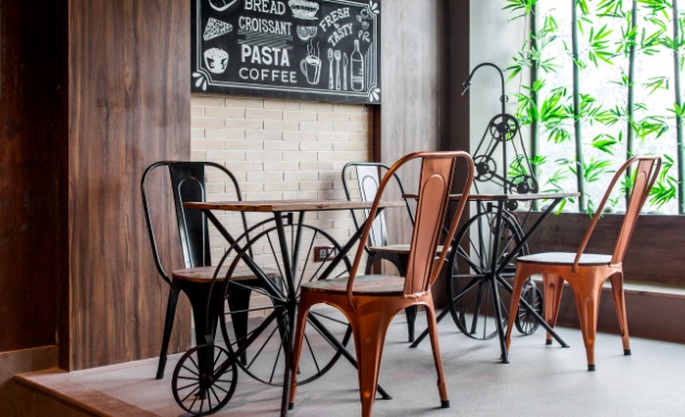 The lower level is in a cheerful cafe style and the upper level is the pub-cum lounge area with aesthetic, monocycle bar stools and chic industrial furniture.