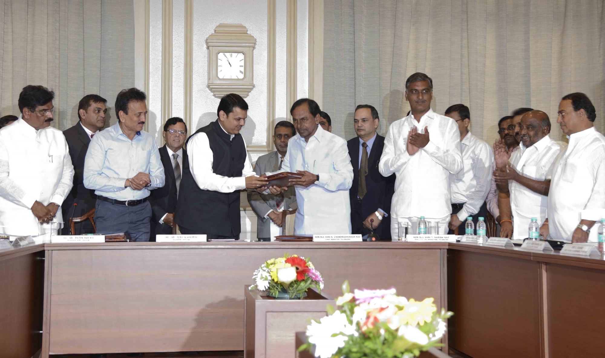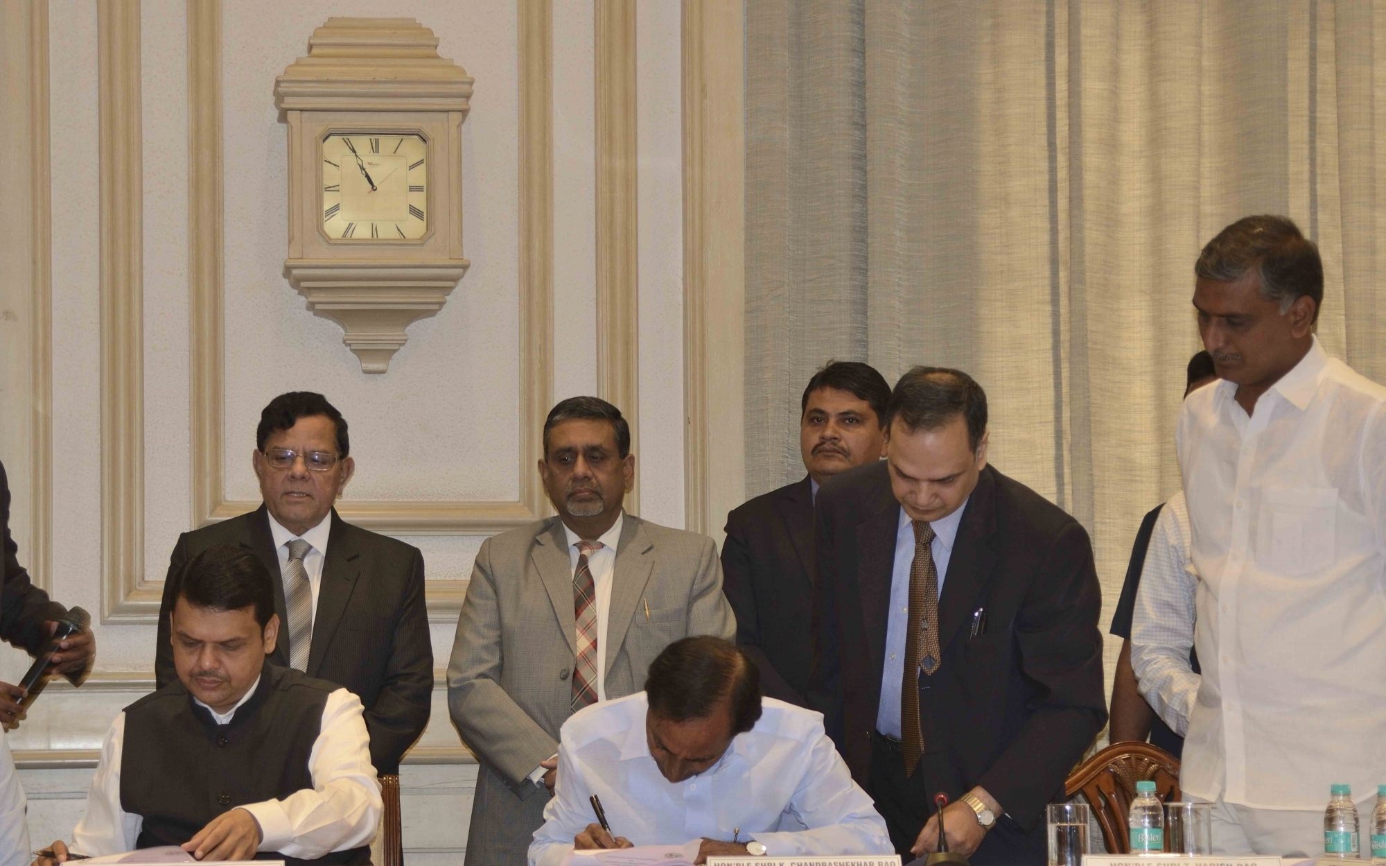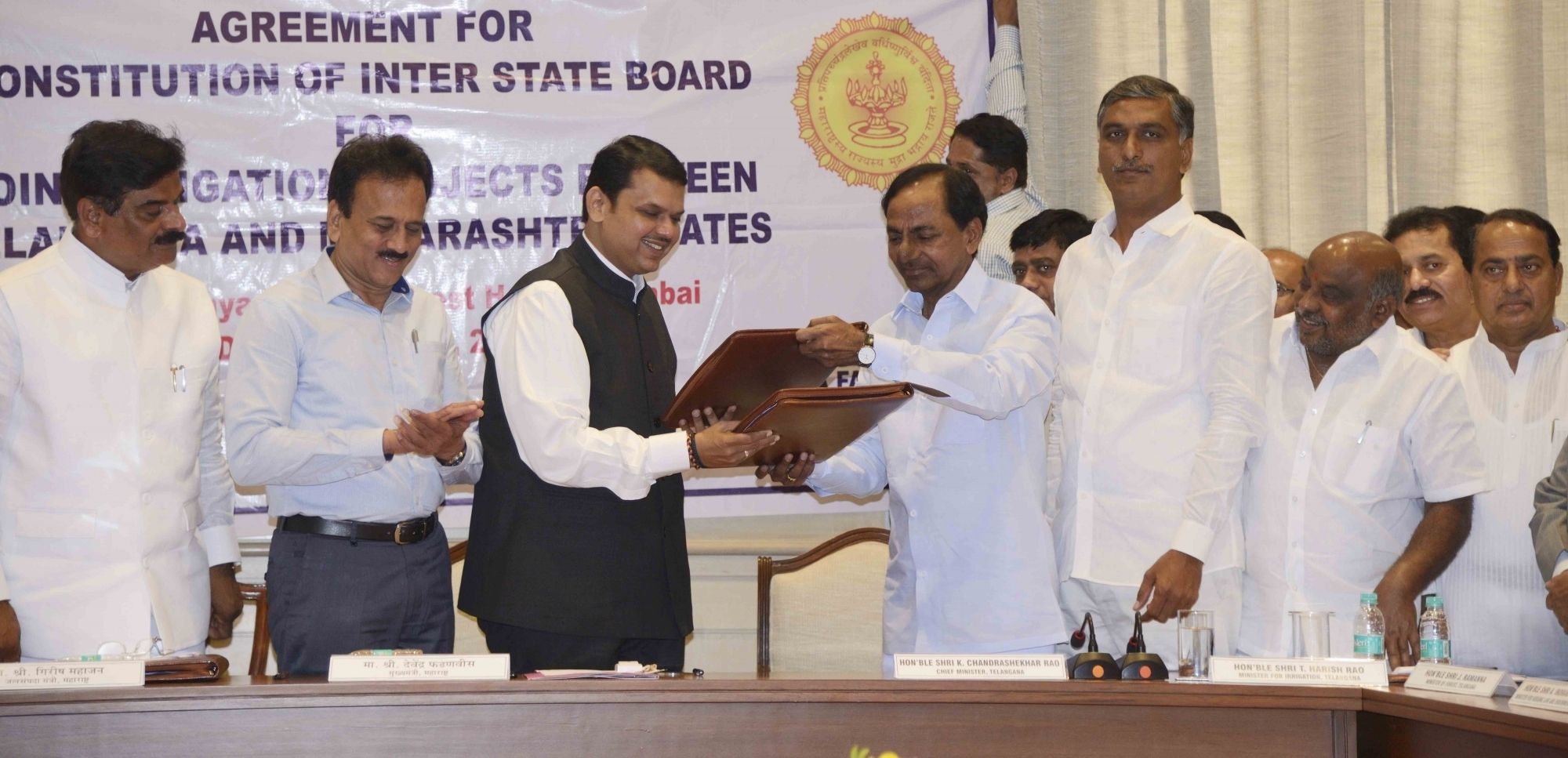 Mumbai: Maharashtra Chief Minister Fadnavis and Telangana Chief Minister K Chandrasekhar Rao signed MoUs for the construction of five barrages in Mumbai on March 8, 2016. (Photo: IANS)
