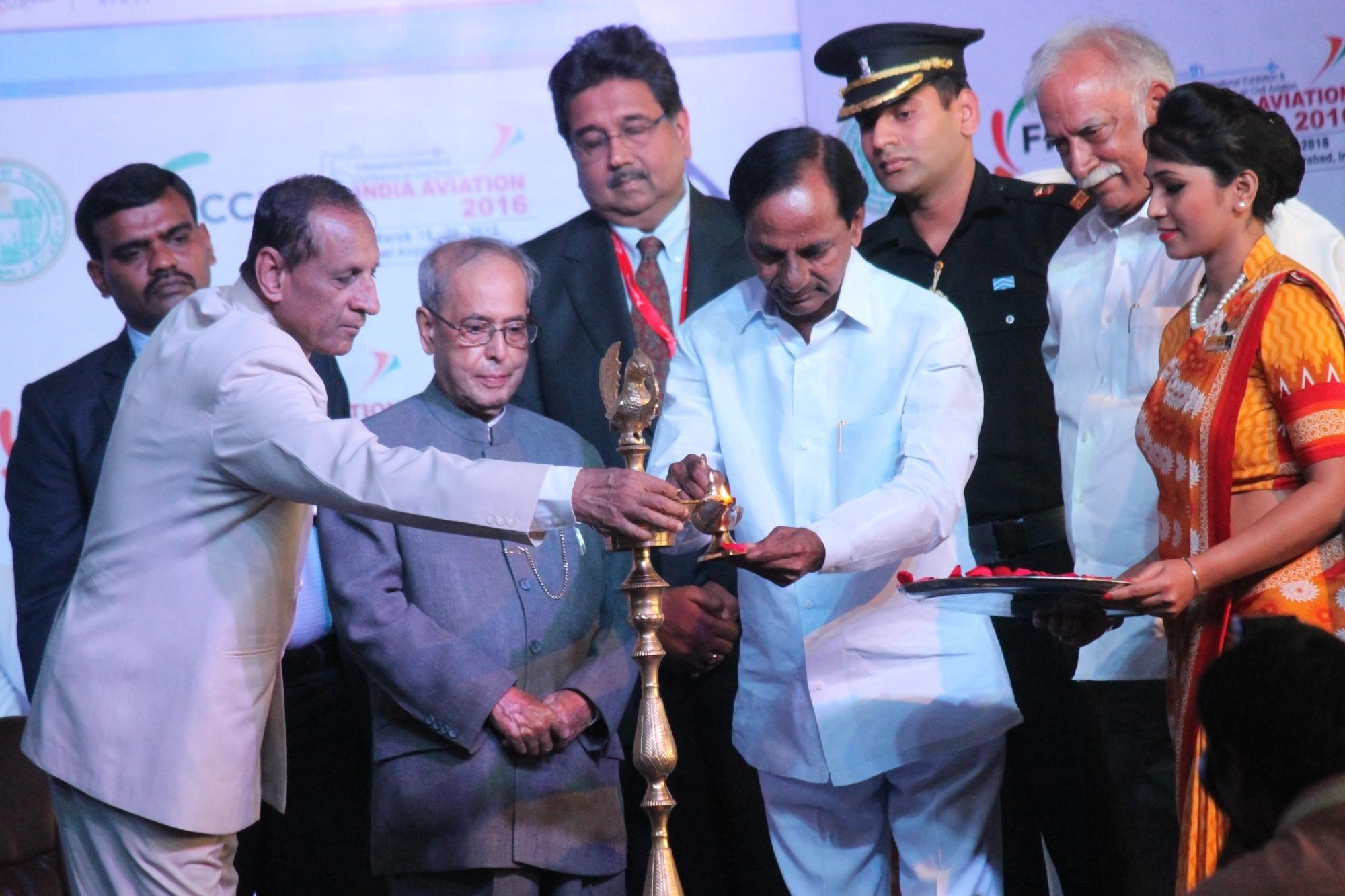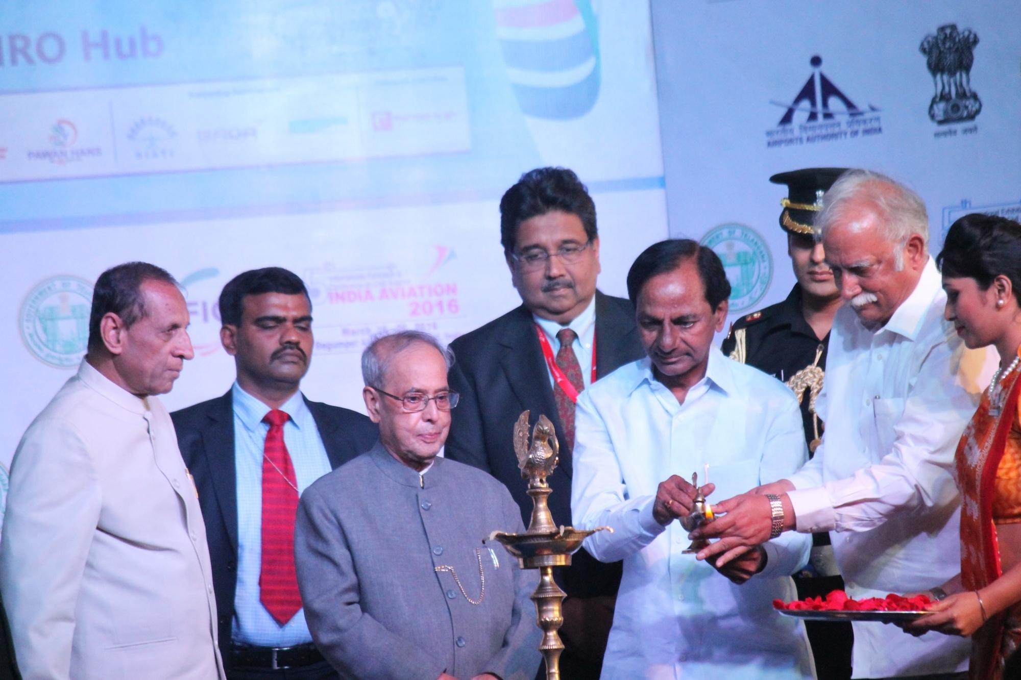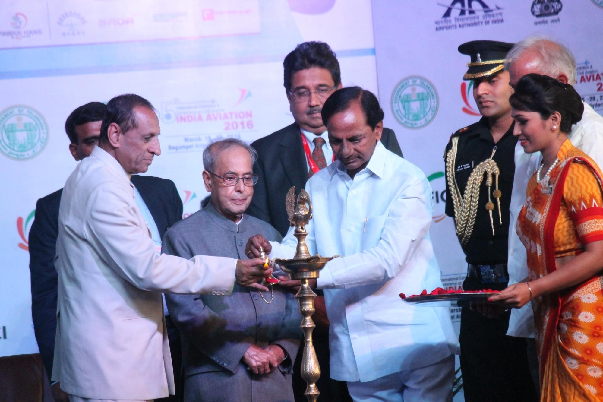 Hyderabad: President Pranab Mukherjee, Telangana Governor E S L Narasimhan and Chief Minister K Chandrasekhar Rao during inauguration of the fifth edition of India Aviation 2016 at Begumpet Airport, in Hyderabad, on March 16, 2016. (Photo: IANS)