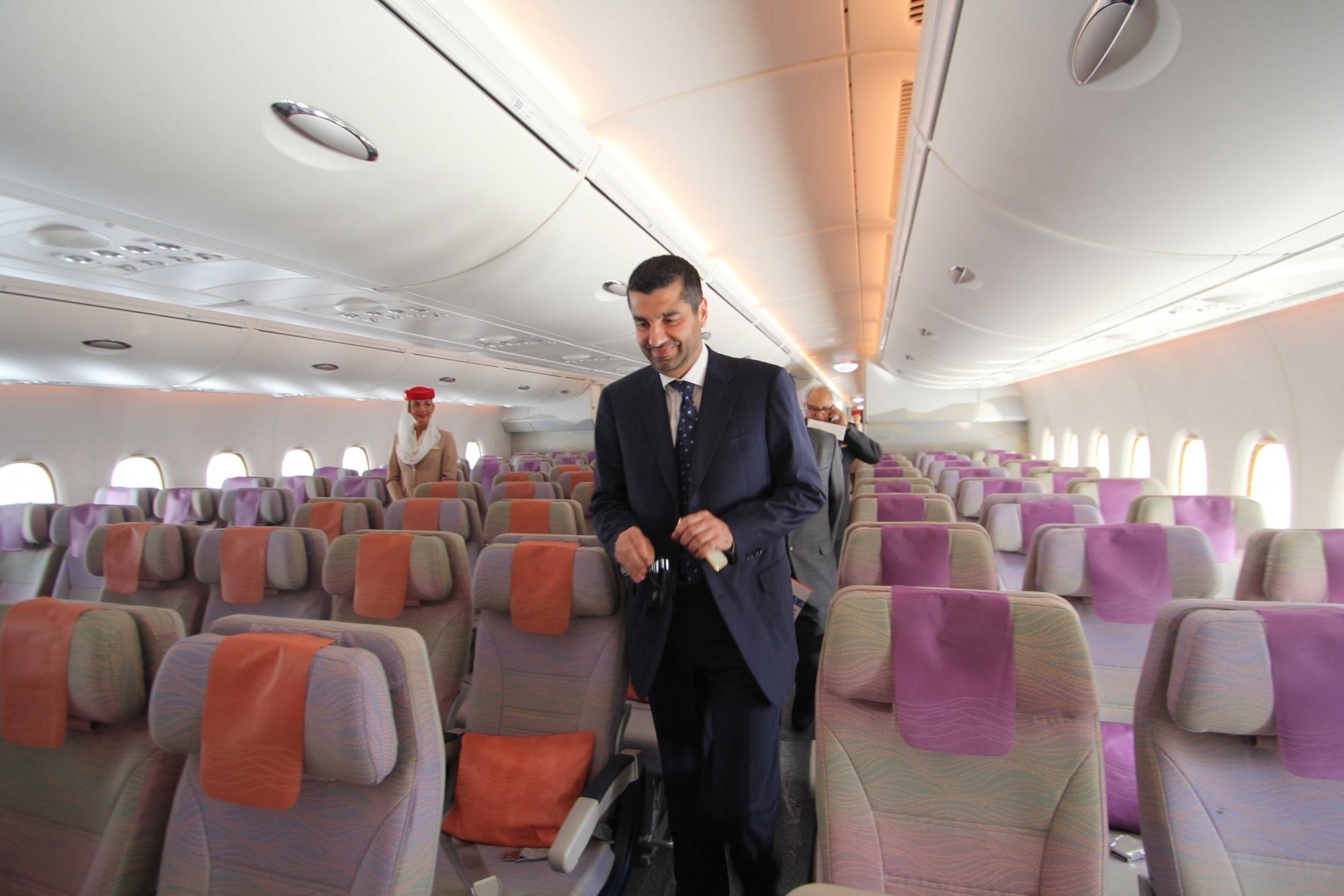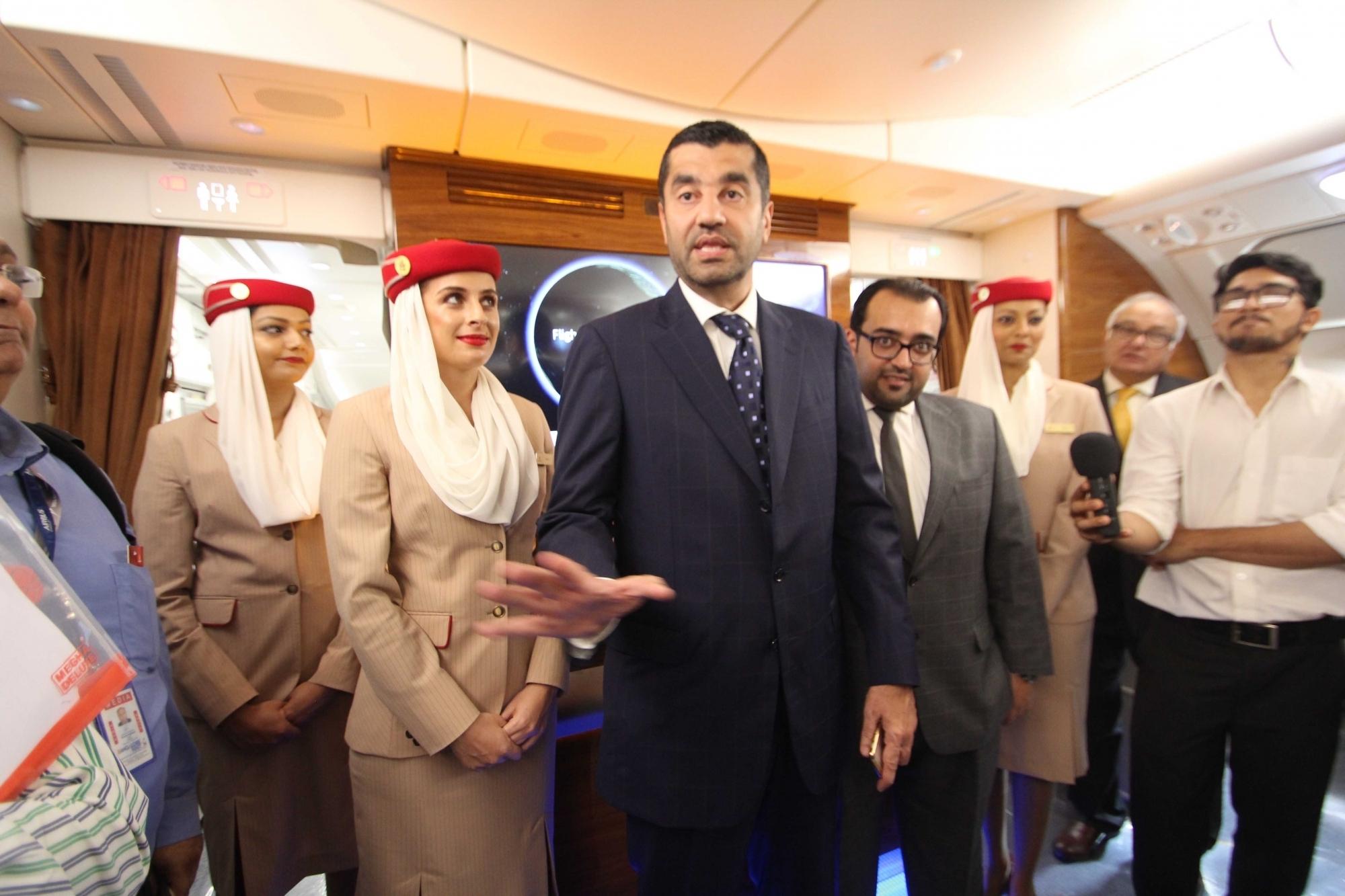 Hyderabad: Emirates Airline Senior Vice President Commercial Operations, Gulf, Middle East and Iran Ahmed Hashim Khoory during a press conference regarding 5th edition of the India Aviation Show at Begumpet Airport, Hyderabad, on March 16, 2016. Also seen Emirates Airline Vice President (India and Nepal) Essa Sulaiman Ahmad. (Photo: IANS)