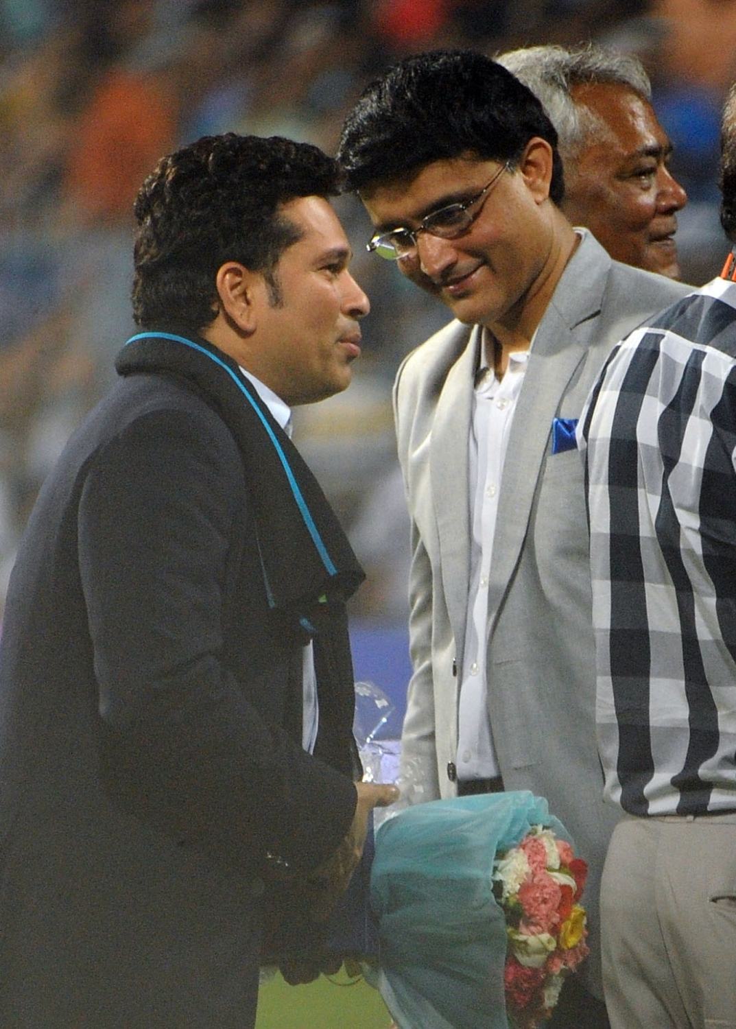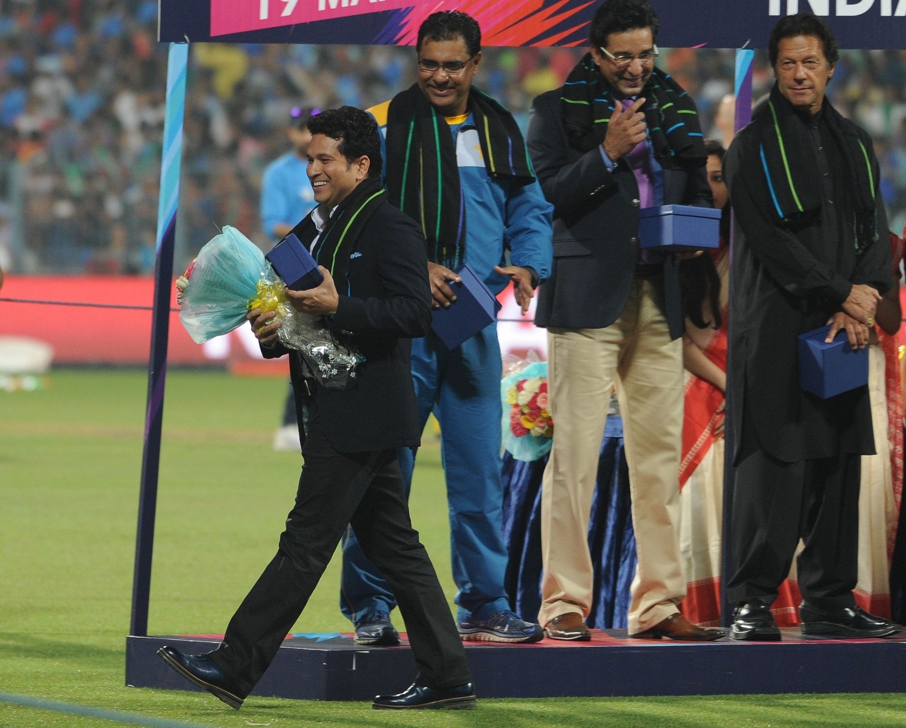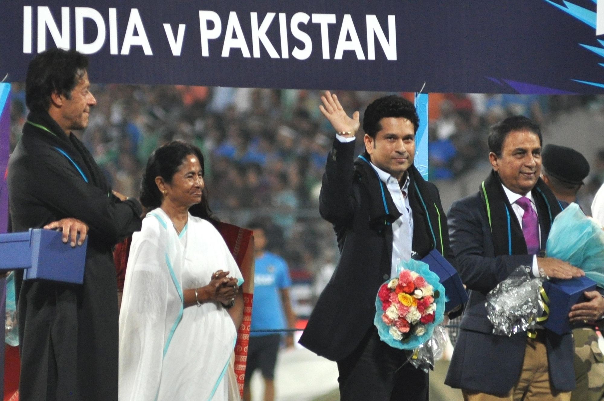 Kolkata: Indian cricket legends Sachin Tendulkar and Sunil Gavaskar at a felicitation programme organised during the ICC WT20 2016 match between India and Pakistan at Eden Gardens in Kolkata on March 19, 2016. Also seen West Bengal Chief Minister Mamata Banerjee and former Pakistani cricketer Imran Khan. (Photo: Kuntal Chakrabarty/IANS)