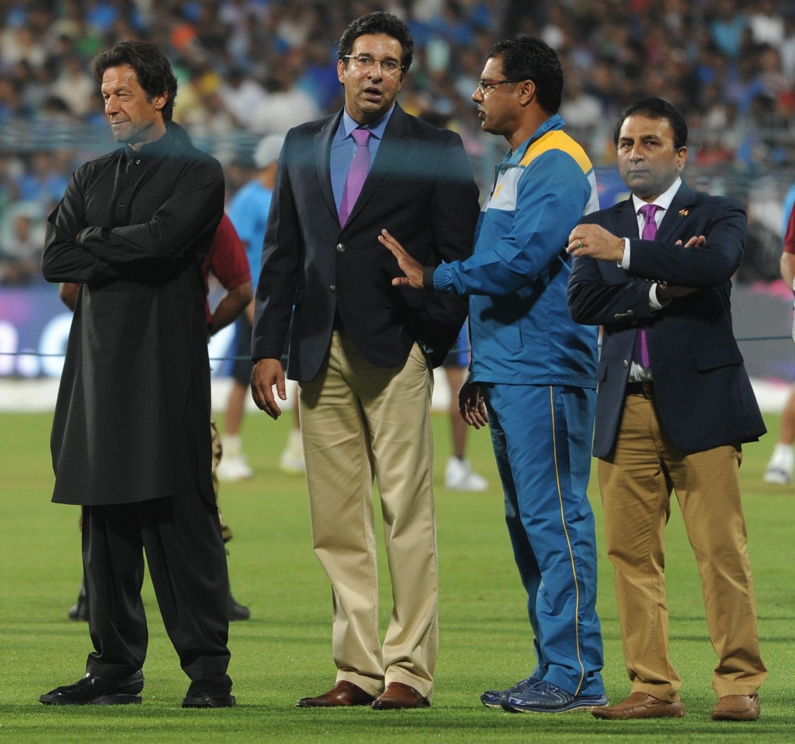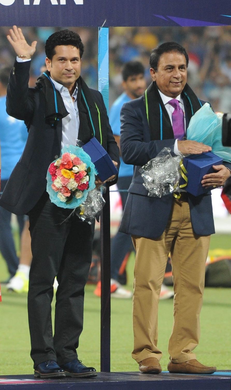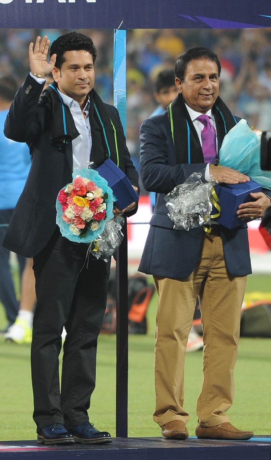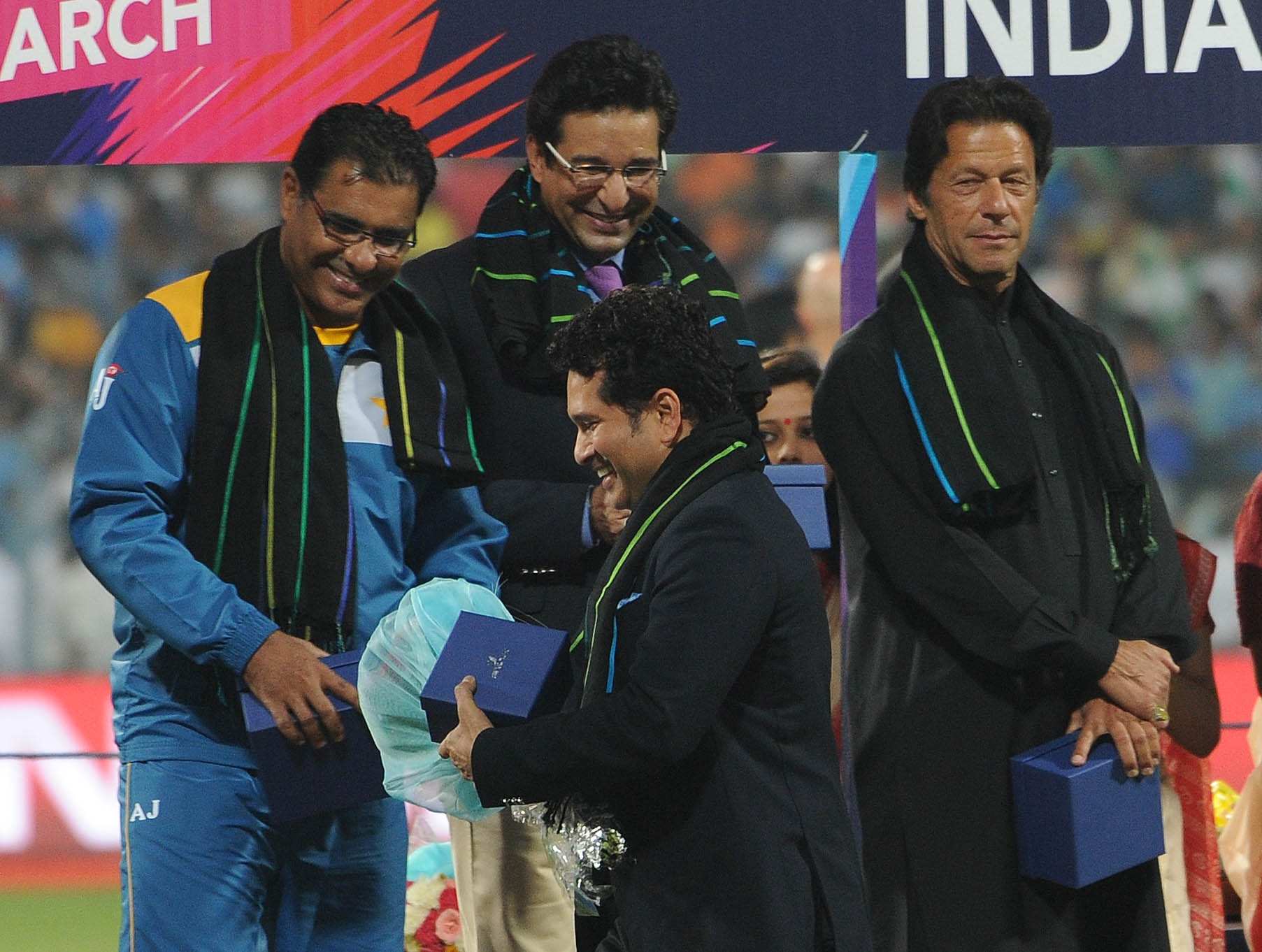 Kolkata: Indian cricket legends Sachin Tendulkar and Sunil Gavaskar at a felicitation programme organised during the ICC WT20 2016 match between India and Pakistan at Eden Gardens in Kolkata on March 19, 2016. Also seen West Bengal Chief Minister Mamata Banerjee and former Pakistani cricketer Imran Khan. (Photo: Kuntal Chakrabarty/IANS)