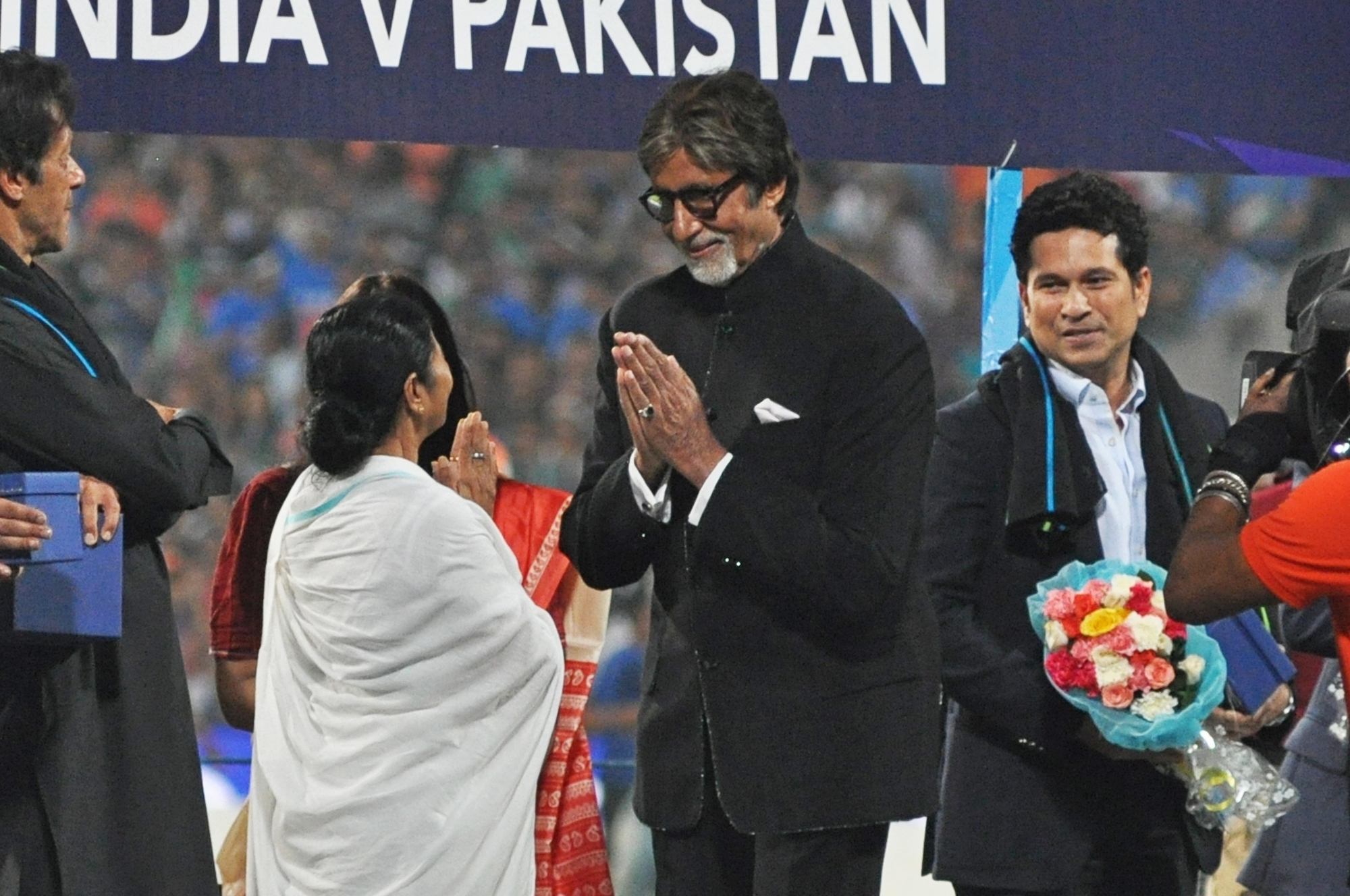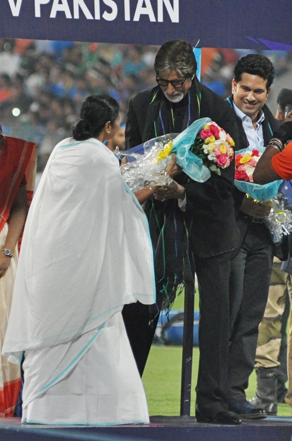 Kolkata: West Bengal Chief Minister Mamata Banerjee felicitates megastar Amitabh Bachchan at a felicitation programme organised during the ICC WT20 2016 match between India and Pakistan at Eden Gardens in Kolkata on March 19, 2016. Also seen Indian cricket legend Sachin Tendulkar. (Photo: Kuntal Chakrabarty/IANS)