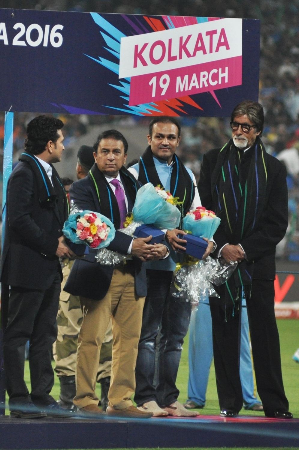 Kolkata: Indian cricket legends Sachin Tendulkar, Sunil Gavaskar, Virendra Sehwag and Megastar Amitabh Bachchan at a felicitation programme organised during the ICC WT20 2016 match between India and Pakistan at Eden Gardens in Kolkata on March 19, 2016. Also seen West Bengal Chief Minister Mamata Banerjee. (Photo: Kuntal Chakrabarty/IANS)