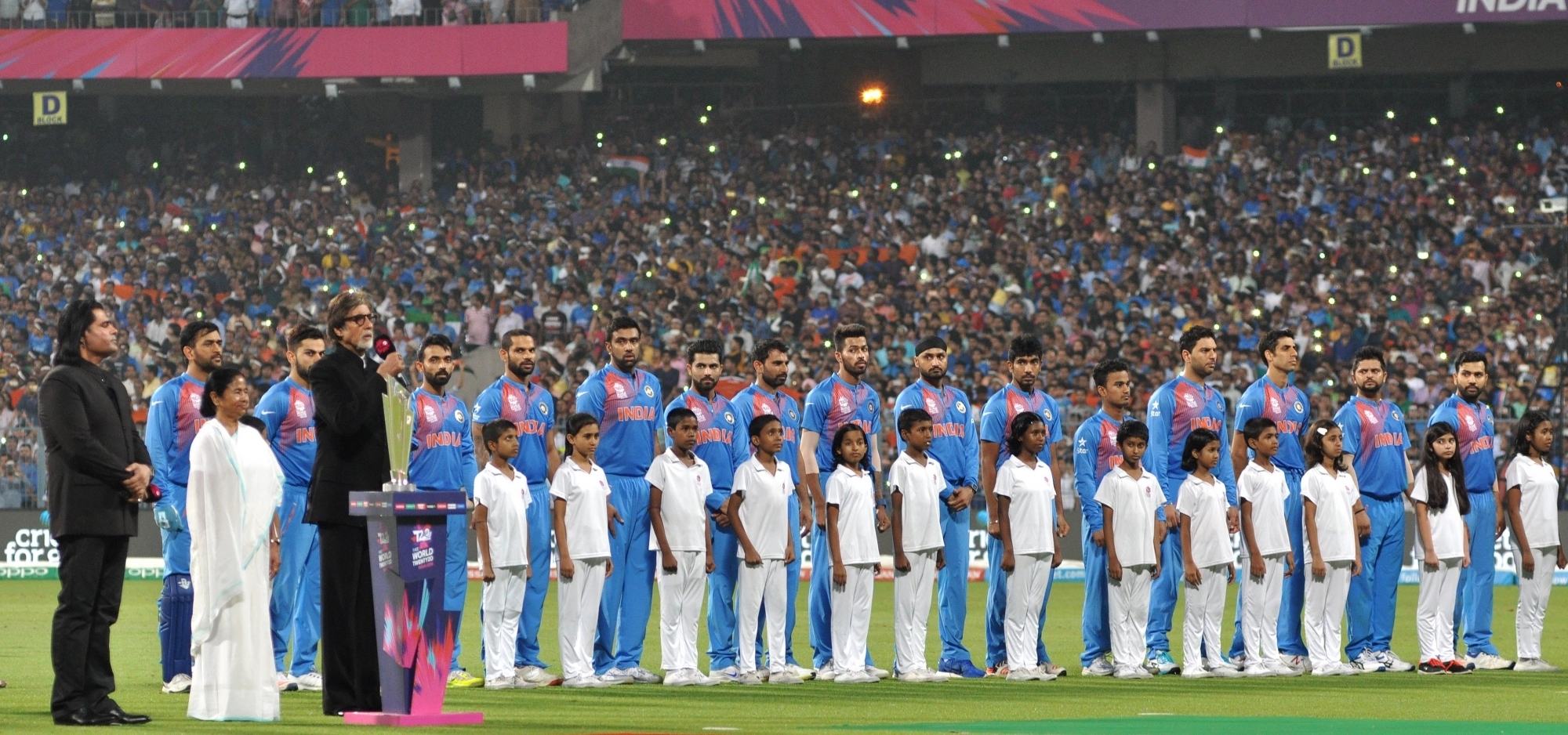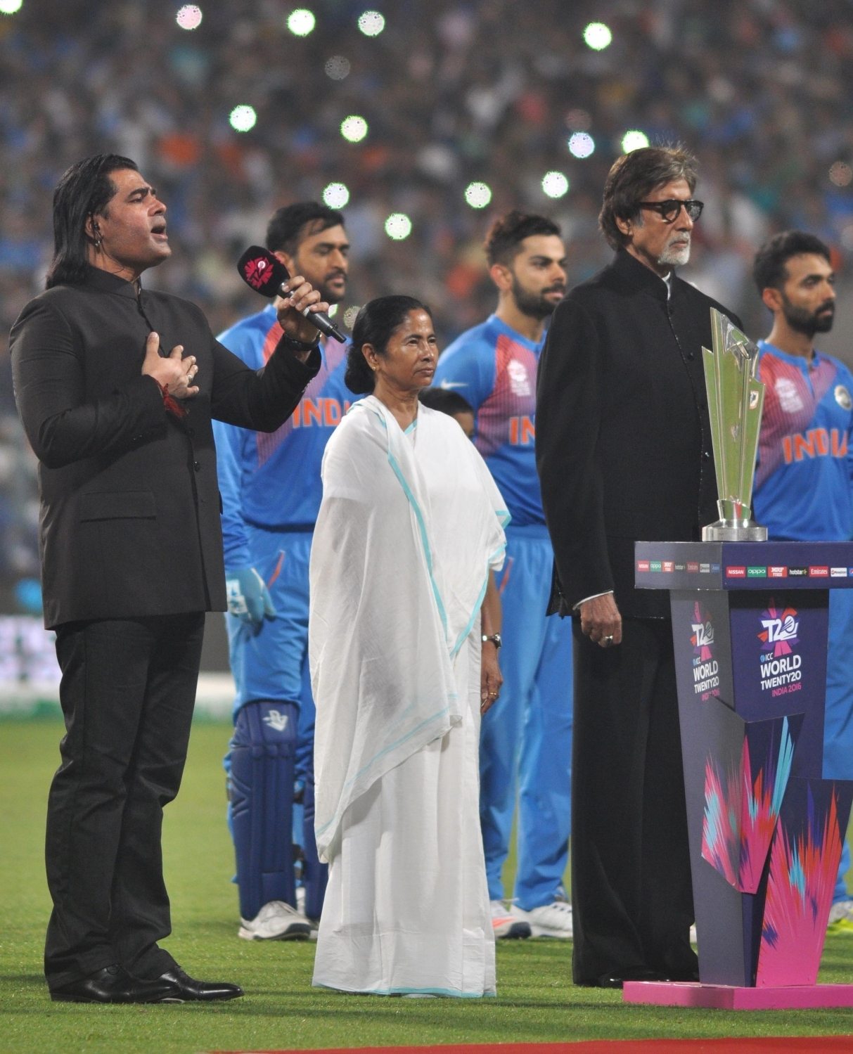 Kolkata: Megastar Amitabh Bachchan sings the Indian National Anthem at a felicitation programme organised during the ICC WT20 2016 match between India and Pakistan at Eden Gardens in Kolkata on March 19, 2016. Also seen West Bengal Chief Minister Mamata Banerjee and Pakistani singer Shafqat Amanat Ali. (Photo: Kuntal Chakrabarty/IANS)