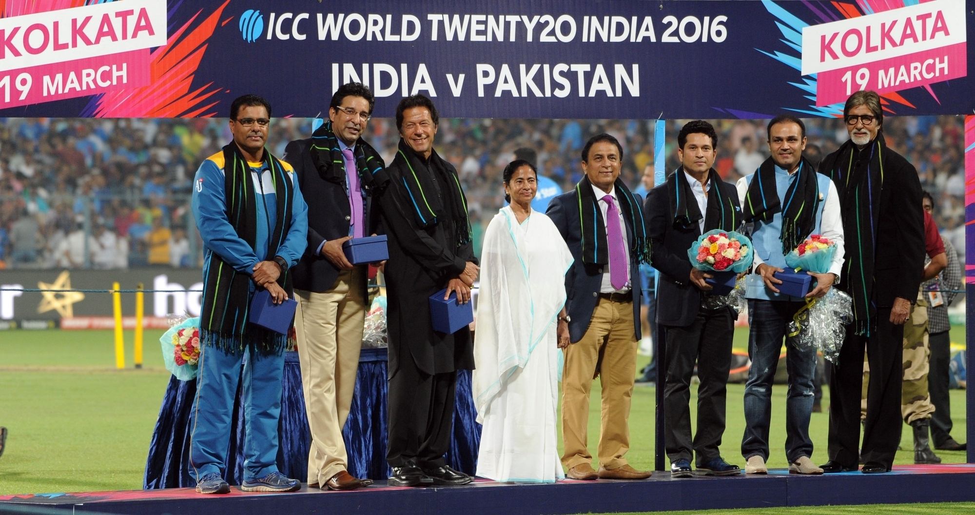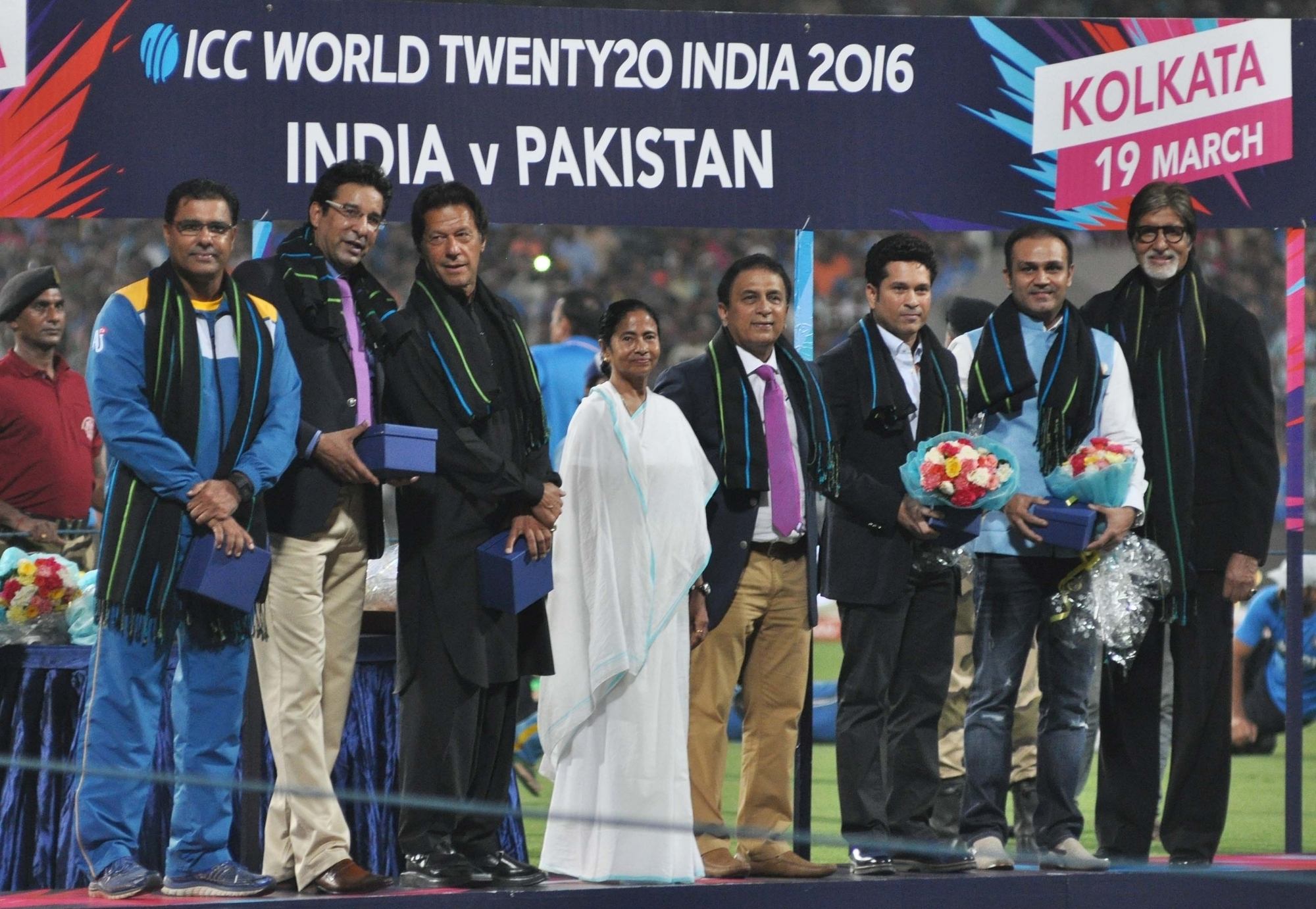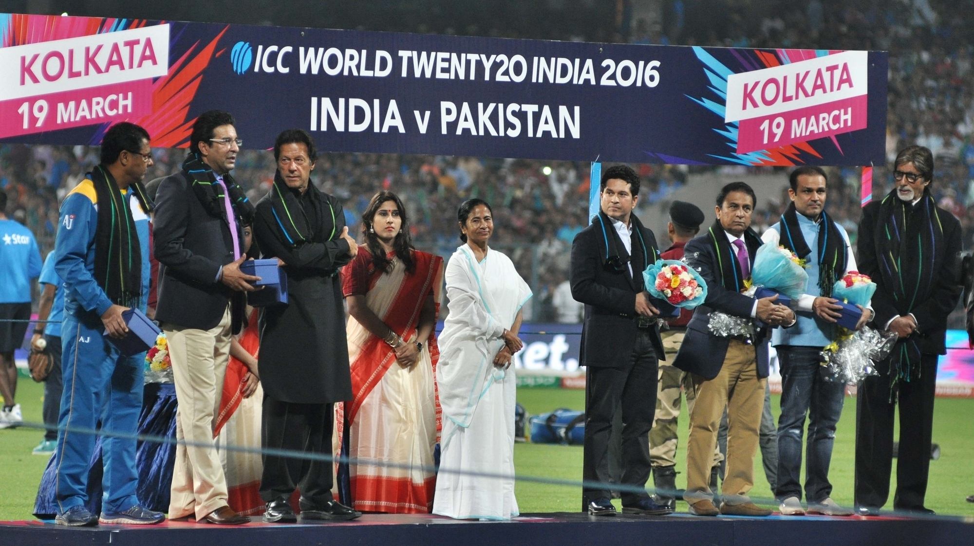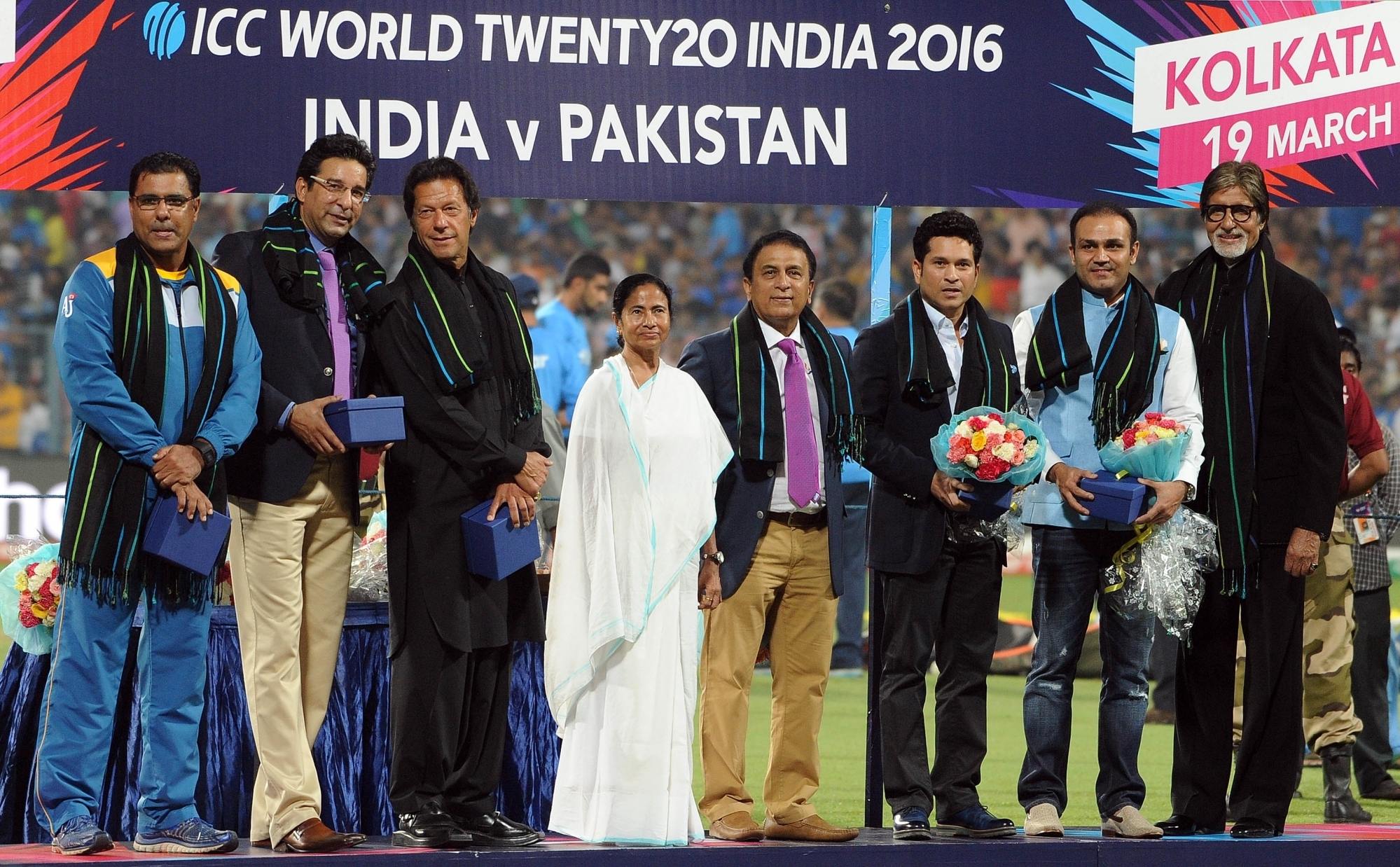 Kolkata: West Bengal Chief Minister Mamata Banerjee, Indian cricket legends Sachin Tendulkar, Sunil Gavaskar, Virendra Sehwag, Megastar Amitabh Bachchan, Pakistani cricket legends Imran Khan, Waqar Younis and Wasim Akram at a felicitation programme organised during the ICC WT20 2016 match between India and Pakistan at Eden Gardens in Kolkata on March 19, 2016. (Photo: Kuntal Chakrabarty/IANS)