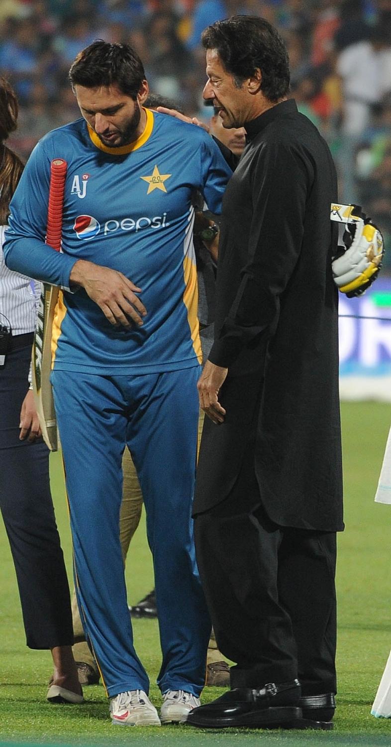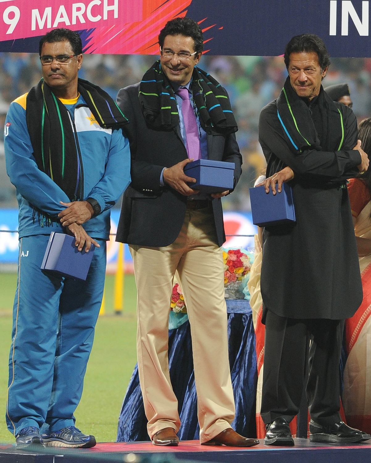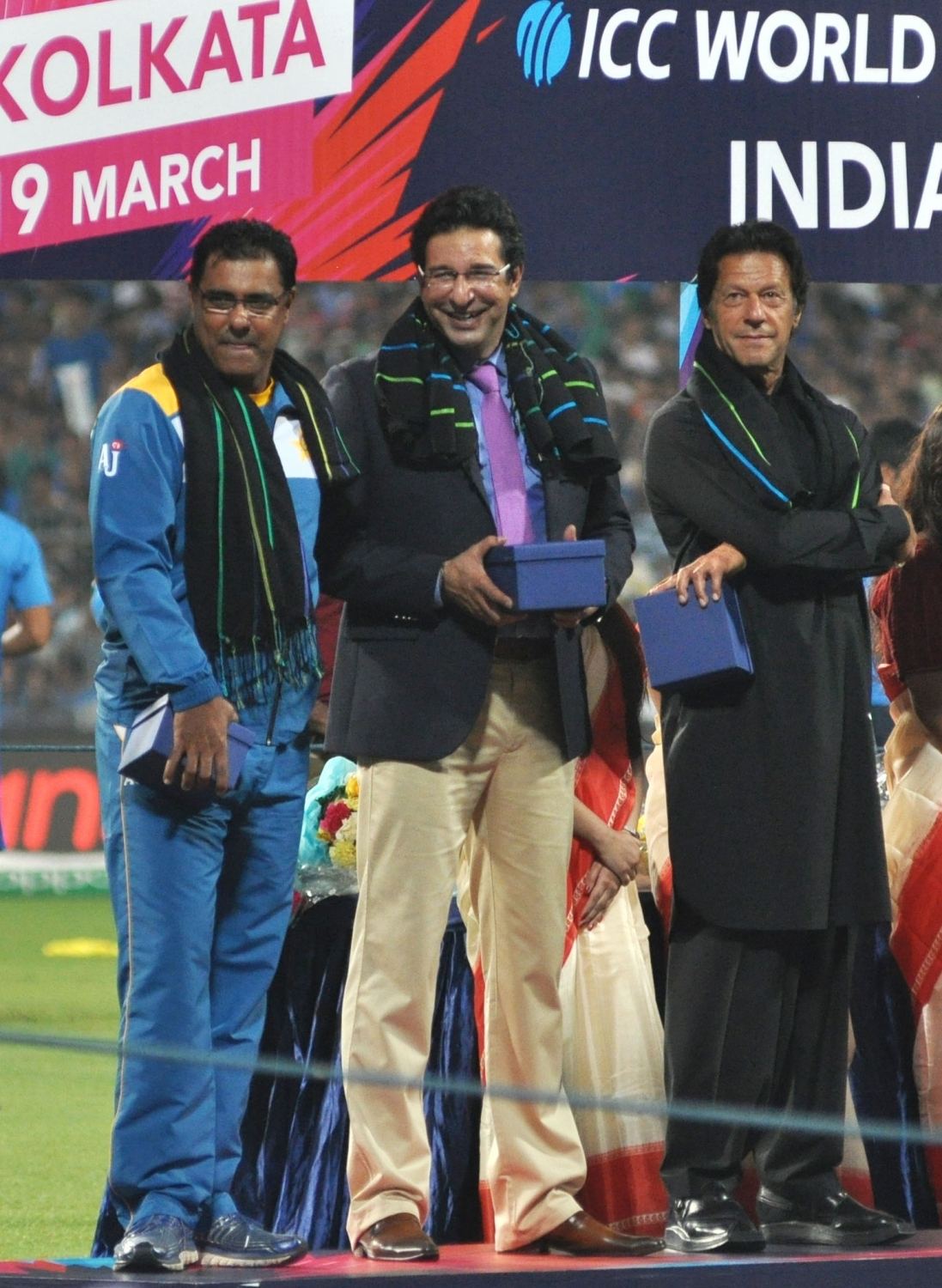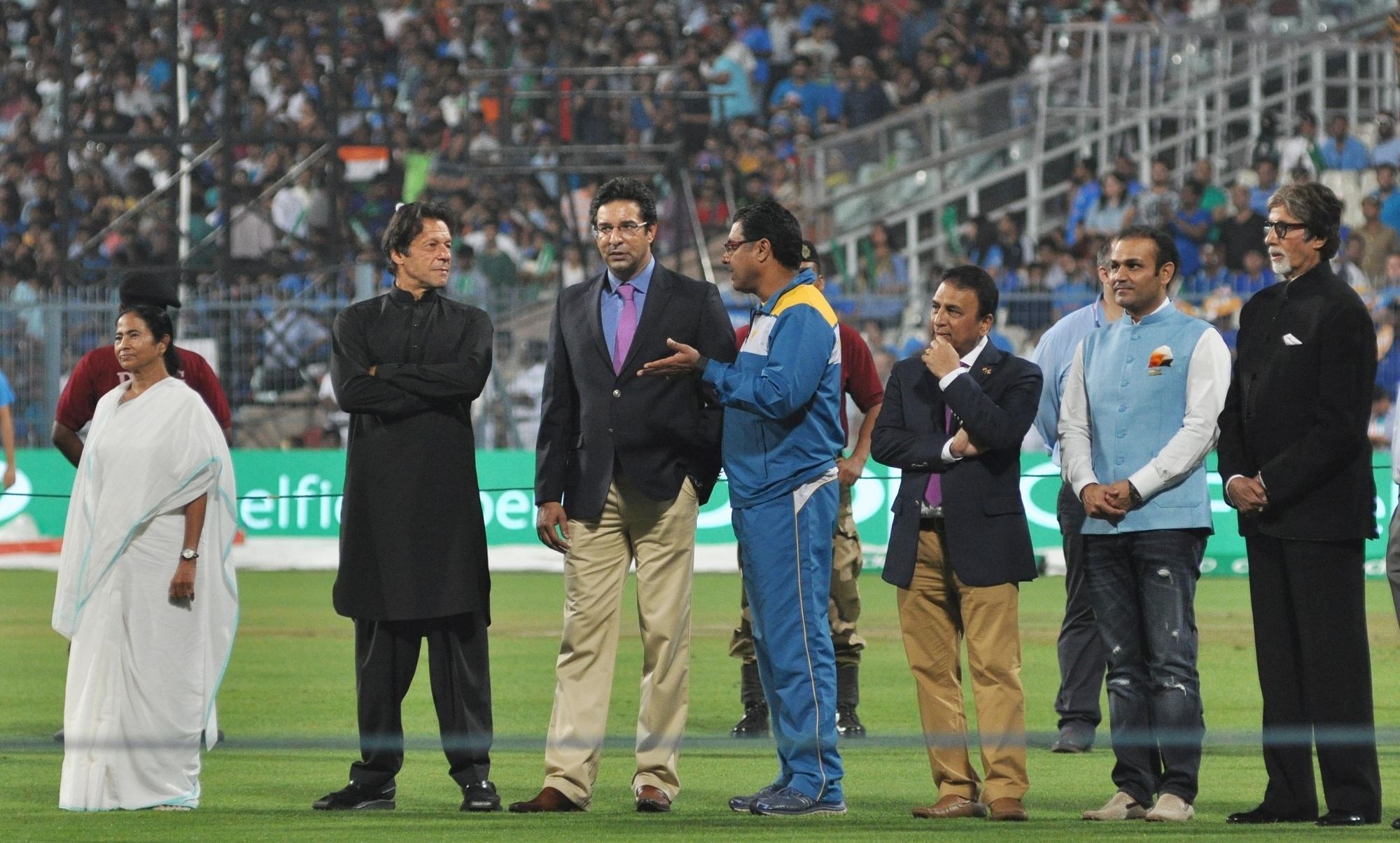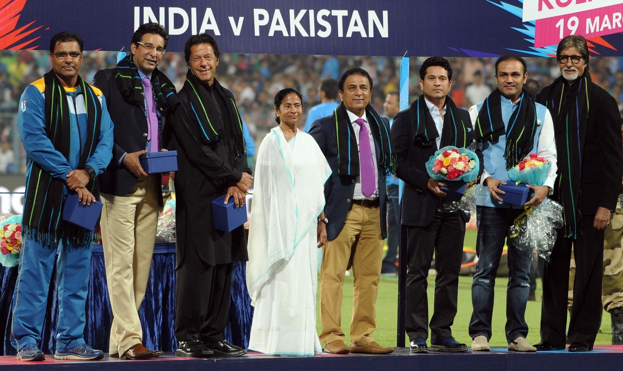 Kolkata: West Bengal Chief Minister Mamata Banerjee, Indian cricket legends Sachin Tendulkar, Sunil Gavaskar, Virendra Sehwag, Megastar Amitabh Bachchan, Pakistani cricket legends Imran Khan, Waqar Younis and Wasim Akram at a felicitation programme organised during the ICC WT20 2016 match between India and Pakistan at Eden Gardens in Kolkata on March 19, 2016. (Photo: Kuntal Chakrabarty/IANS)