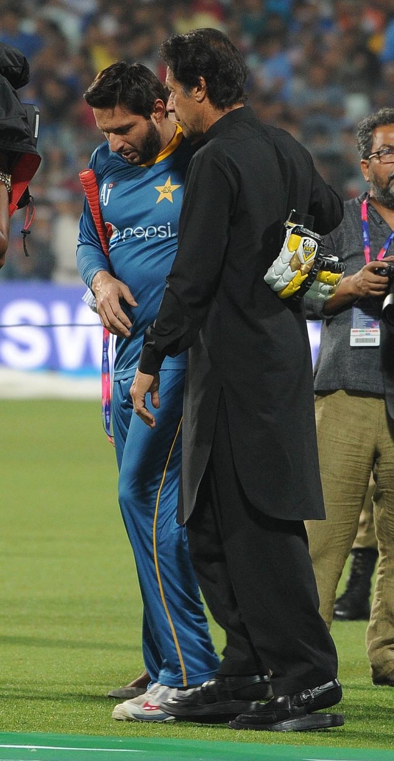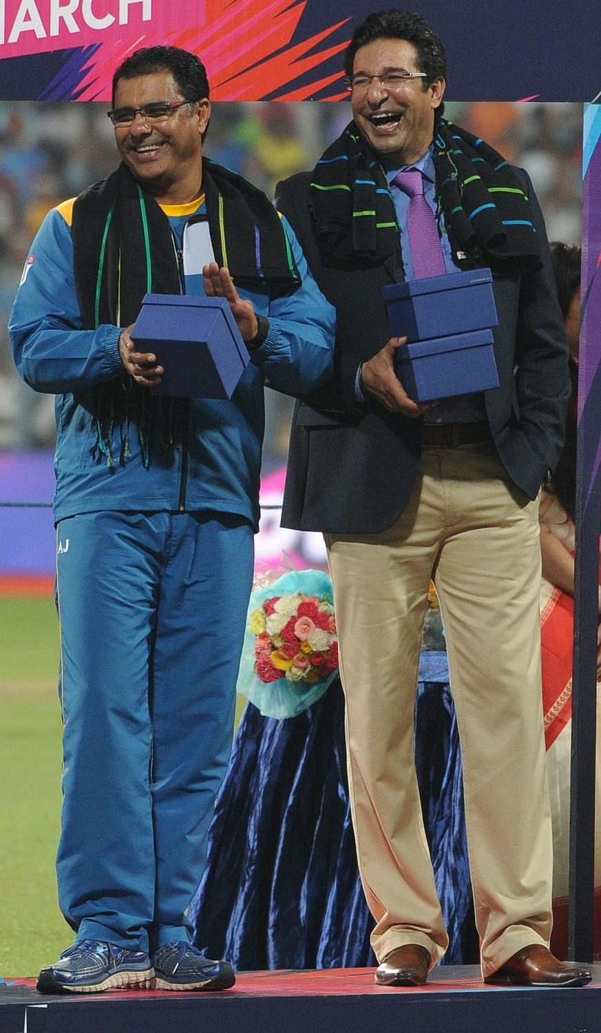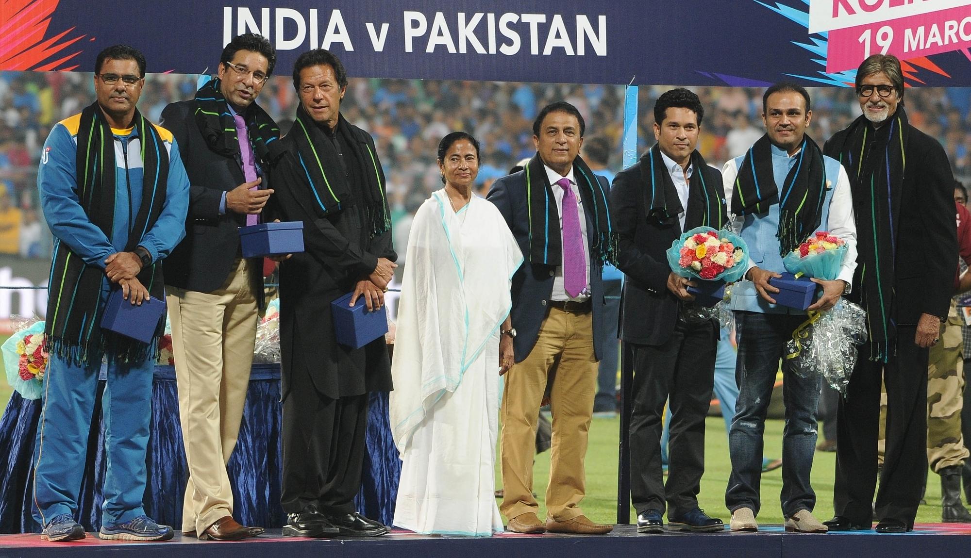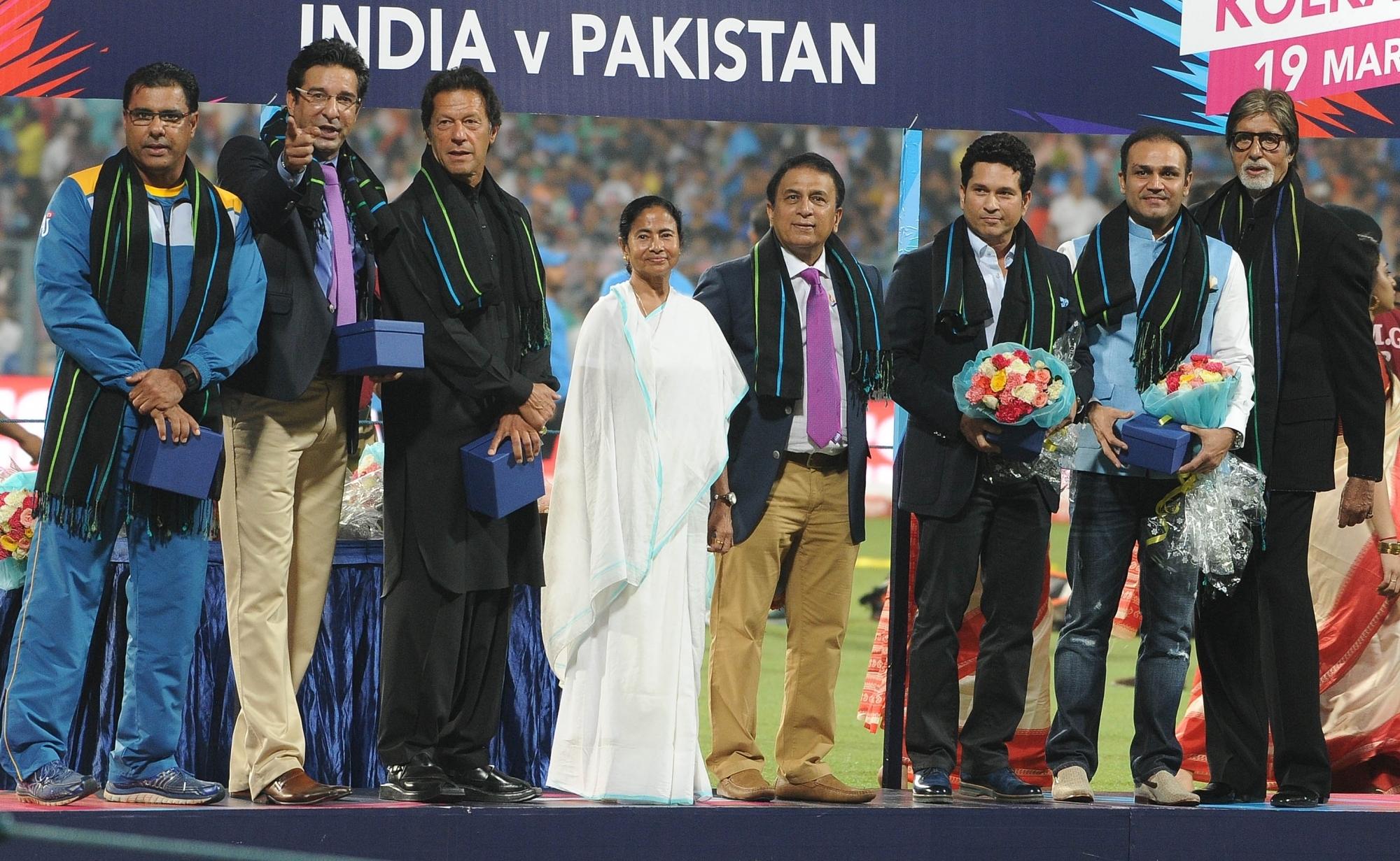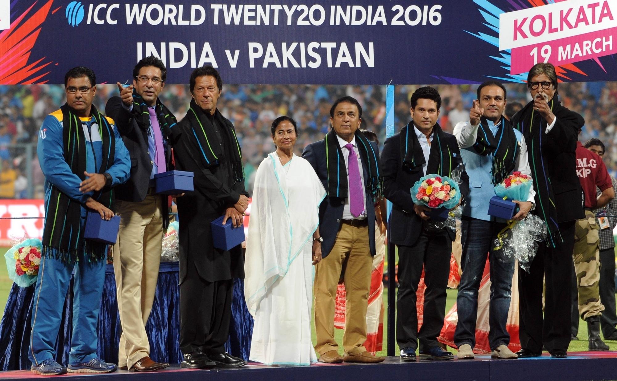Kolkata: (L- R) Former Pakistan cricketers Waqar Yunis, Wasim Akram, Imran Khan, with West Bengal Chief Minister Mamata Banerjee, former Indian cricketer Sunil Gavaskar, Sachin Tendulkar, Virender Sehwag and Megastar Amitabh Bachchan during a felicitation ceremony before the World Cup T20 match between India and Pakistan at Eden Gardens, Kolkata on March 19, 2016. (Photo: IANS)