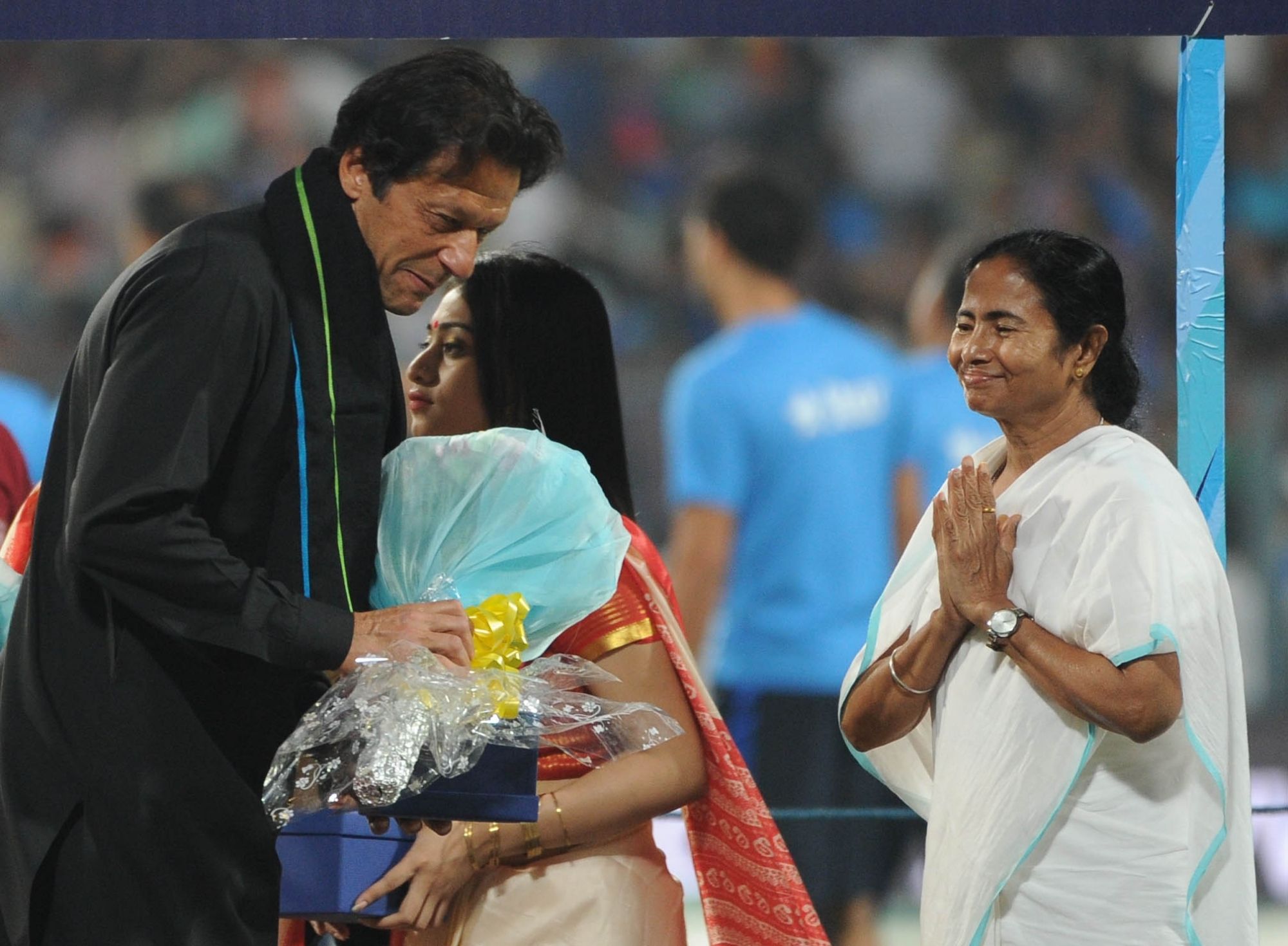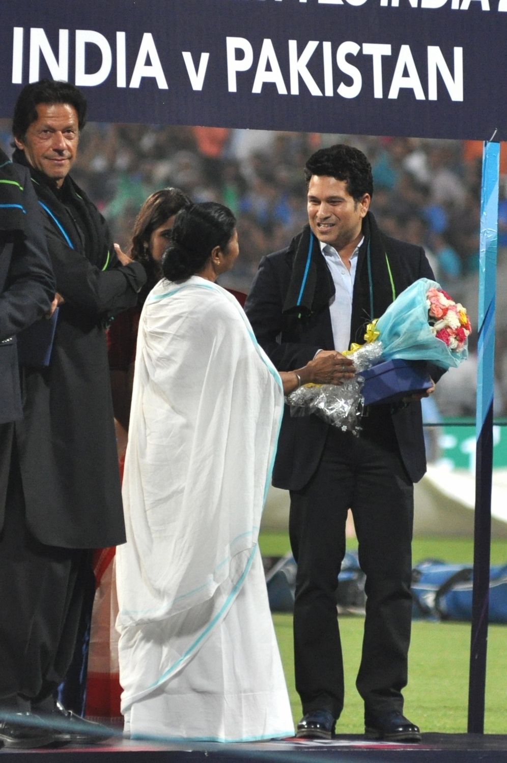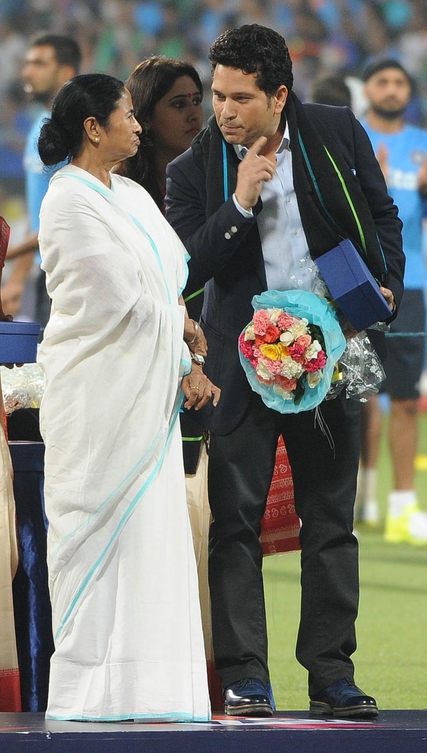Kolkata: West Bengal Chief Minister Mamata Banerjee felicitates Indian cricket legend Sachin Tendulkar at a felicitation programme organised during the ICC WT20 2016 match between India and Pakistan at Eden Gardens in Kolkata on March 19, 2016. Also seen former Pakistani cricketer Imran Khan. (Photo: Kuntal Chakrabarty/IANS)