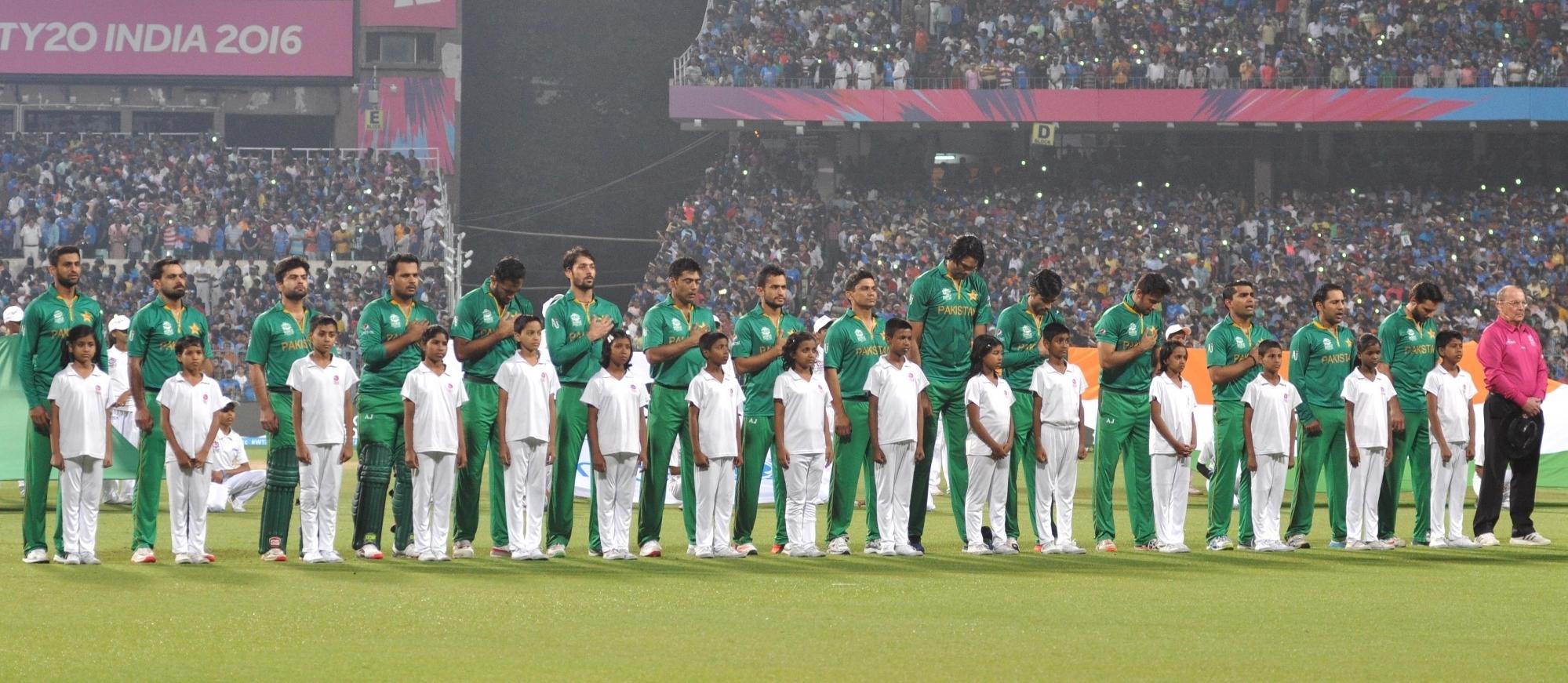 Kolkata: Pakistani singer Shafqat Amanat Ali sings the Pakistan National Anthem at a felicitation programme organised during the ICC WT20 2016 match between India and Pakistan at Eden Gardens in Kolkata on March 19, 2016. Also seen West Bengal Chief Minister Mamata Banerjee and Megastar Amitabh Bachchan. (Photo: Kuntal Chakrabarty/IANS)