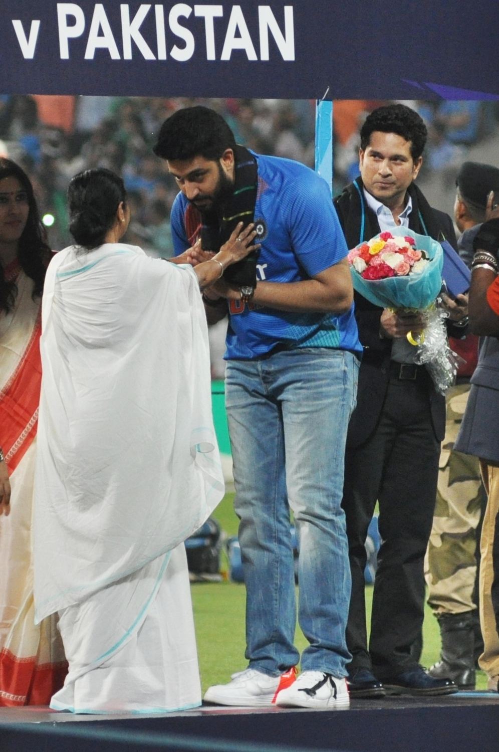 Kolkata: West Bengal Chief Minister Mamata Banerjee felicitates actor Abhishek Bachchan at a felicitation programme organised during the ICC WT20 2016 match between India and Pakistan at Eden Gardens in Kolkata on March 19, 2016. Also seen Indian cricket legend Sachin Tendulkar. (Photo: Kuntal Chakrabarty/IANS)