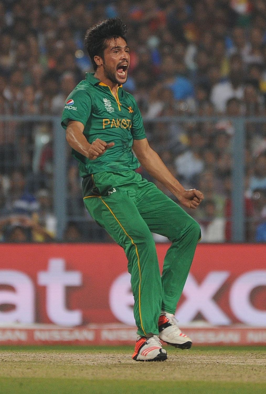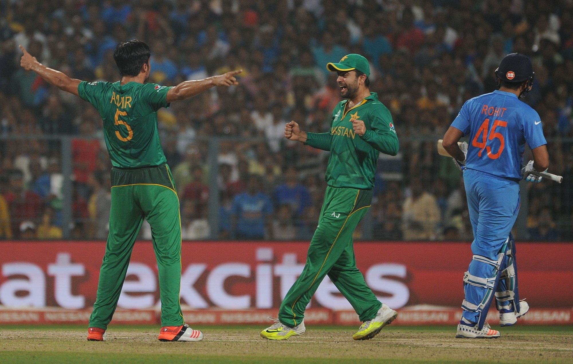 Kolkata: Pakistan bowler Mohammad Amir celebrate fall of a wicket during the ICC WT20 2016 match between India and Pakistan at Eden Gardens in Kolkata on March 19, 2016. (Photo: IANS)