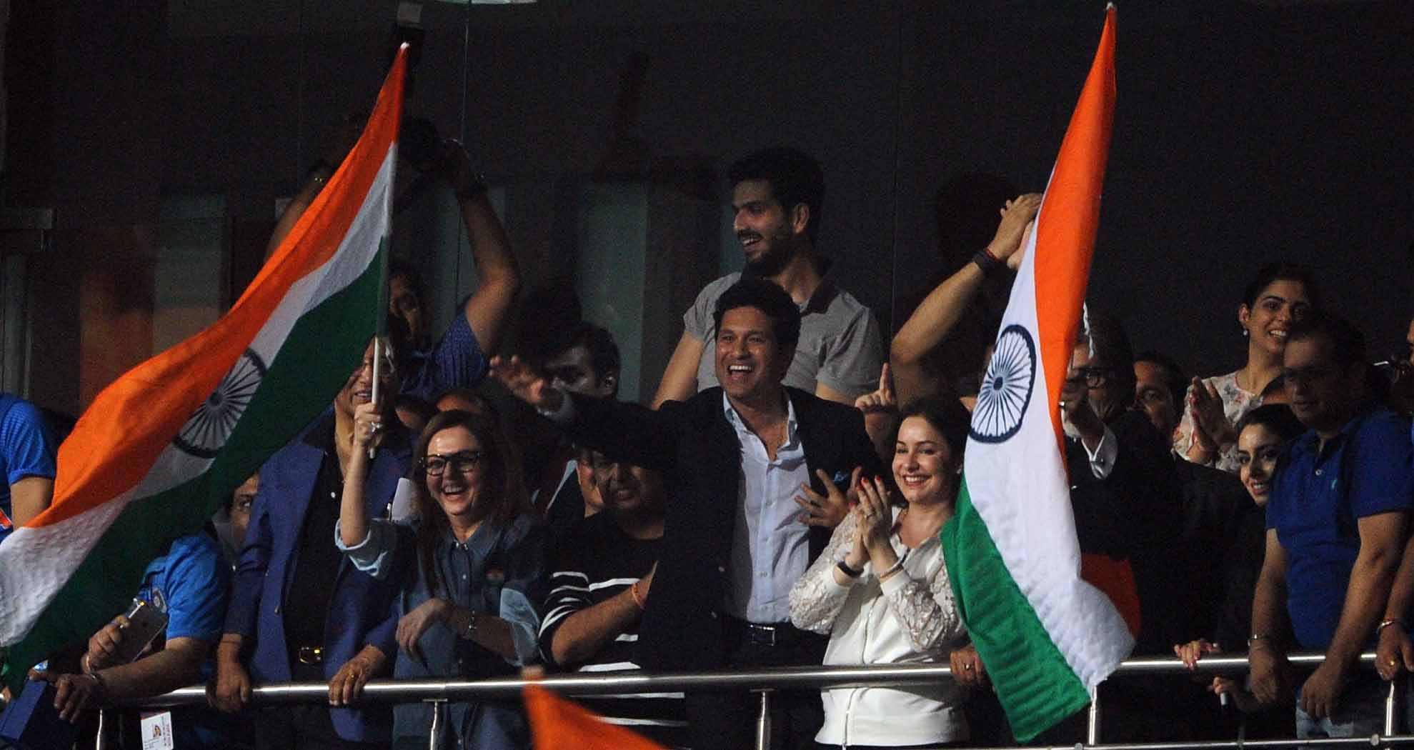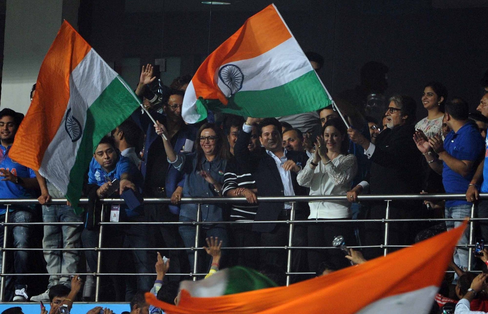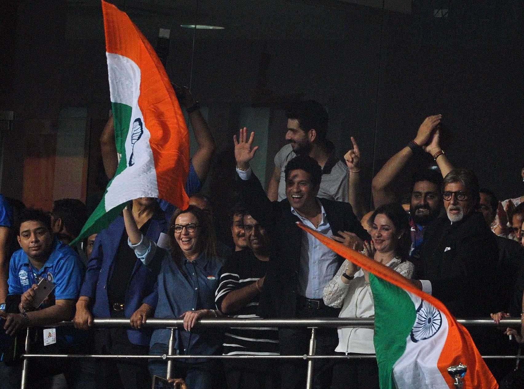 Kolkata: Former Indian cricketer Sachin Tendulkar and Megastar Amitabh Bachchan celebrates India`s win against Pakistan during the ICC WT20 2016 match between India and Pakistan at Eden Gardens in Kolkata on March 19, 2016. Also seen Reliance Foundation chairperson Nita Ambani. (Photo: IANS)