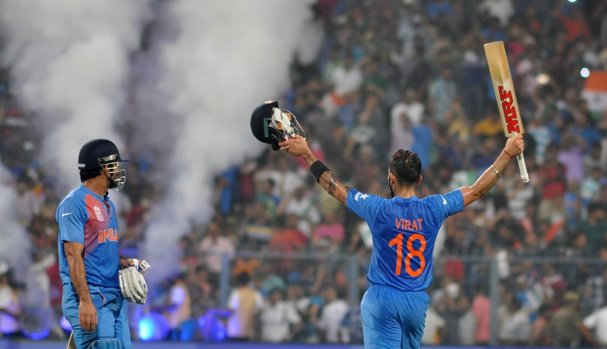 Kolkata: Indian batsmen Virat Kohli and MS Dhoni celebrates after winning the ICC WT20 2016 match against Pakistan at Eden Gardens in Kolkata on March 19, 2016. (Photo: IANS)