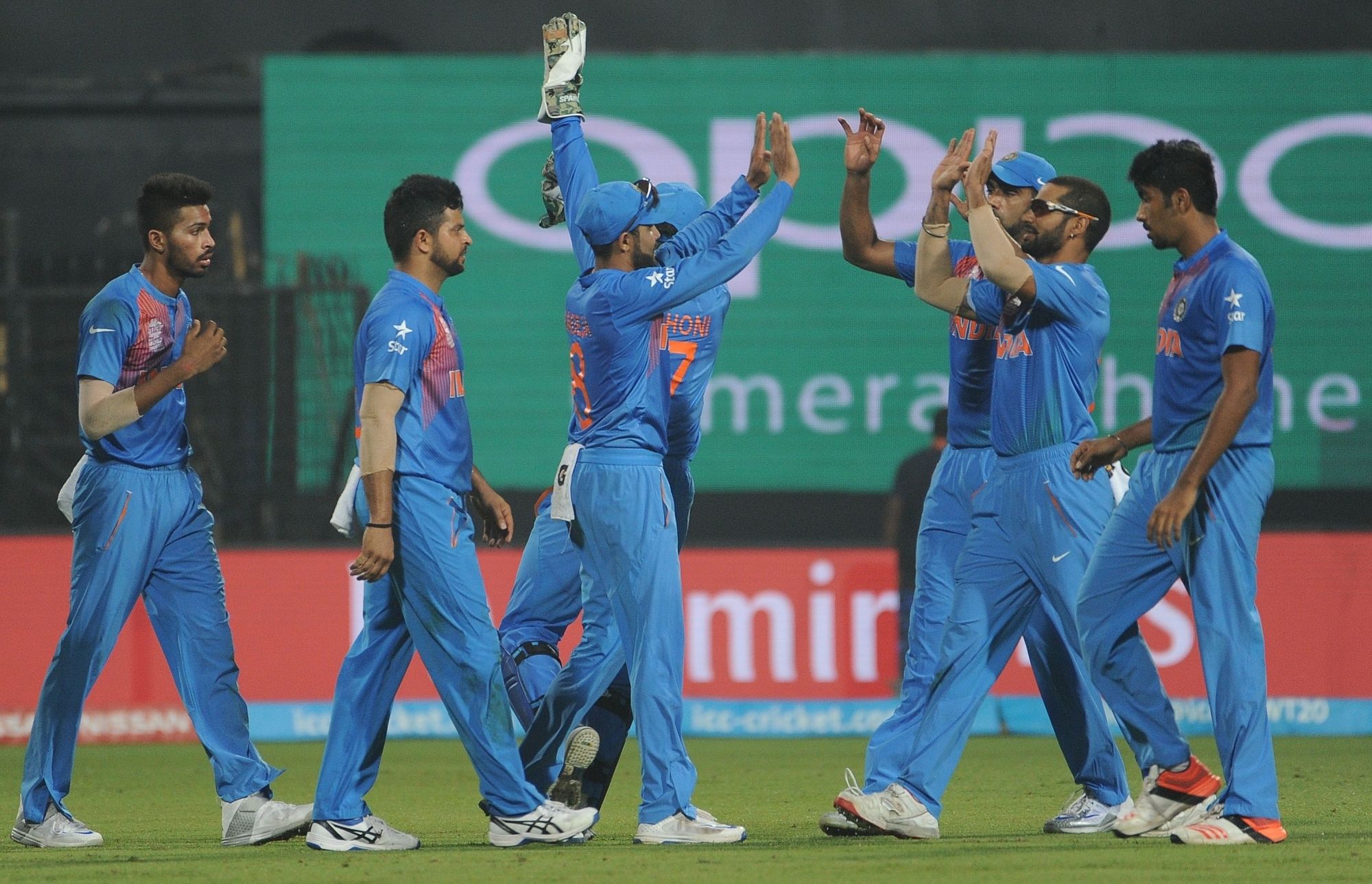 Kolkata: Indian players celebrate fall of a wicket during the ICC WT20 2016 match between India and Pakistan at Eden Gardens in Kolkata on March 19, 2016. (Photo: IANS)