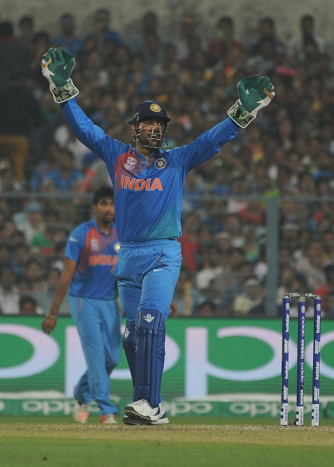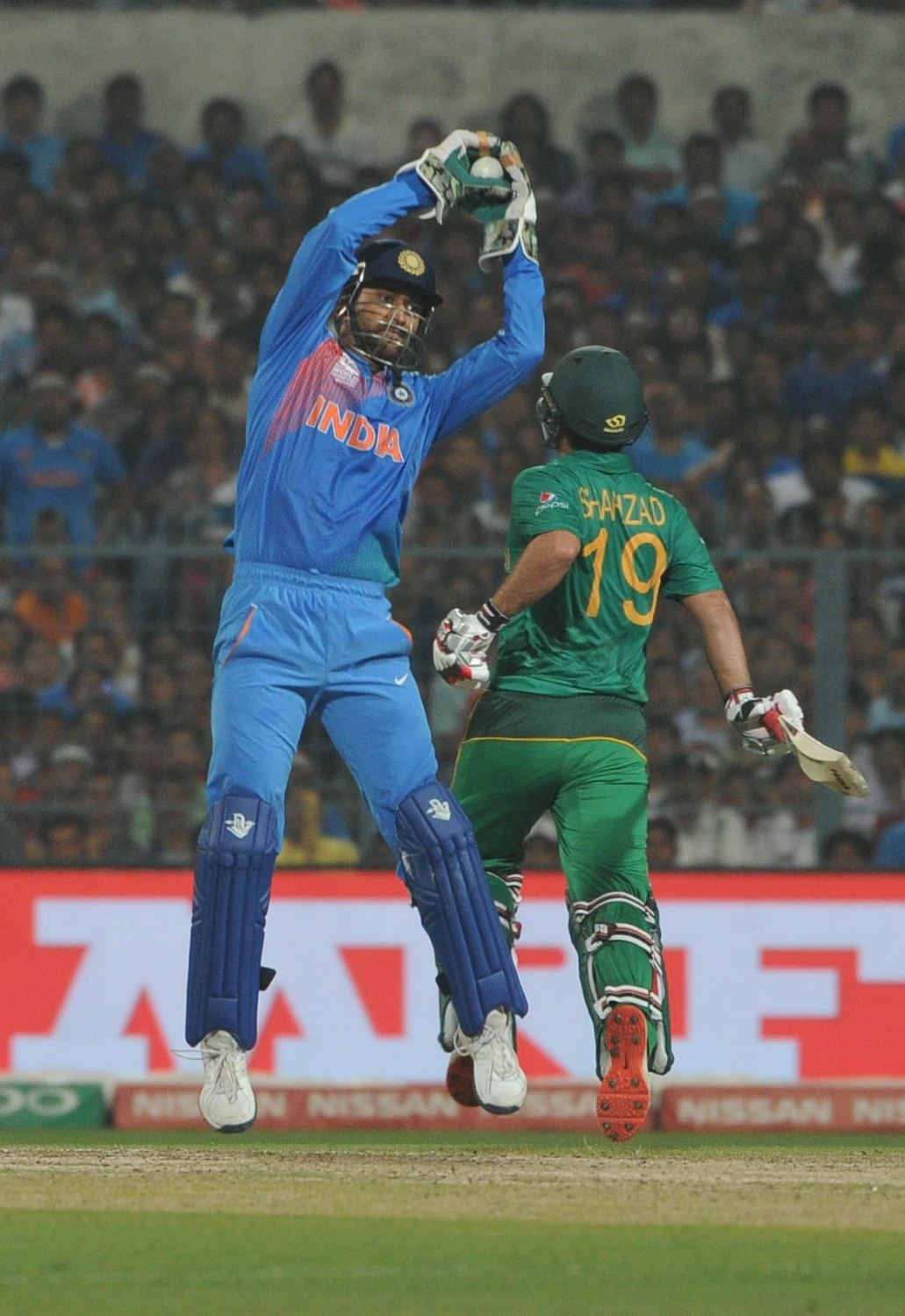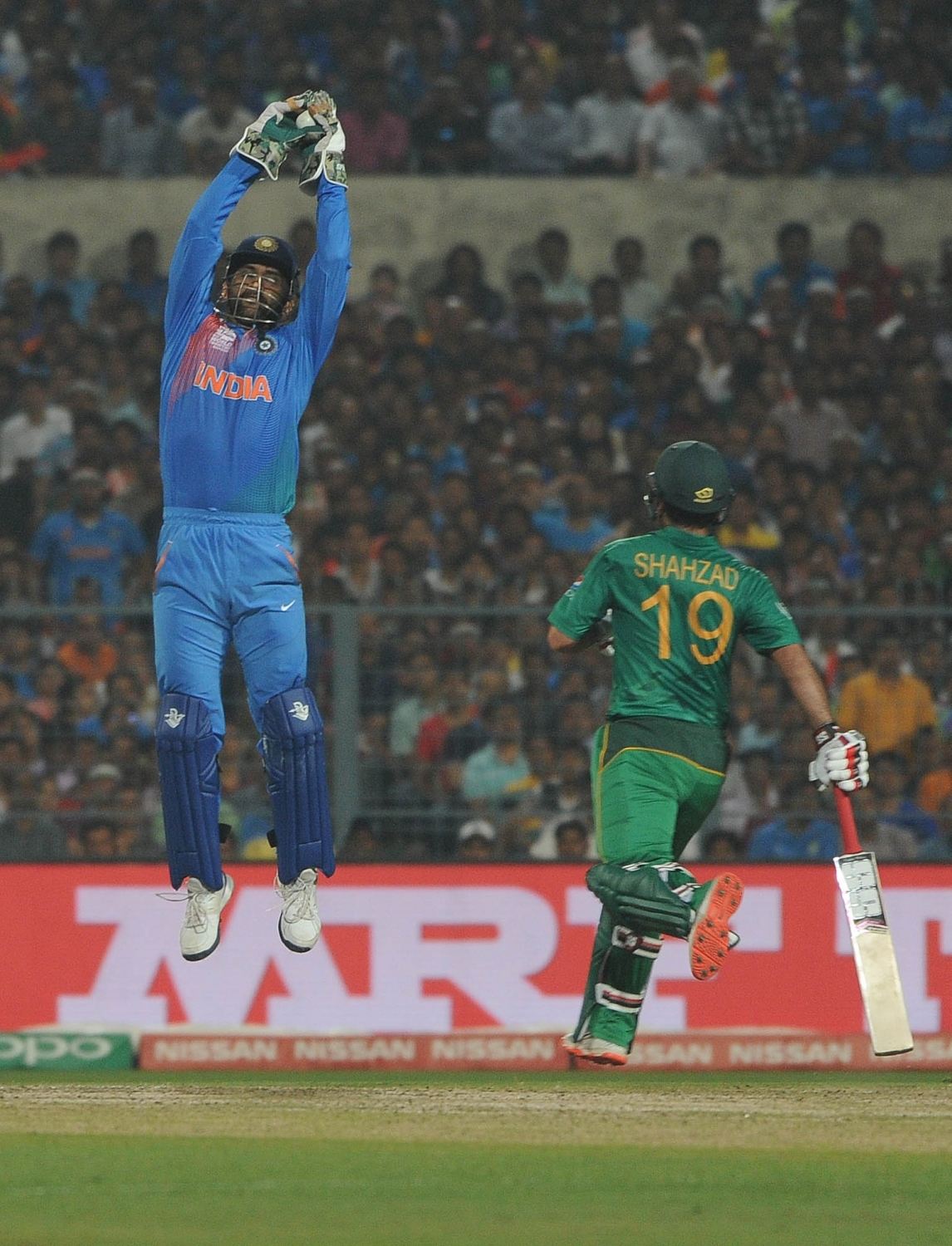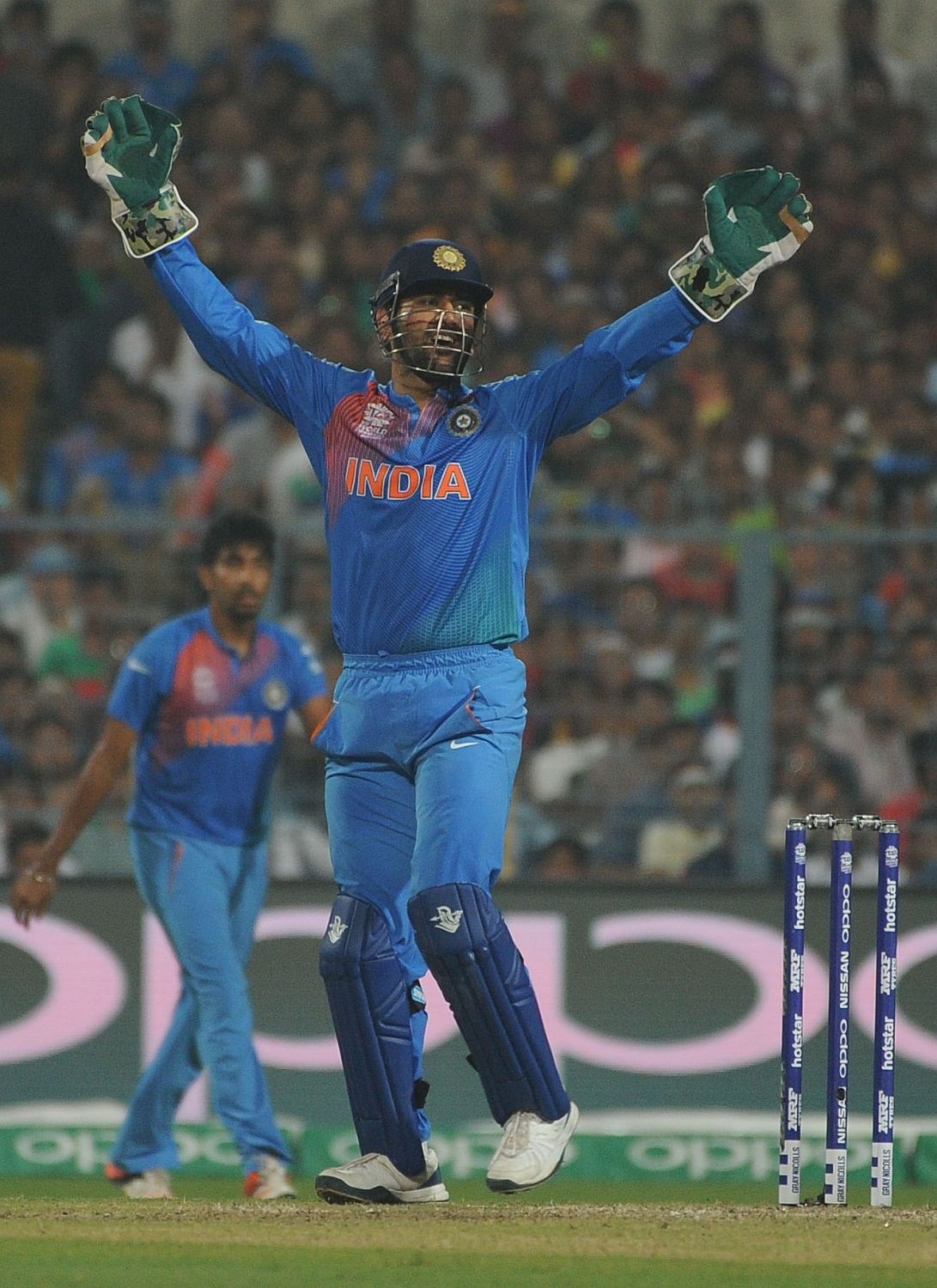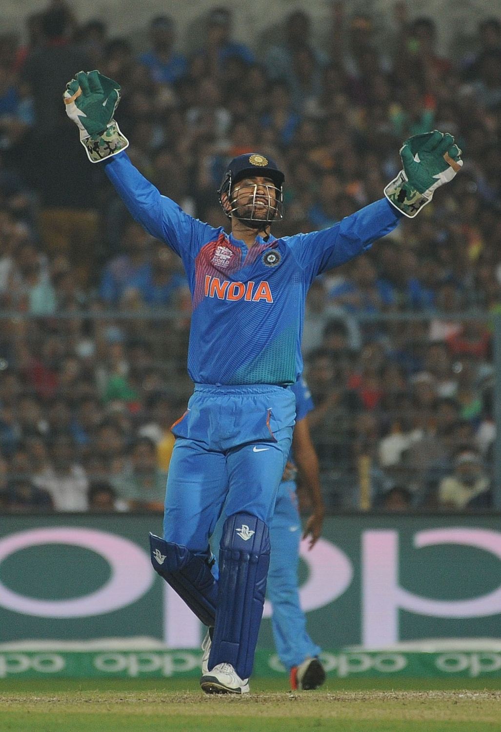 Kolkata: Indian cricket captain MS Dhoni celebrates fall of Umar Akmal’s wicket during the ICC WT20 2016 match between India and Pakistan at Eden Gardens in Kolkata on March 19, 2016. (Photo: IANS)