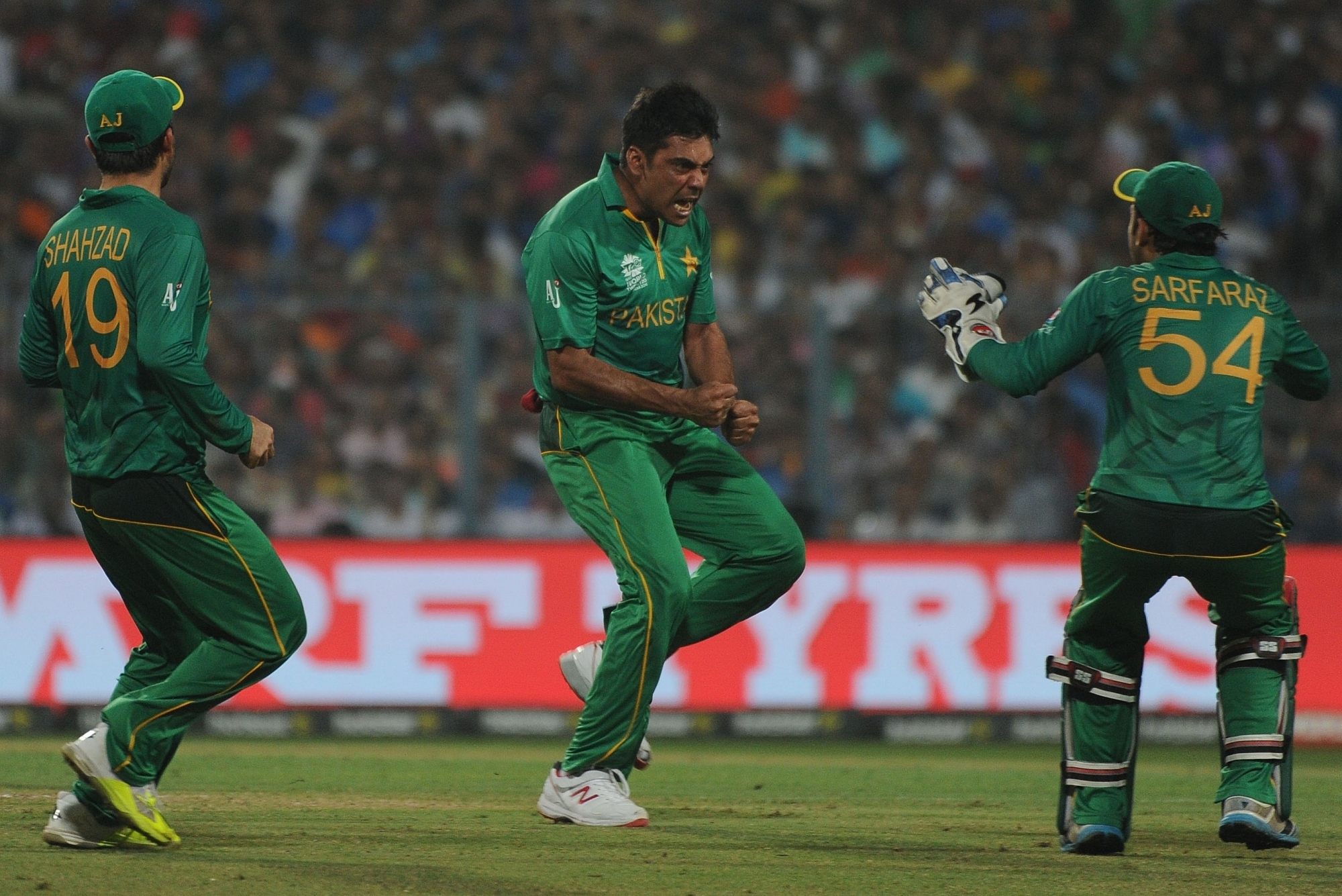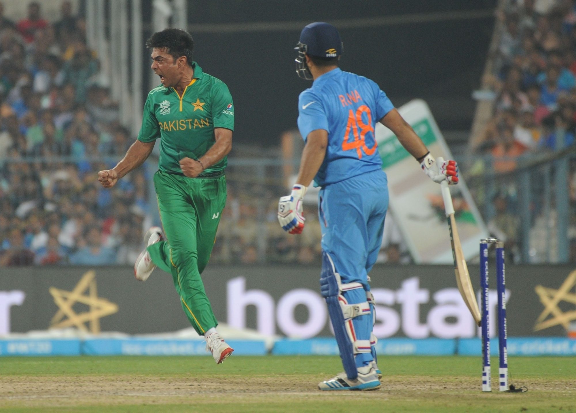 Kolkata: Pakistan bowler Mohammad Sami celebrate fall of a wicket during the ICC WT20 2016 match between India and Pakistan at Eden Gardens in Kolkata on March 19, 2016. (Photo: IANS)