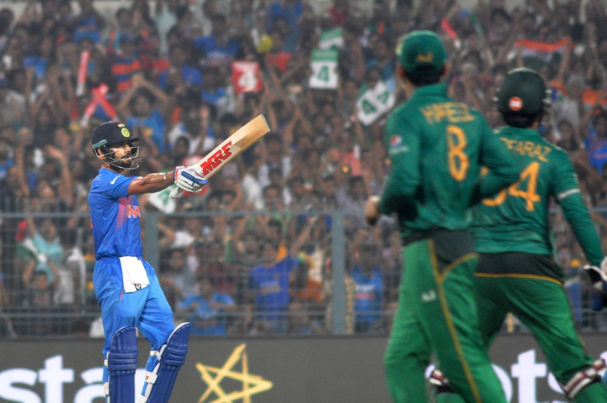 Kolkata: Indian batsman Virat Kohli celebrates his half century during the ICC WT20 2016 match between India and Pakistan at Eden Gardens in Kolkata on March 19, 2016. (Photo: Kuntal Chakrabarty/IANS)
