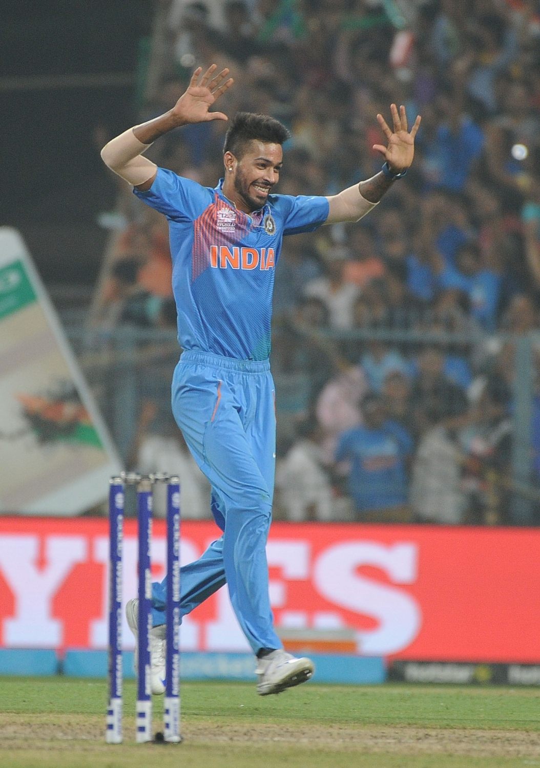 Kolkata: Indian player Hardik Pandya celebrate fall of a wicket during the ICC WT20 2016 match between India and Pakistan at Eden Gardens in Kolkata on March 19, 2016. (Photo: IANS)