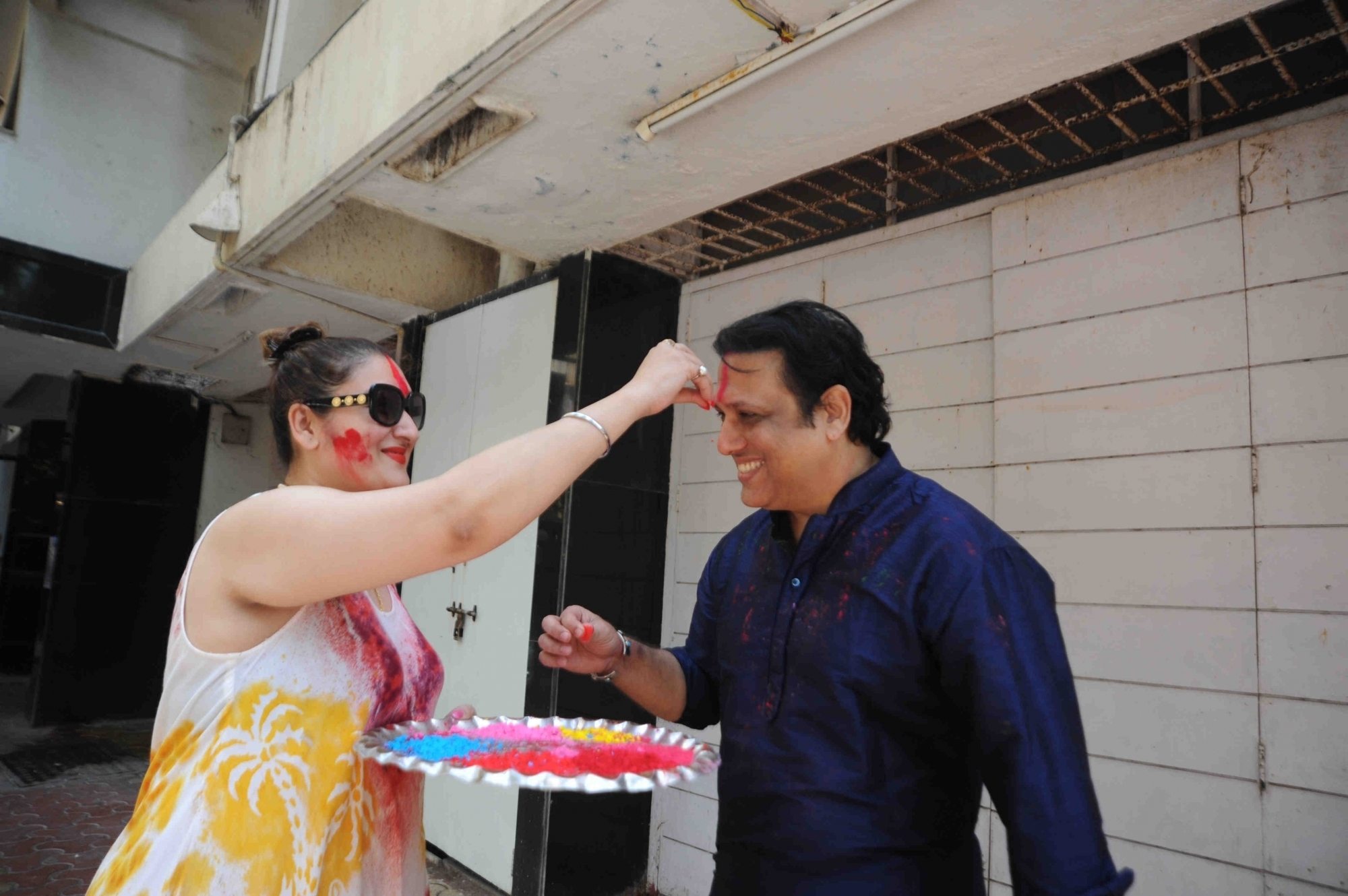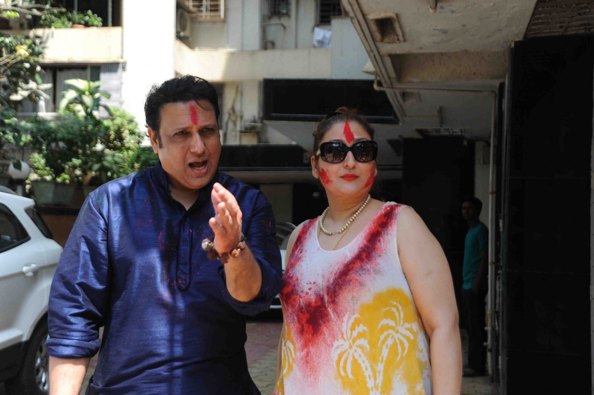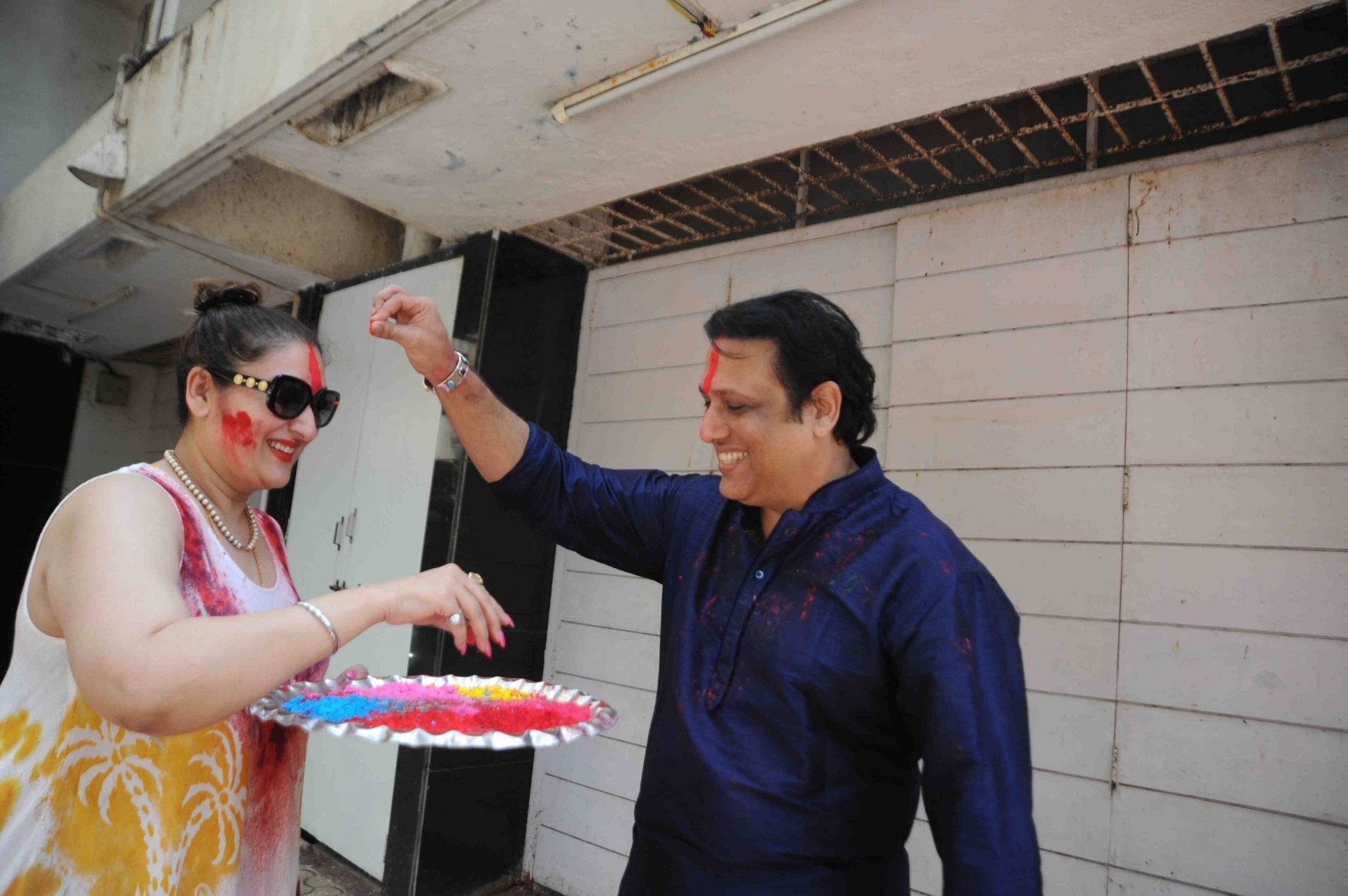 Mumbai: Actor Govinda celebrates Holi with his family at his residence in Mumbai on Thursday, March 24, 2016. (Photo: IANS)