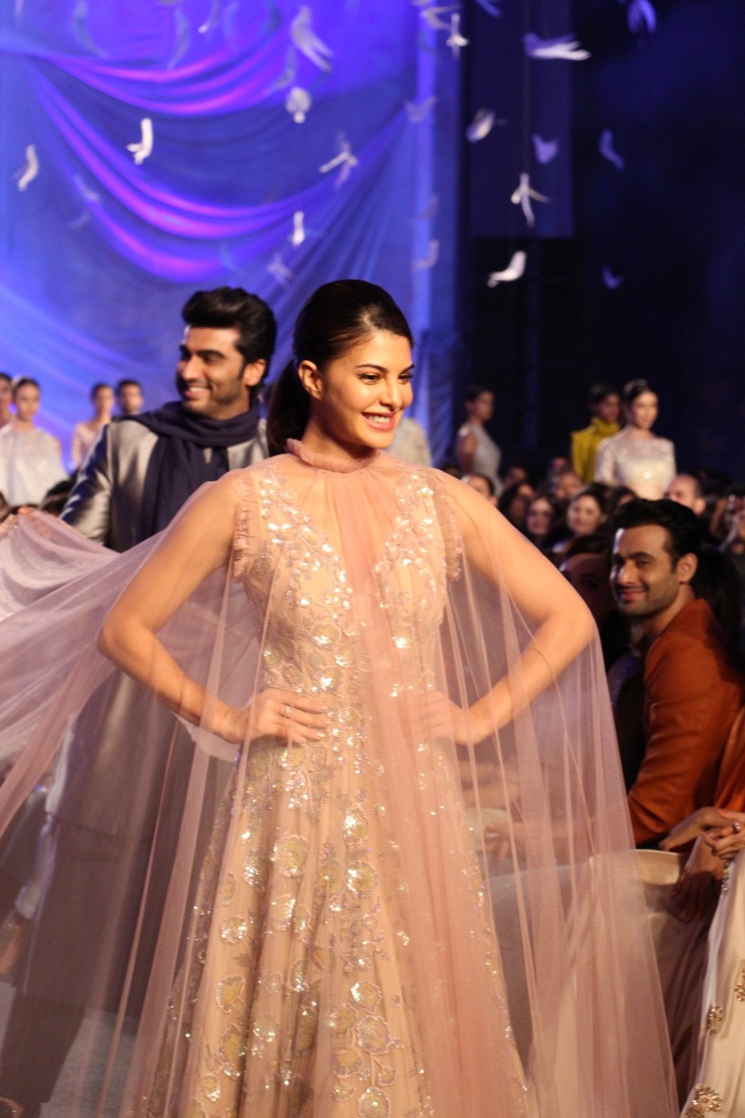 Mumbai: Actress Jacqueline Fernandez displays the creation of fashion designer Manish Malhotra during the opening show of Lakme Fashion Week Summer/Resort 2016, in Mumbai, on March 29, 2016. (Photo: IANS)