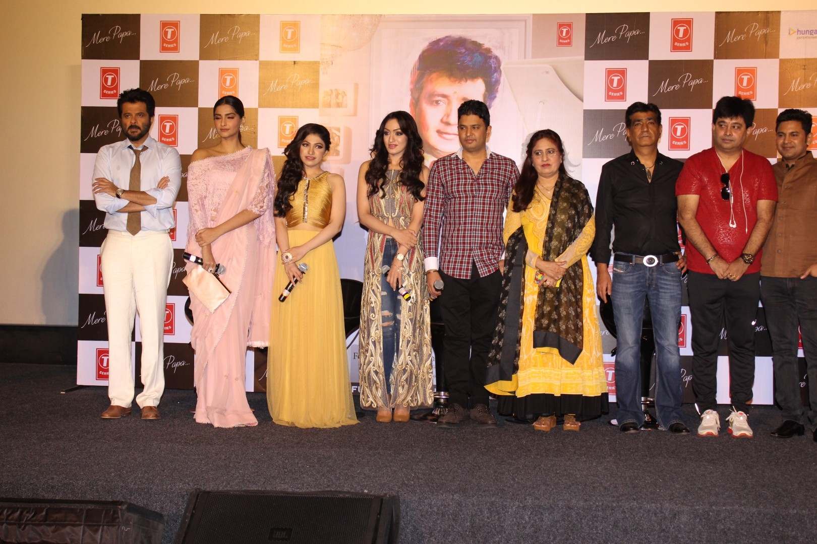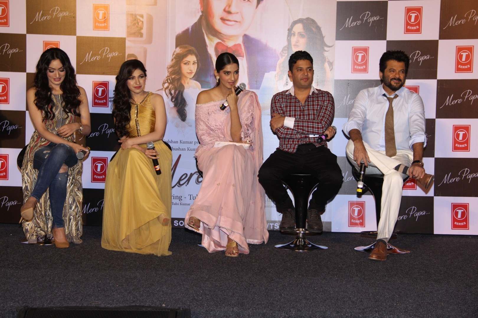 Mumbai: Actors Anil Kapoor, Sonam Kapoor, Filmmaker Bhushan Kumar Singer Tulsi Kumar and Fashion designer Khushali Kumar during the launch of music video Mere Papa by Khushali and Tulsi Kumar in Mumbai on April 1, 2016 (Photo: IANS)