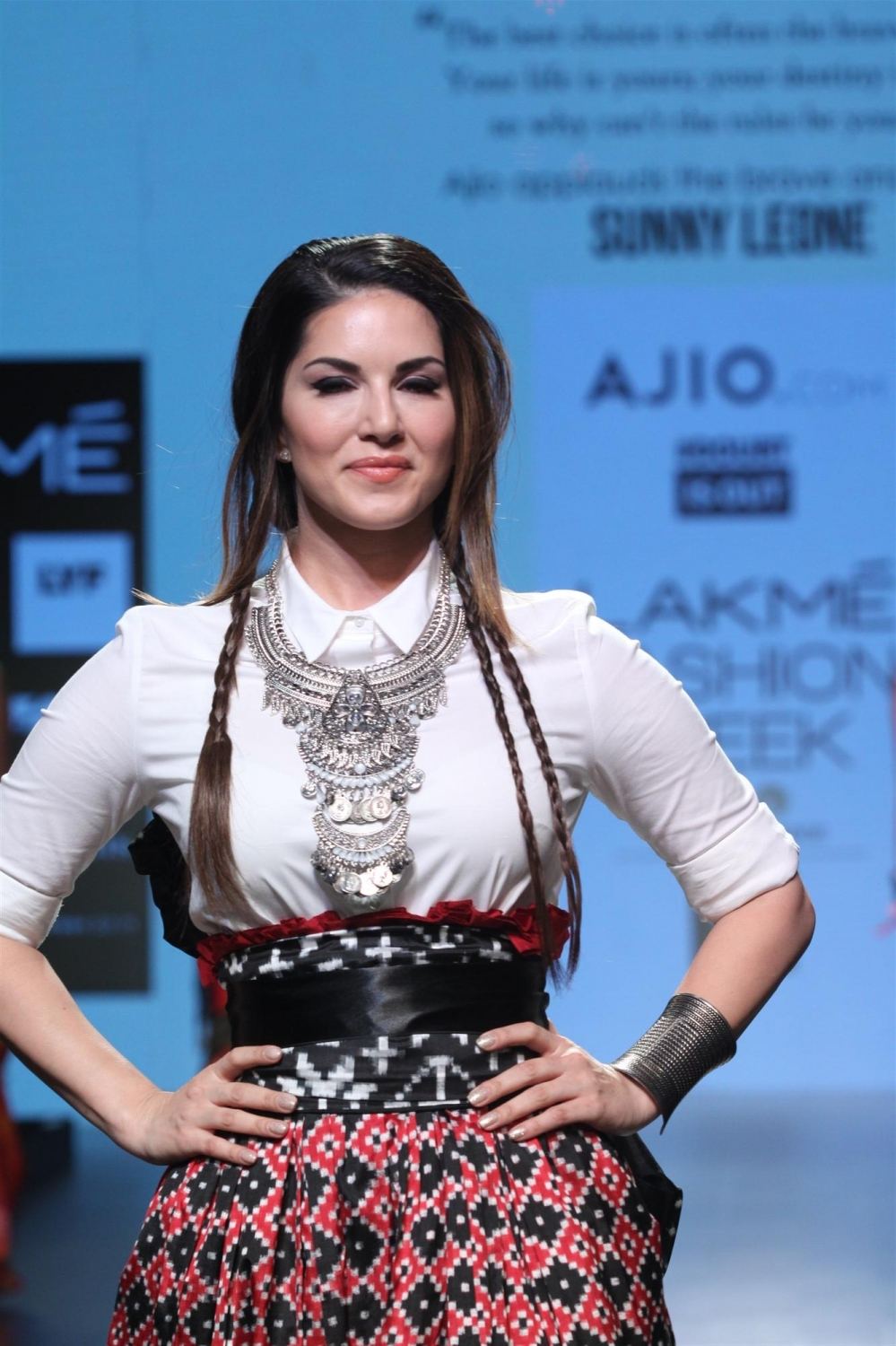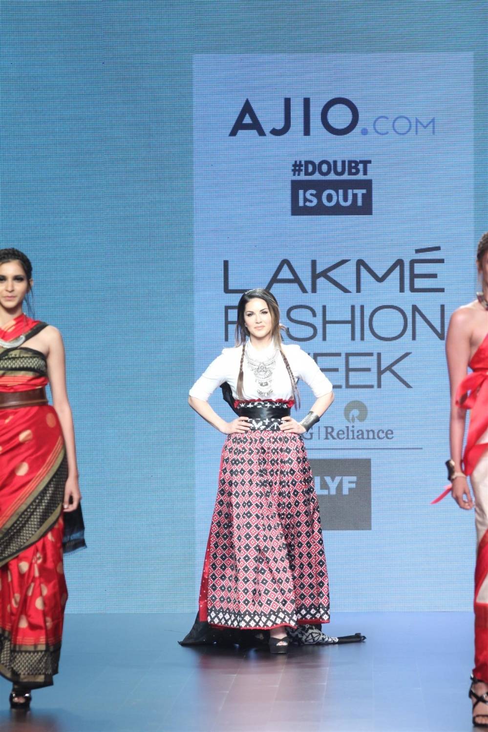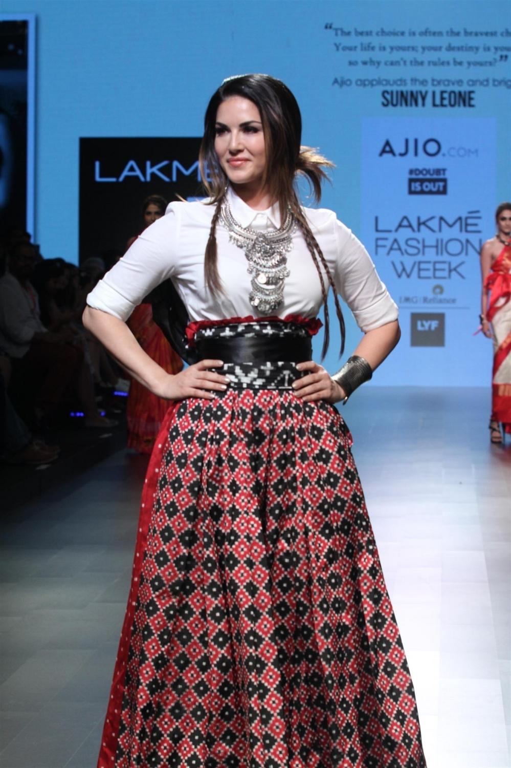 Mumbai: Actress Sunny Leone displays the creation of fashion brand DoubtIsOut during the Lakme Fashion Week Summer Resort 2016 in Mumbai on Friday, April 2, 2016 (Photo: IANS)