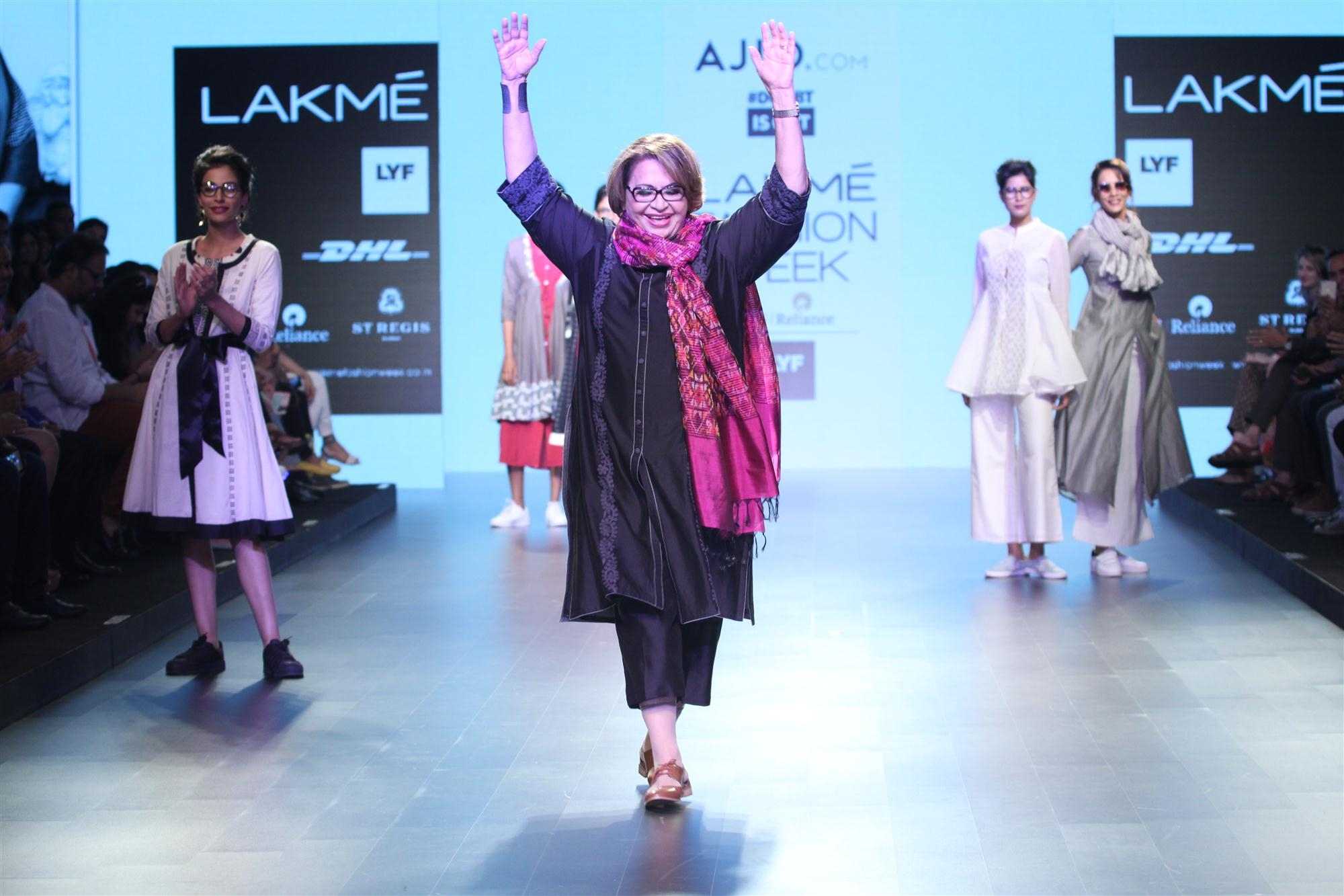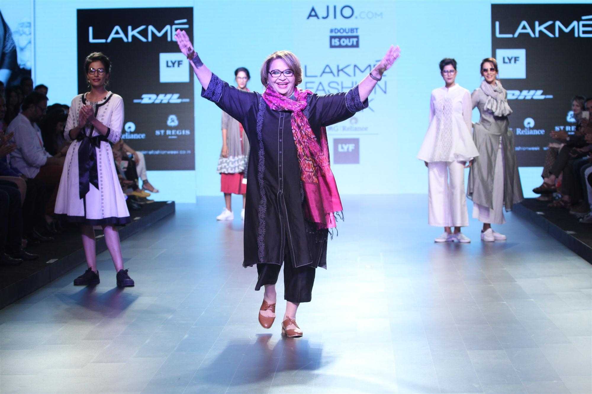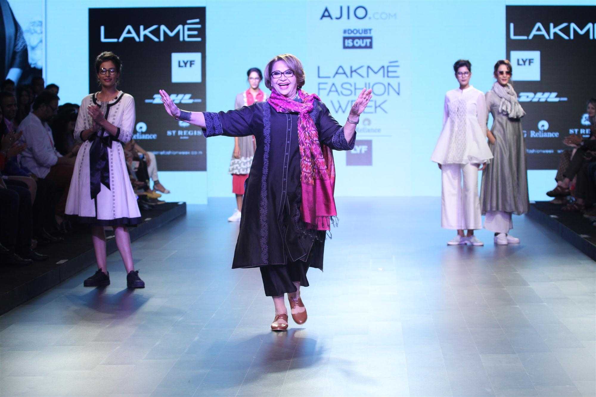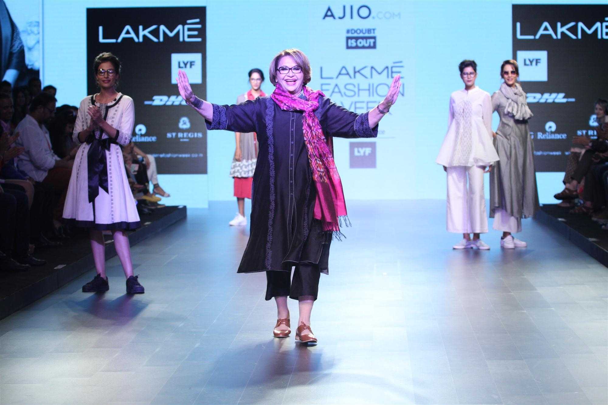 Mumbai: Actress Helen displays the creation of fashion brand DoubtIsOut during the Lakme Fashion Week Summer Resort 2016 in Mumbai on Friday, April 2, 2016 (Photo: IANS)