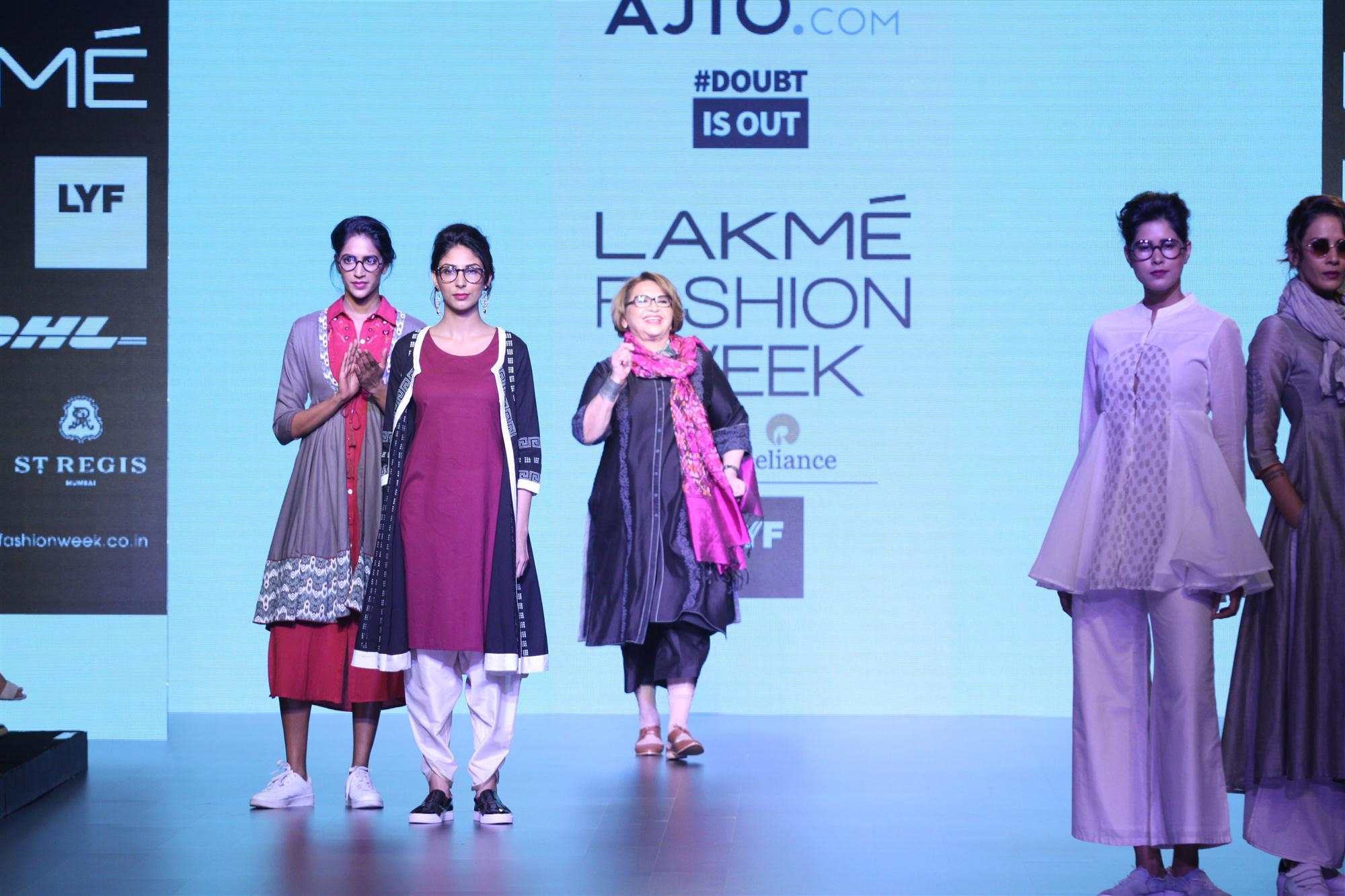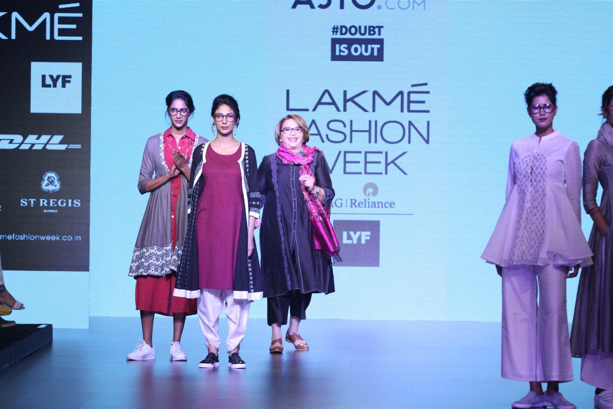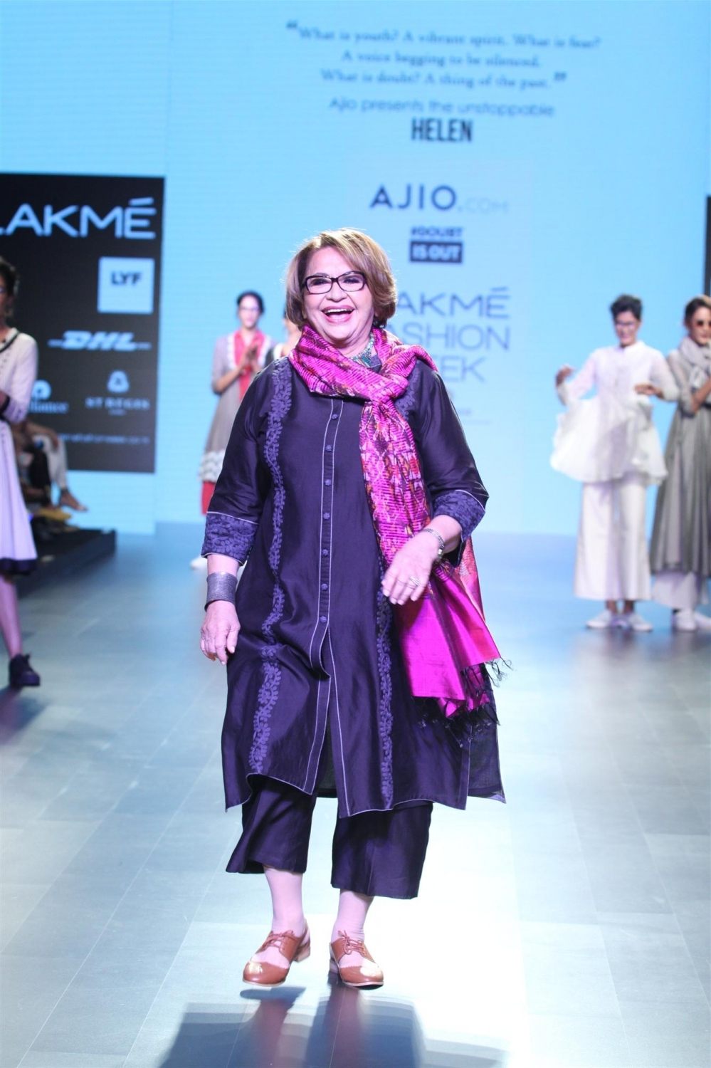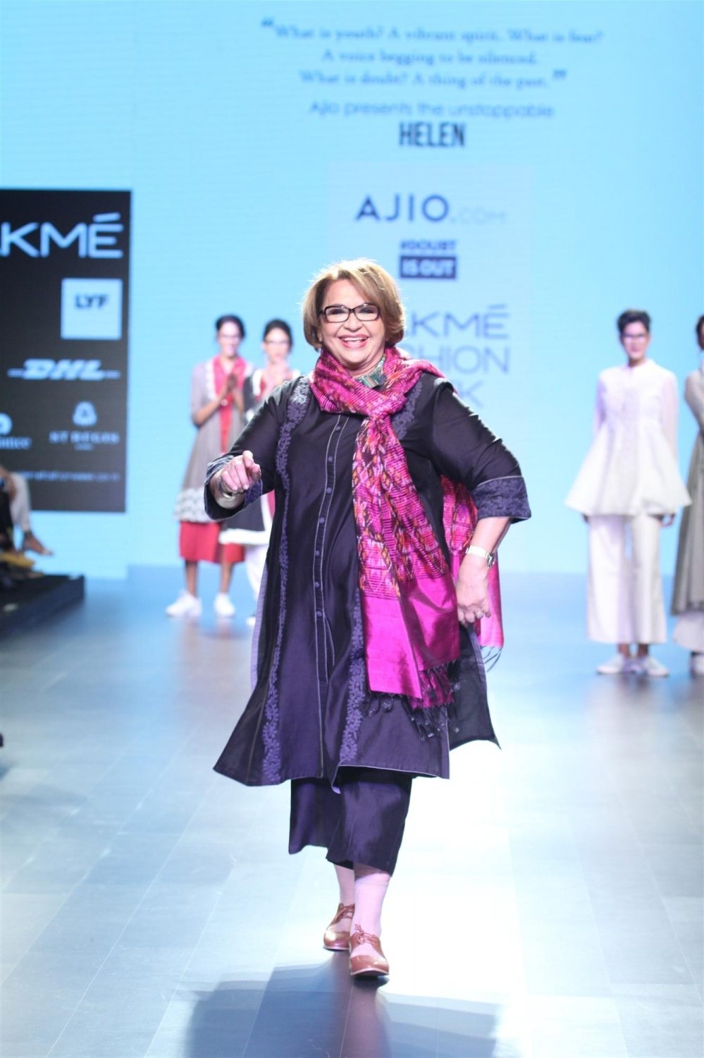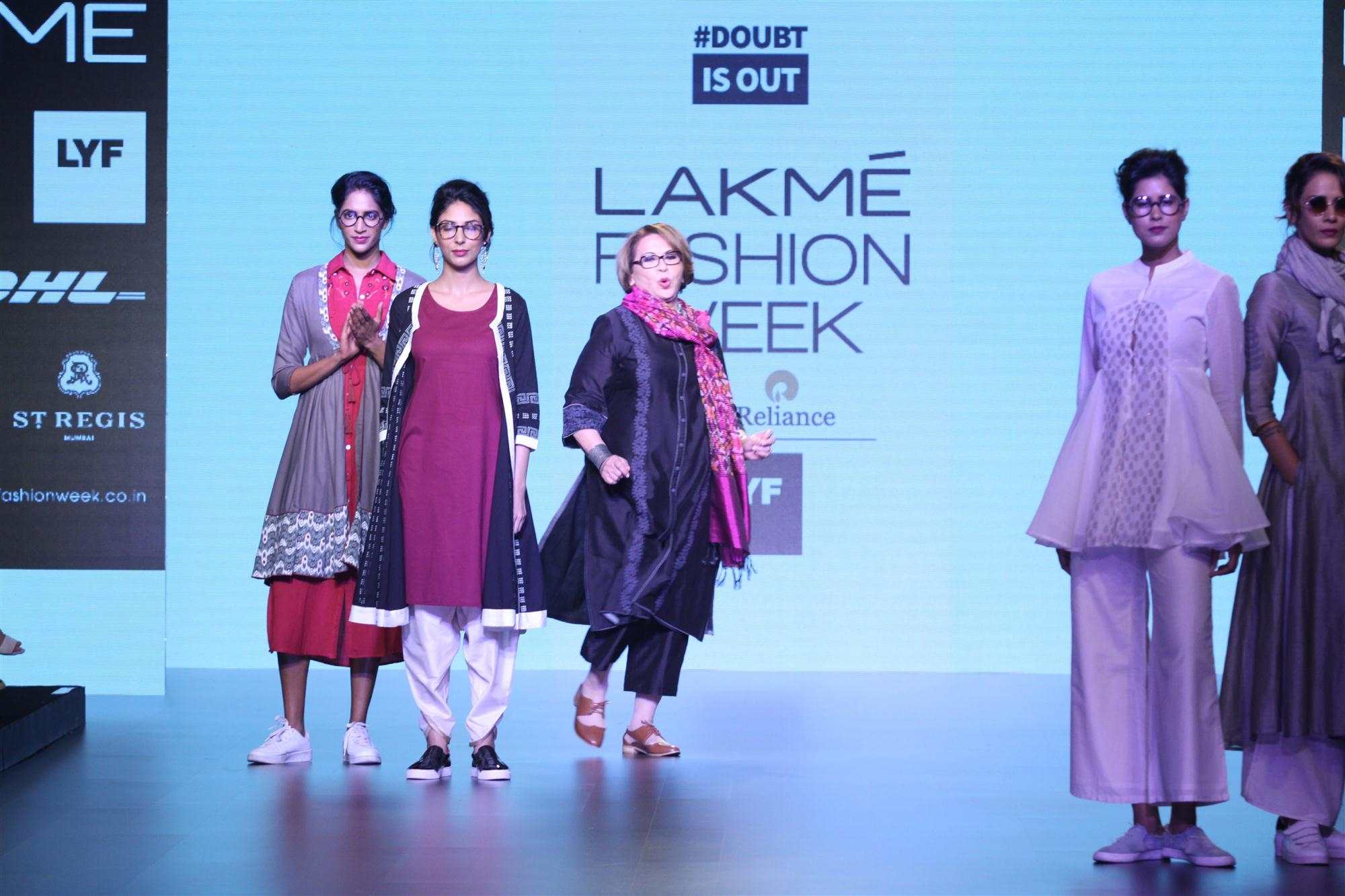 Mumbai: Actress Helen displays the creation of fashion brand DoubtIsOut during the Lakme Fashion Week Summer Resort 2016 in Mumbai on Friday, April 2, 2016 (Photo: IANS)