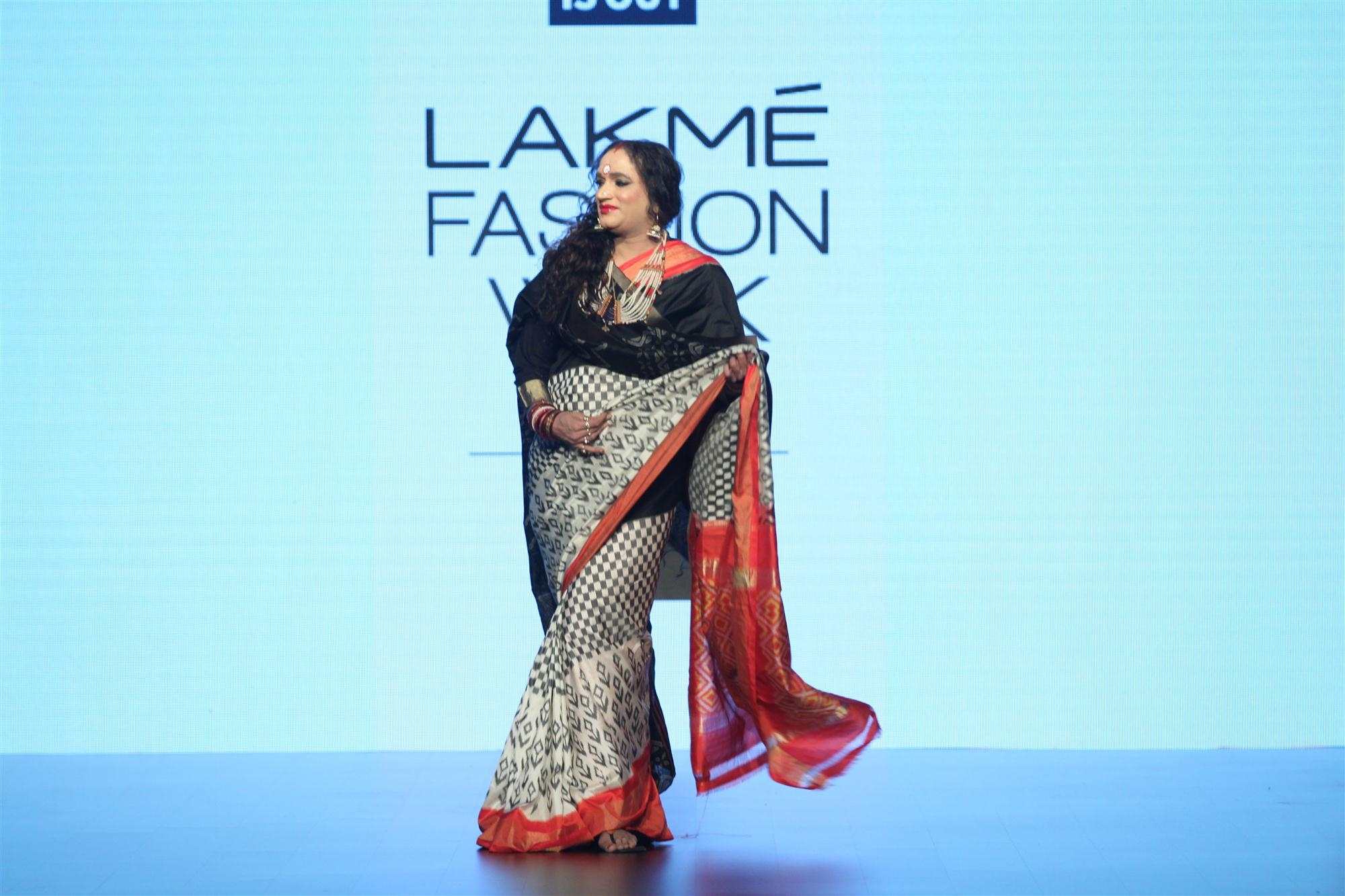 Mumbai: Transgender activist Laxmi Narayan Tripathi displays the creation of fashion brand DoubtIsOut during the Lakme Fashion Week Summer Resort 2016 in Mumbai on Friday, April 2, 2016 (Photo: IANS)