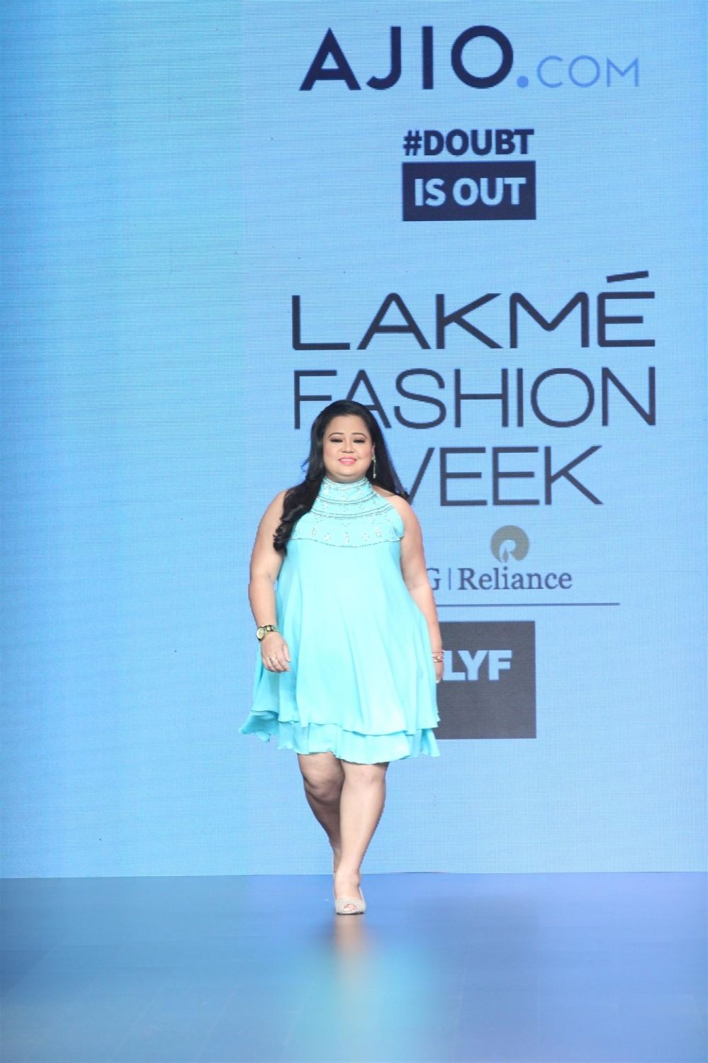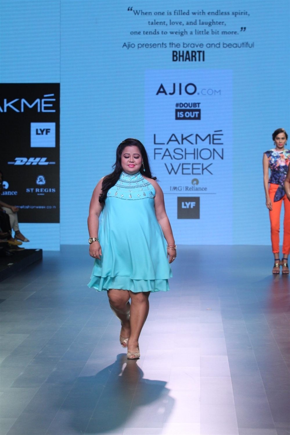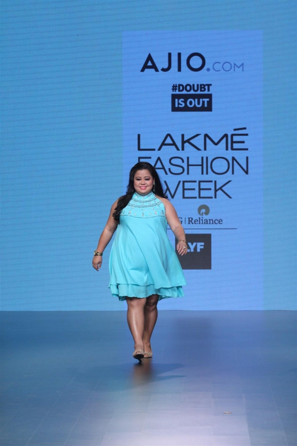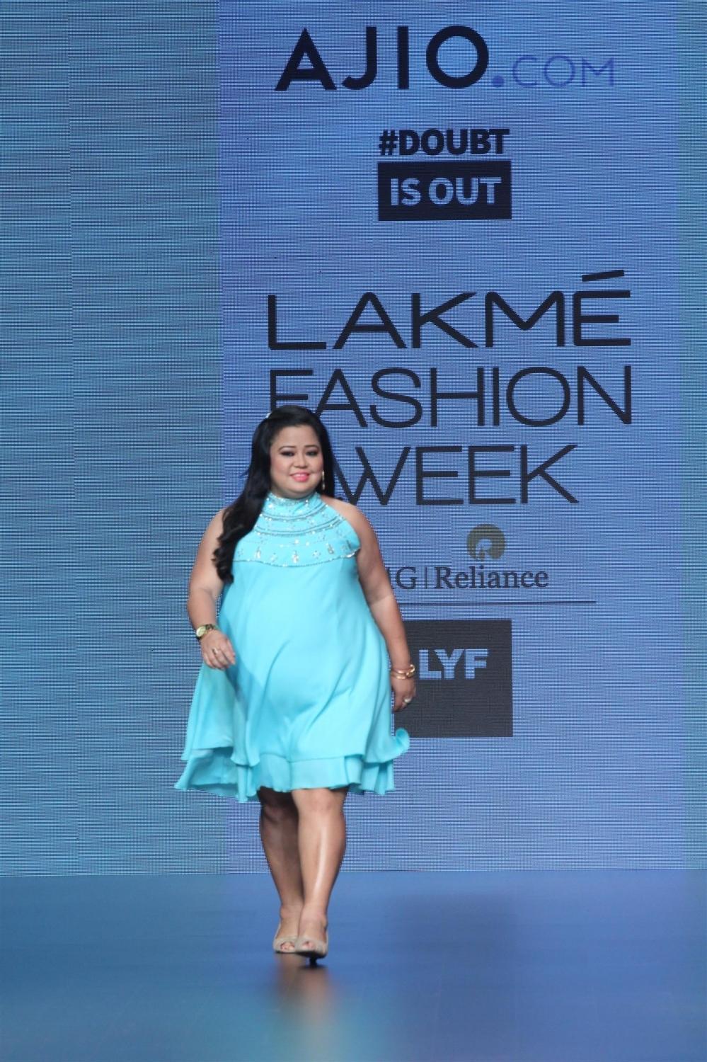 Mumbai: Stand-up comedian Bharti Singh displays the creation of fashion brand DoubtIsOut during the Lakme Fashion Week Summer Resort 2016 in Mumbai on Friday, April 2, 2016 (Photo: IANS)
