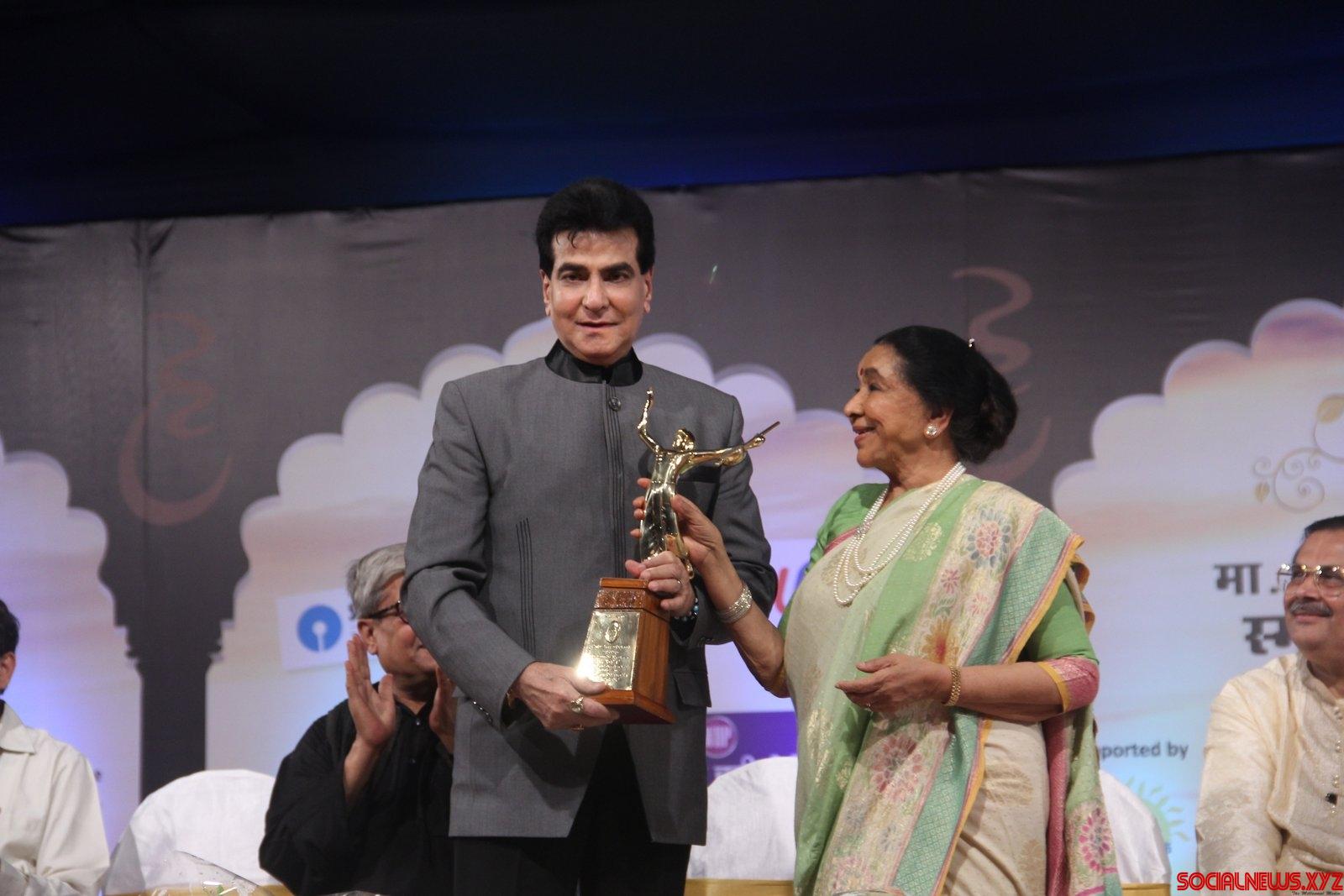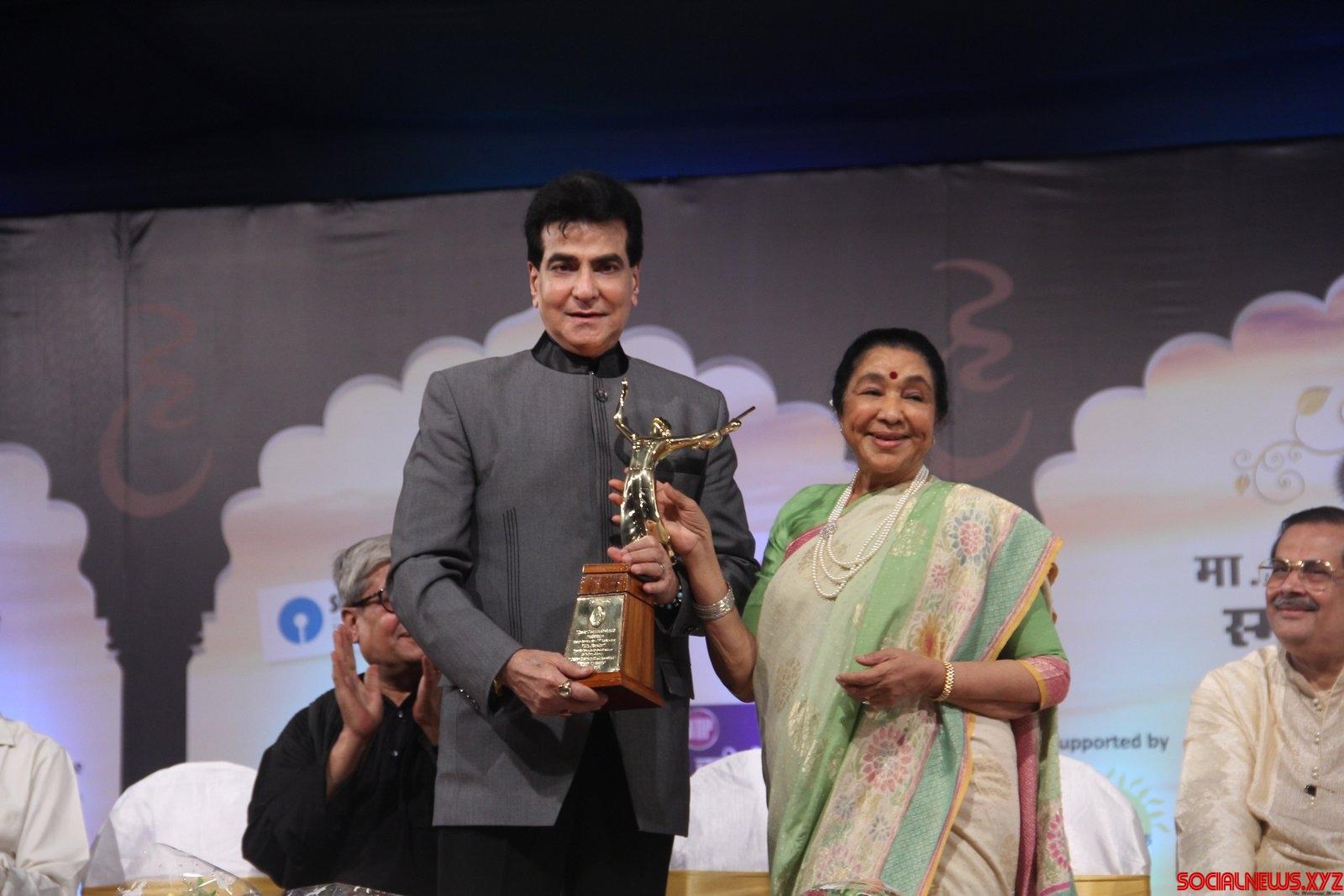 Mumbai: Singer Asha Bhosle presents the award to actor Jeetendra during the 74th Master Dinanath Mangeshkar Awards 2016 in Mumbai, on April 24, 2016. (Photo: IANS)