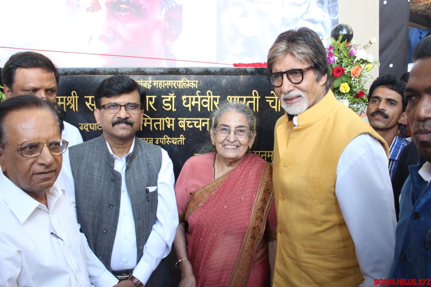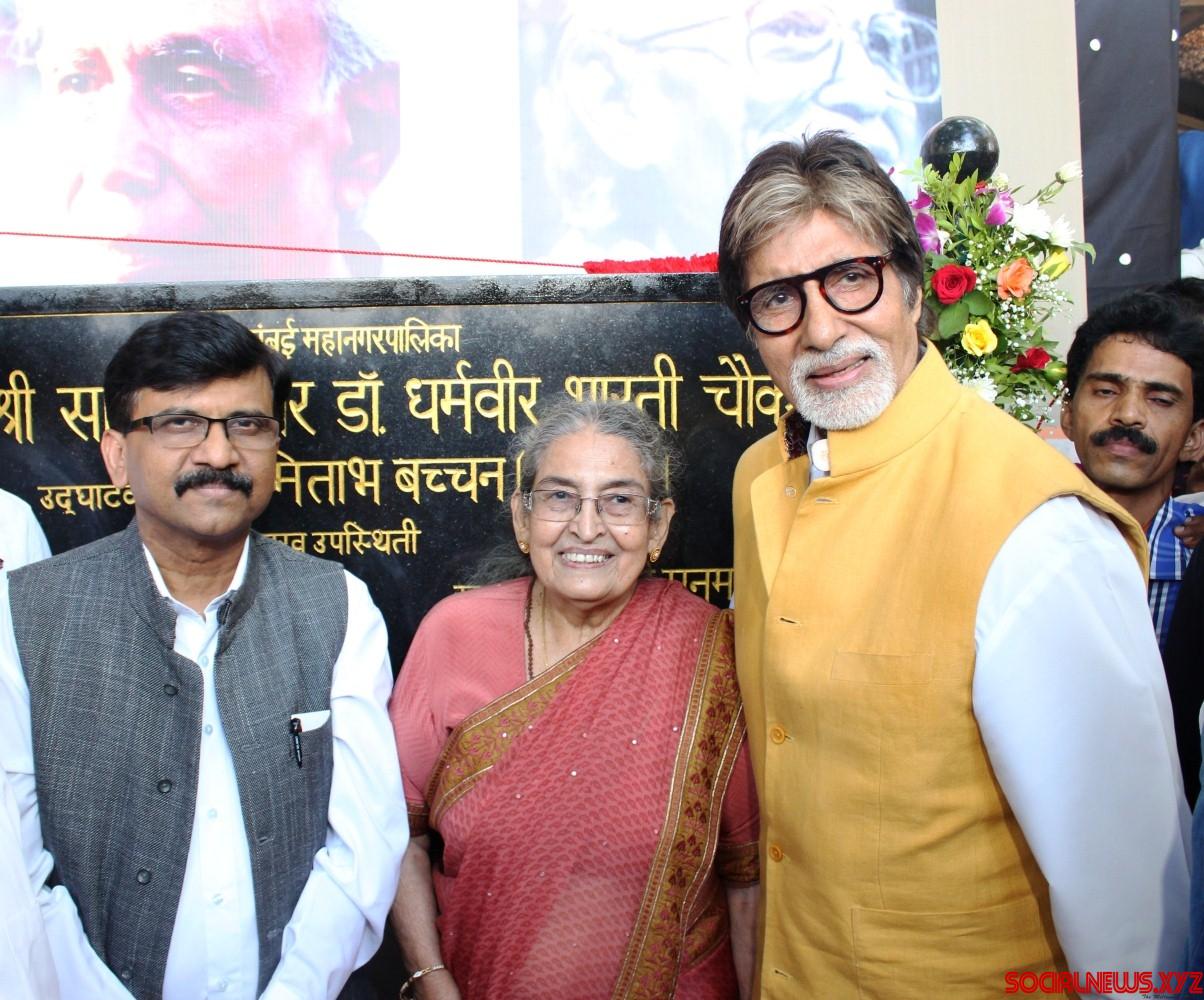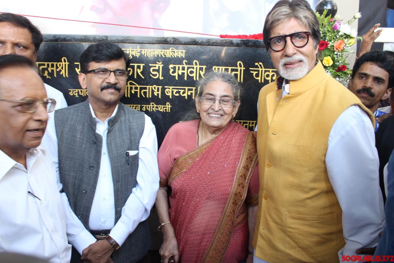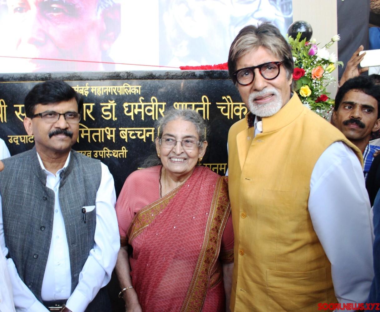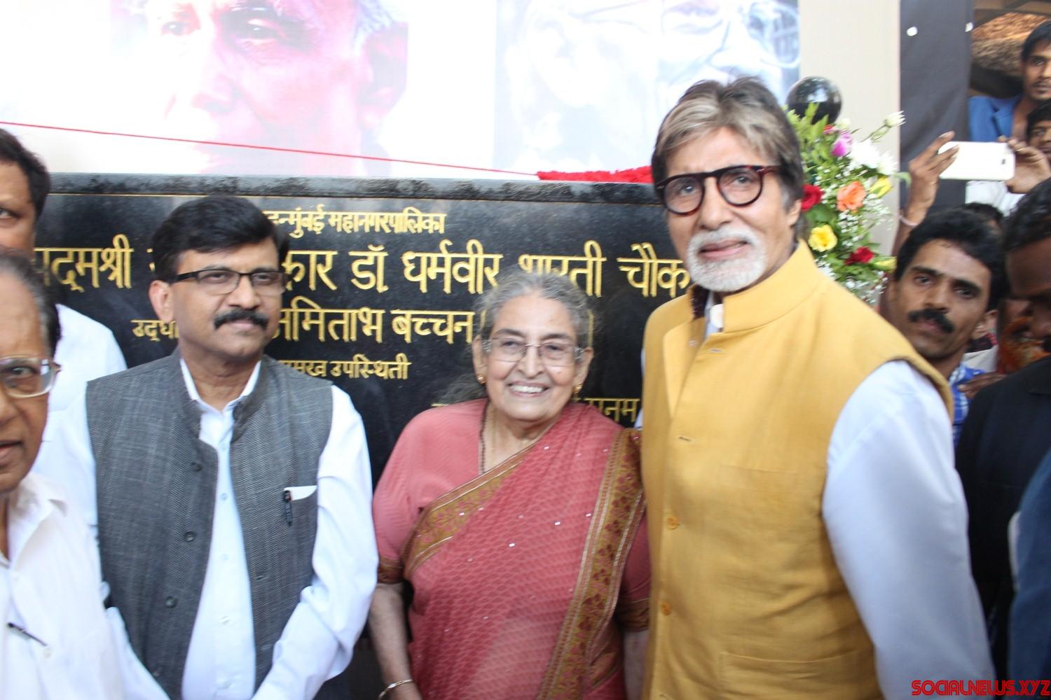 Mumbai: Actor Amitabh Bachchan (2R) with author and writer Pushpa Bharati, and Shiv Sena MP Sanjay Raut (L) during the naming of a street junction after renowned Hindu author-journalist Dharamvir Bharati, at Bandra in Mumbai, on April 30, 2016. Late Dharamvir Bharati and Late Harivansh Rai Bachchan, father of Amitabh Bachchan, had a long association with eachother right from their teaching day in Allahabad University. (Photo: IANS)