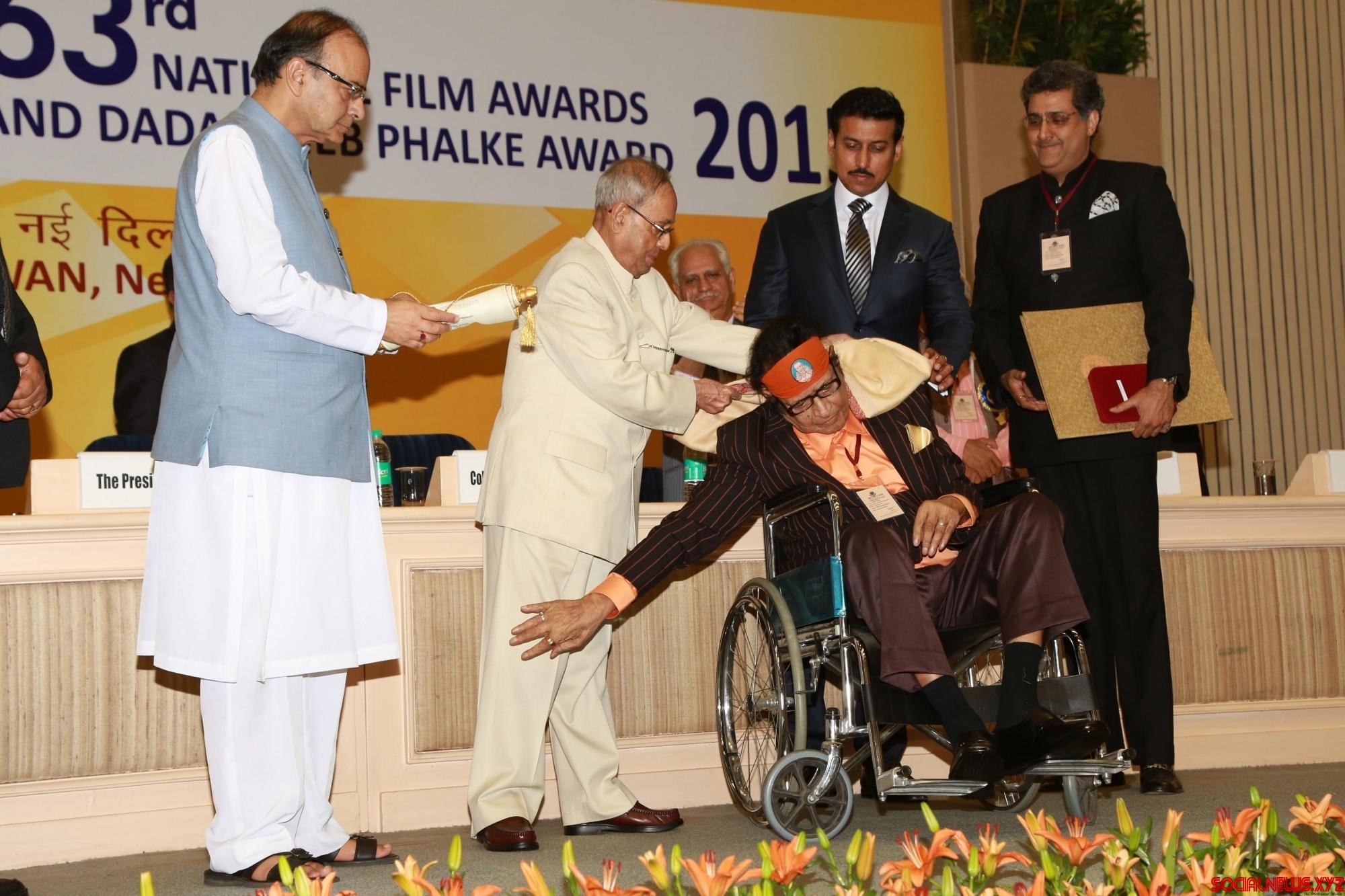 New Delhi: Veteran film actor and director Manoj Kumar receives the 47th Dadasaheb Phalke Award from President Pranab Mukherjee during the 63rd National Film Awards ceremony at Vigyan Bhawan in New Delhi, on May 3, 2016. (Photo: Amlan Paliwal/IANS)