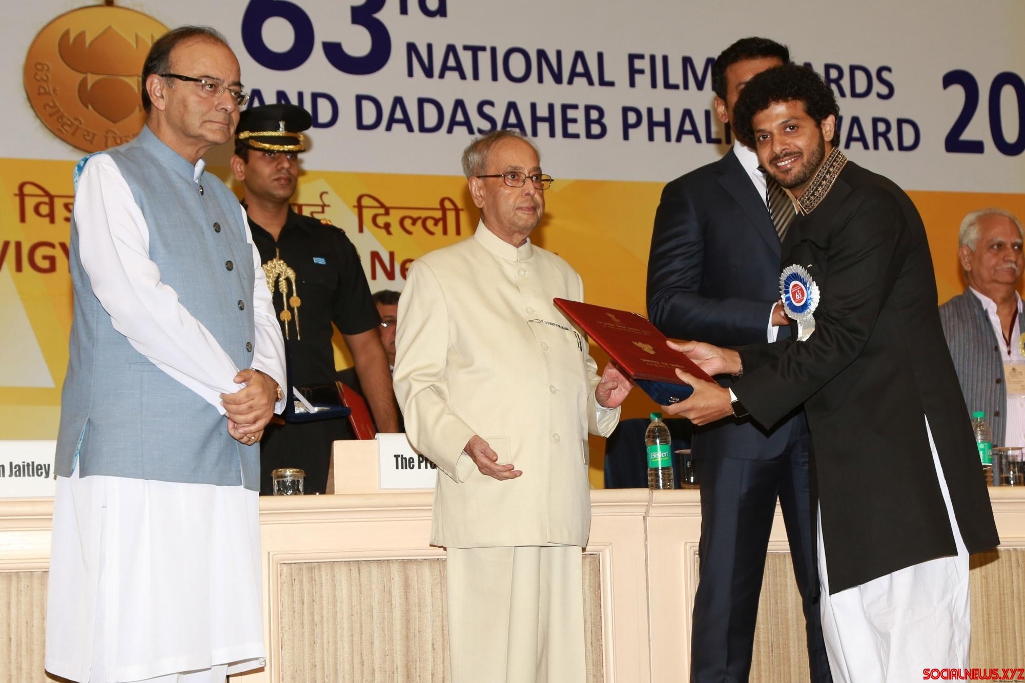 New Delhi: Filmmaker Vishal Bhardwaj receives the Best Screenplay Writer (adapted) Award for “Talvar” from President Pranab Mukherjee during the 63rd National Film Awards ceremony at Vigyan Bhawan in New Delhi, on May 3, 2016. (Photo: Amlan Paliwal/IANS)