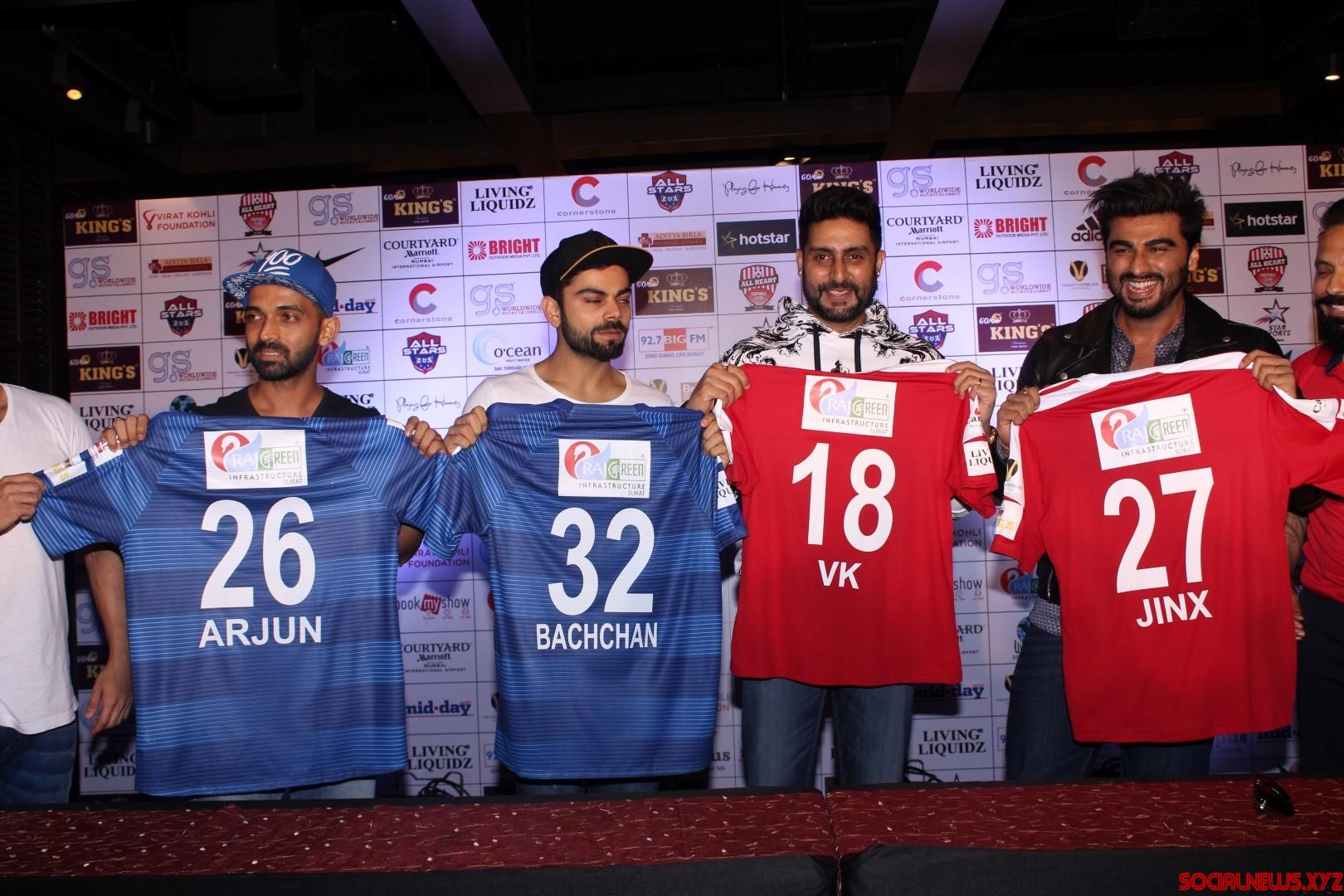 Mumbai: Indian cricketers Ajinkya Rahane, Virat Kohli, actors Abhishek Bachchan and Arjun Kapoor during the official jersey launch of celebrity Clasico 2016 by Virat Kohli Foundation and Playing for Humanity in Mumbai, on June 3, 2016. (Photo: IANS)